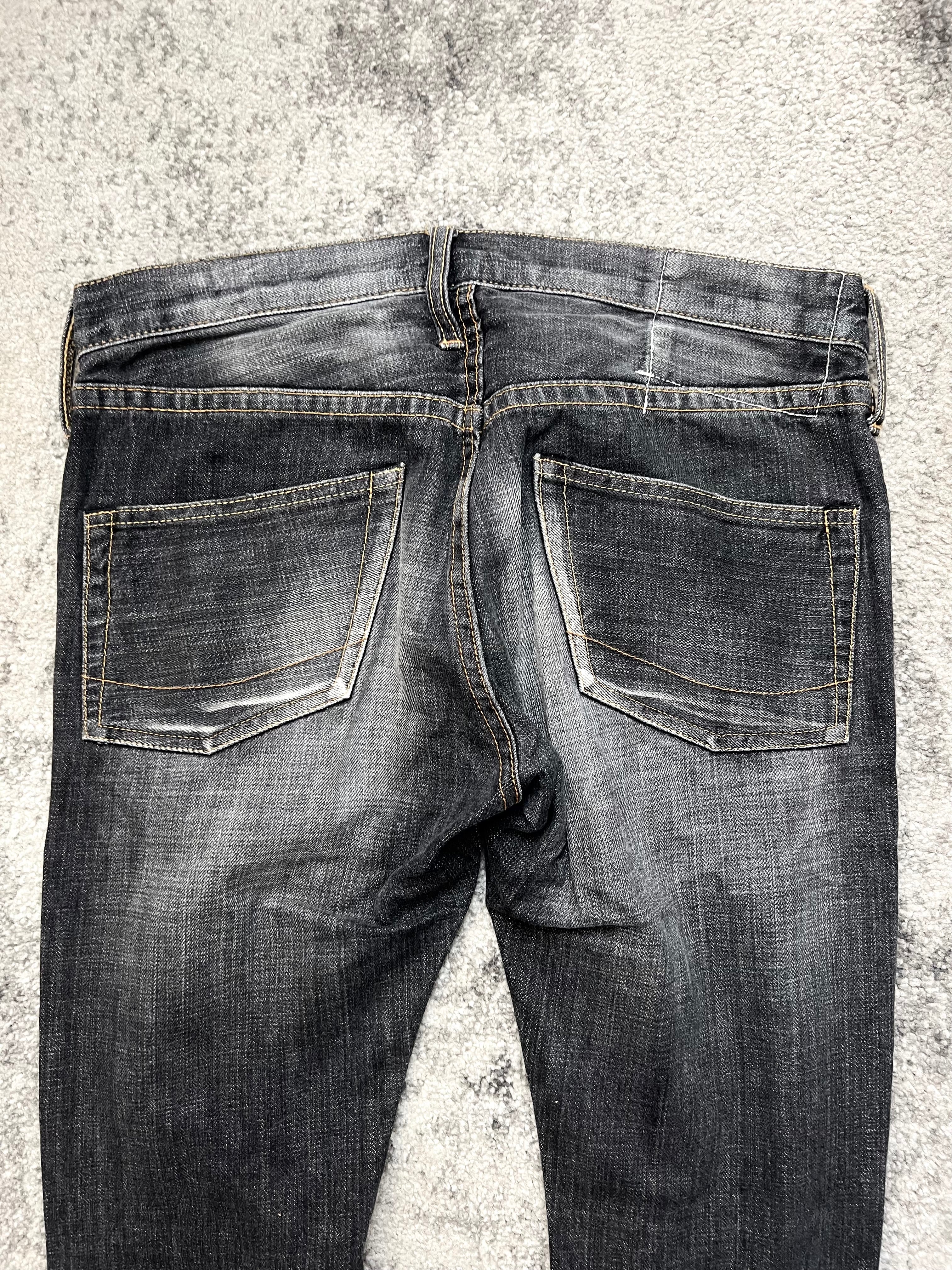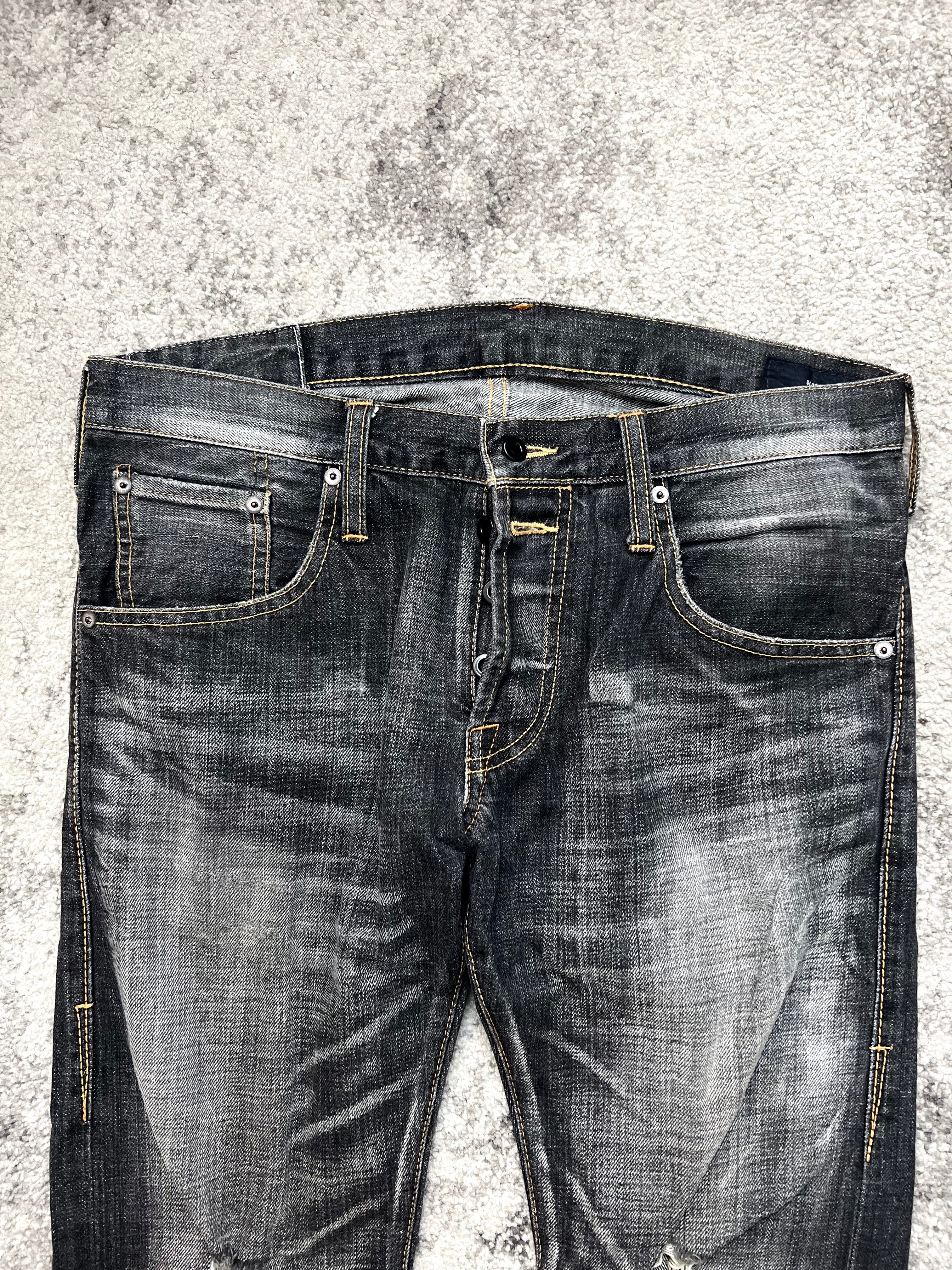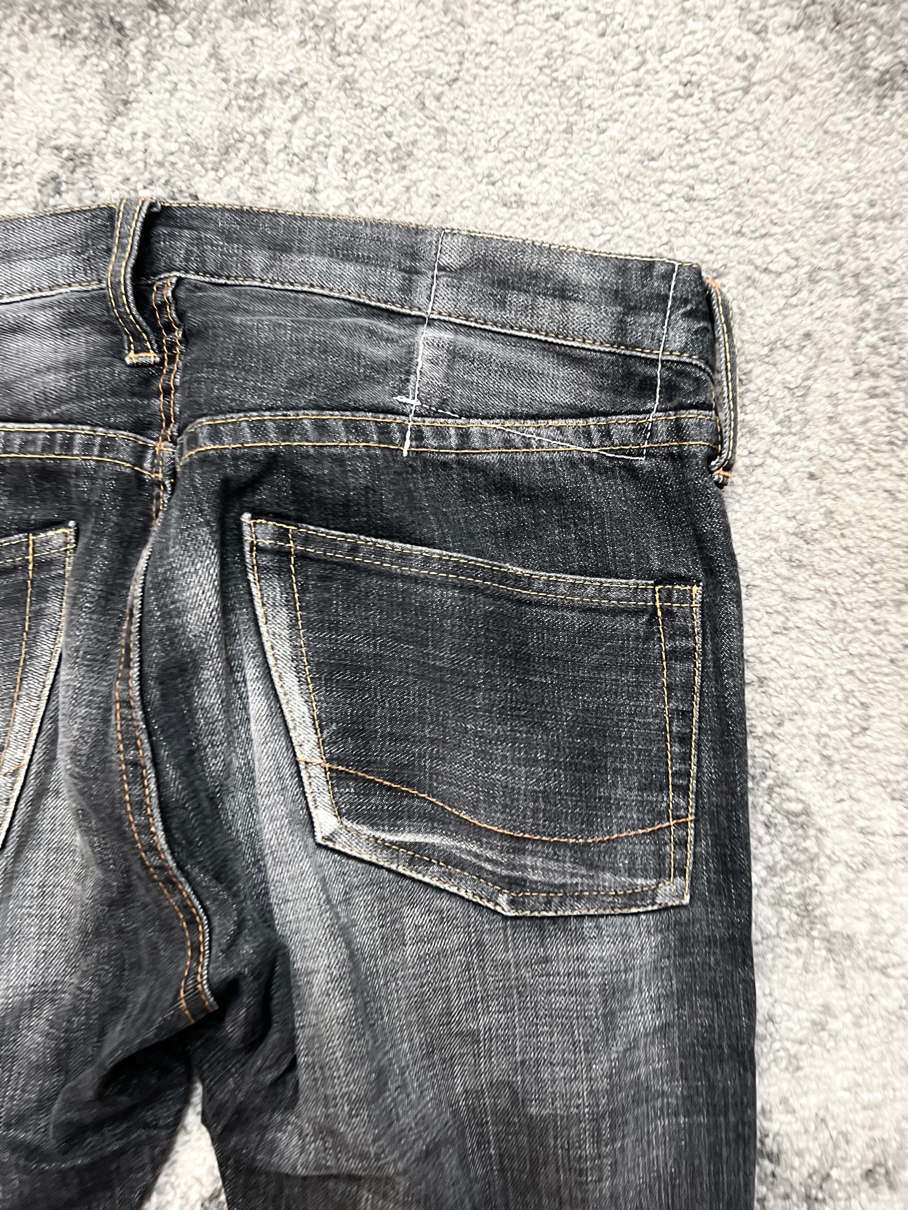 Straight-leg cut with mid rise. Raw edge hems and subtle contrast stitching. Pocket placement has that low-slung attitude, perfect for layered archive looks.