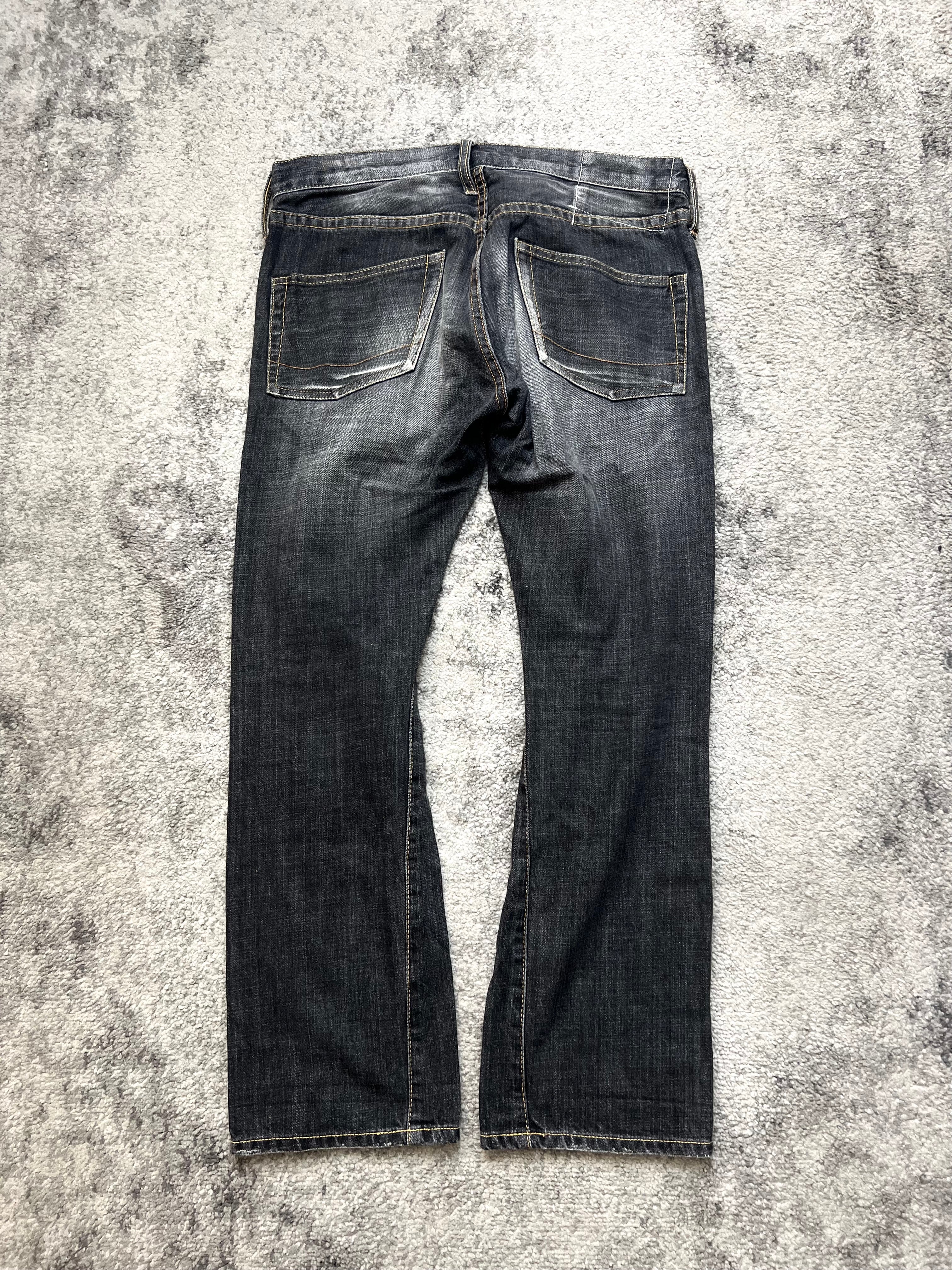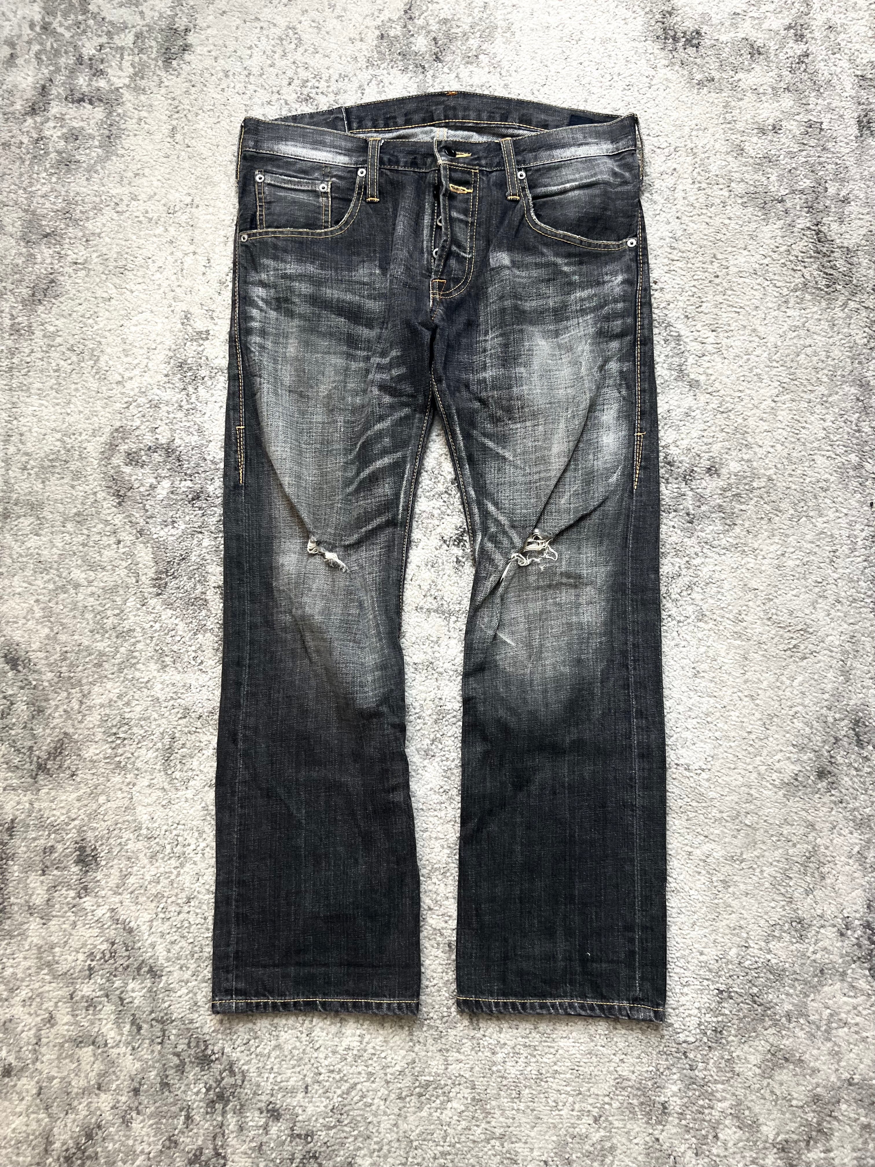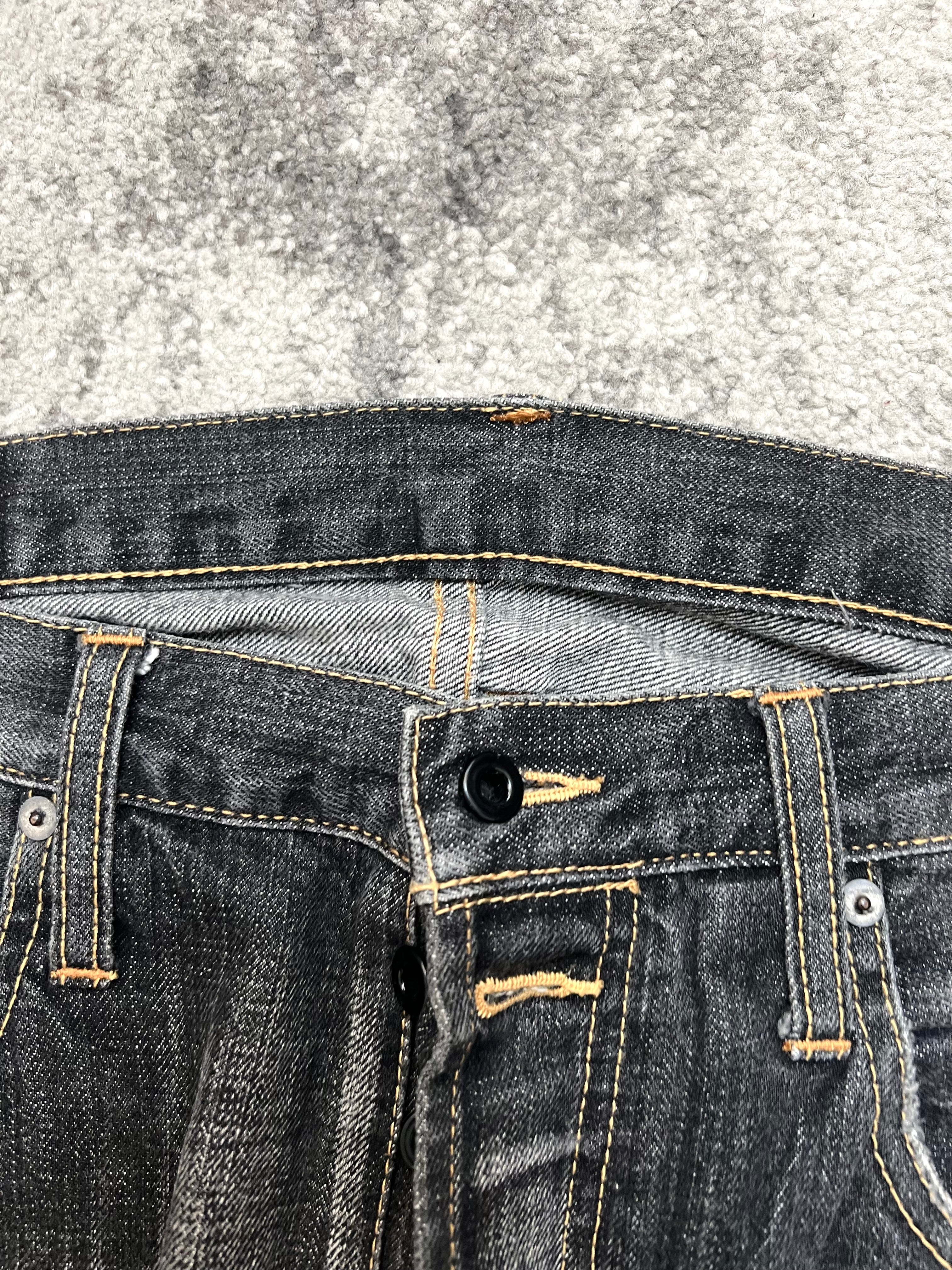 Straight-leg cut with mid rise. Raw edge hems and subtle contrast stitching. Pocket placement has that low-slung attitude, perfect for layered archive looks.