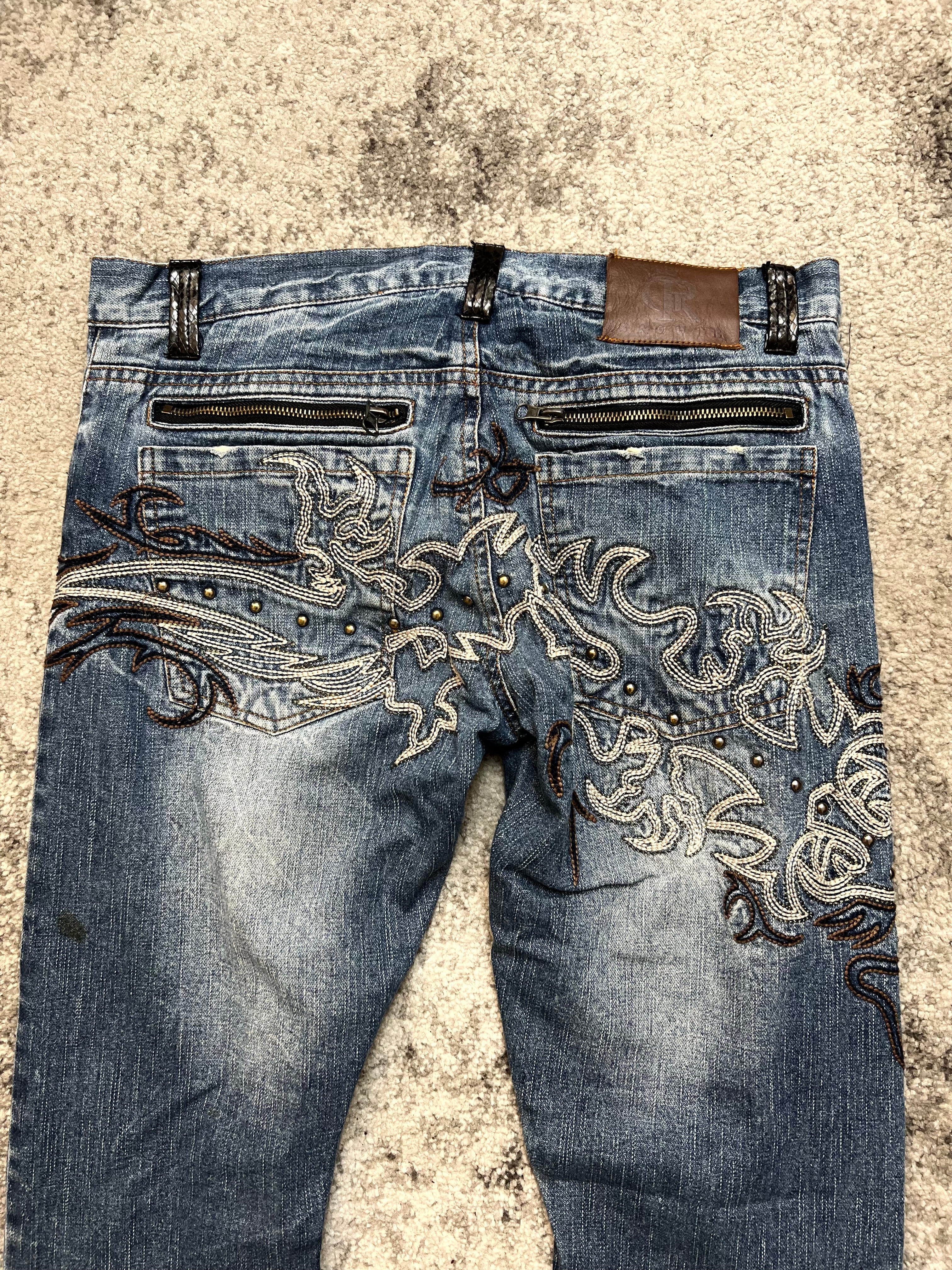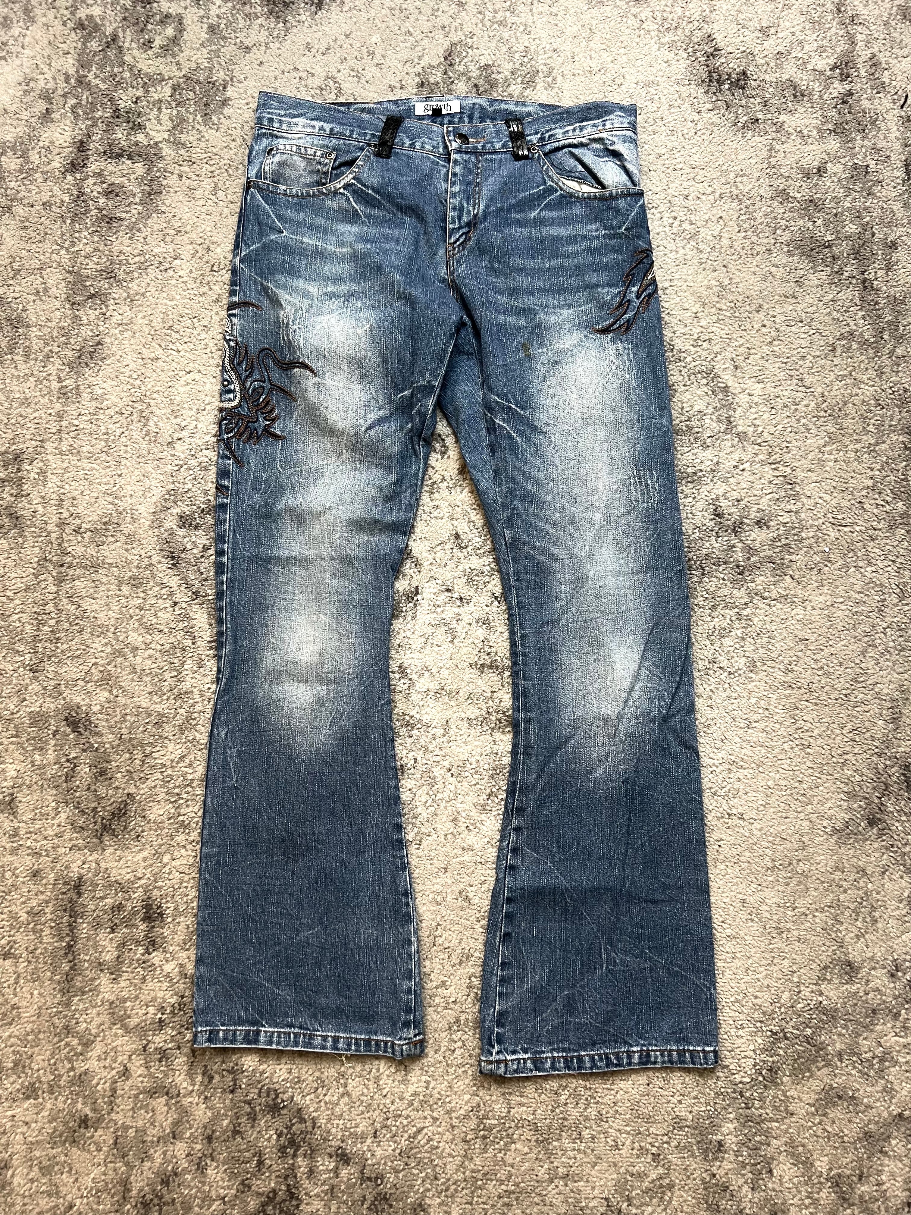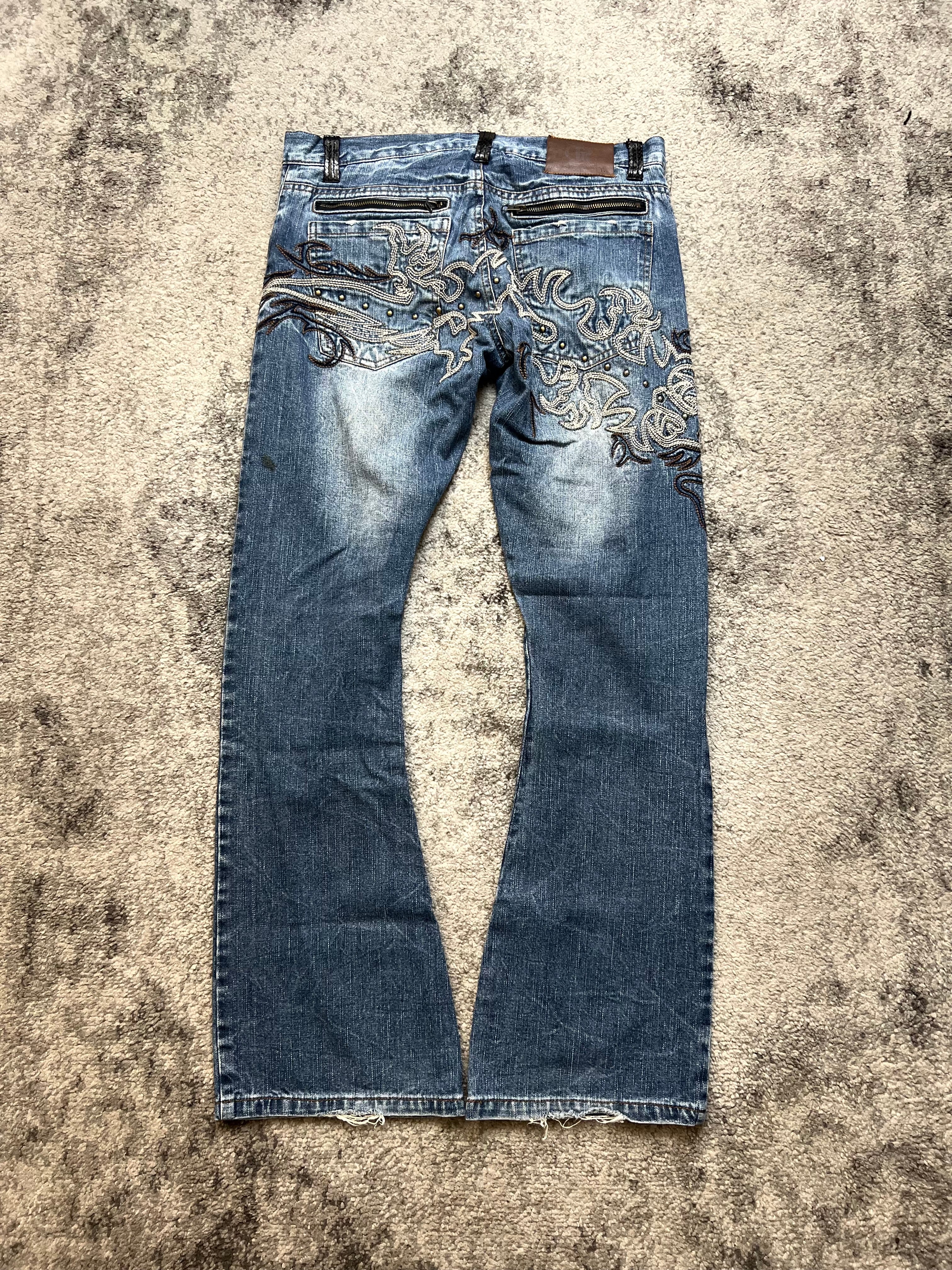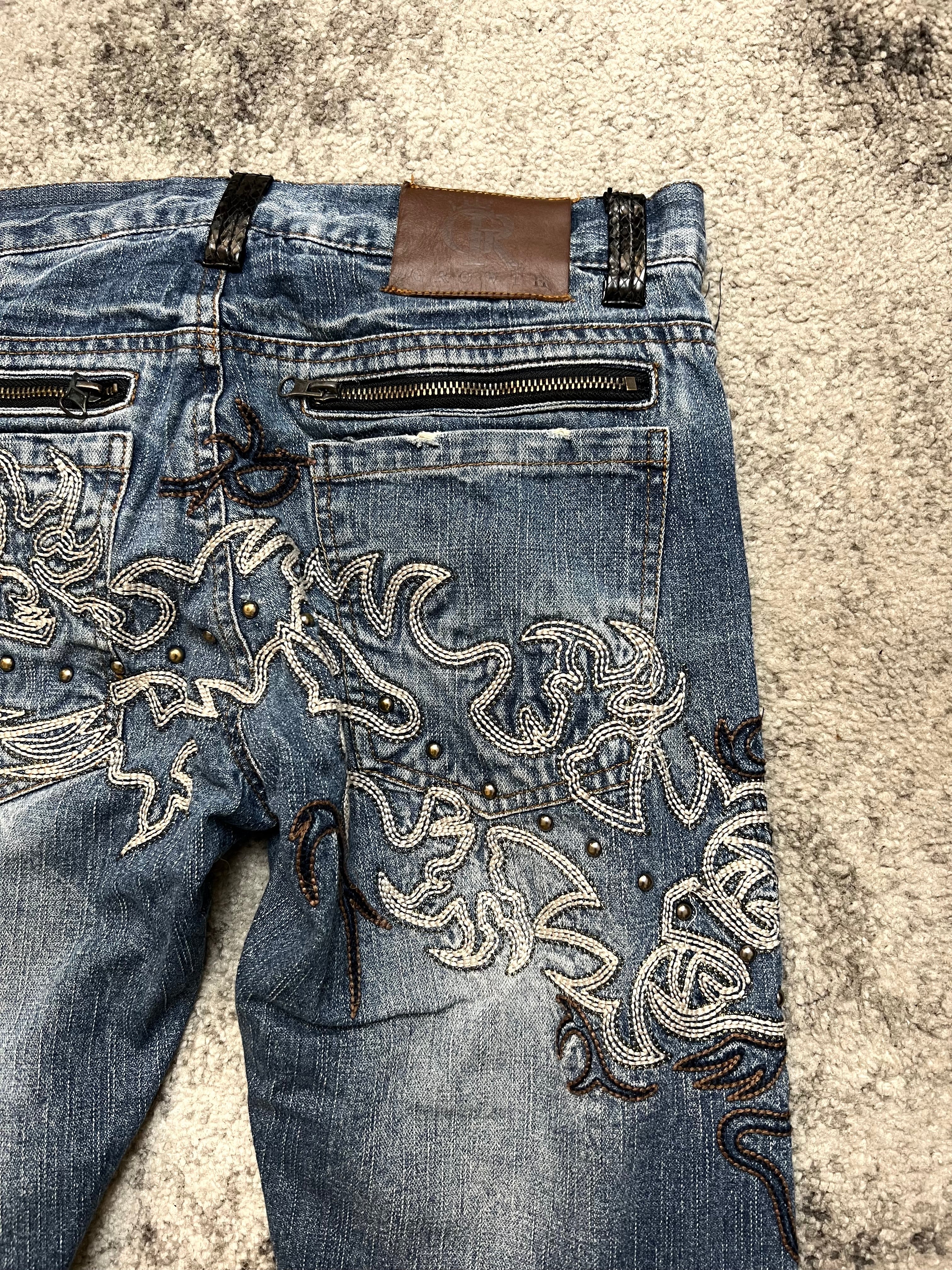 A relic from Japan’s underground scene – where embroidery meets raw soul. These jeans carry the storm in their threads and a whisper of rebellion in every crease.