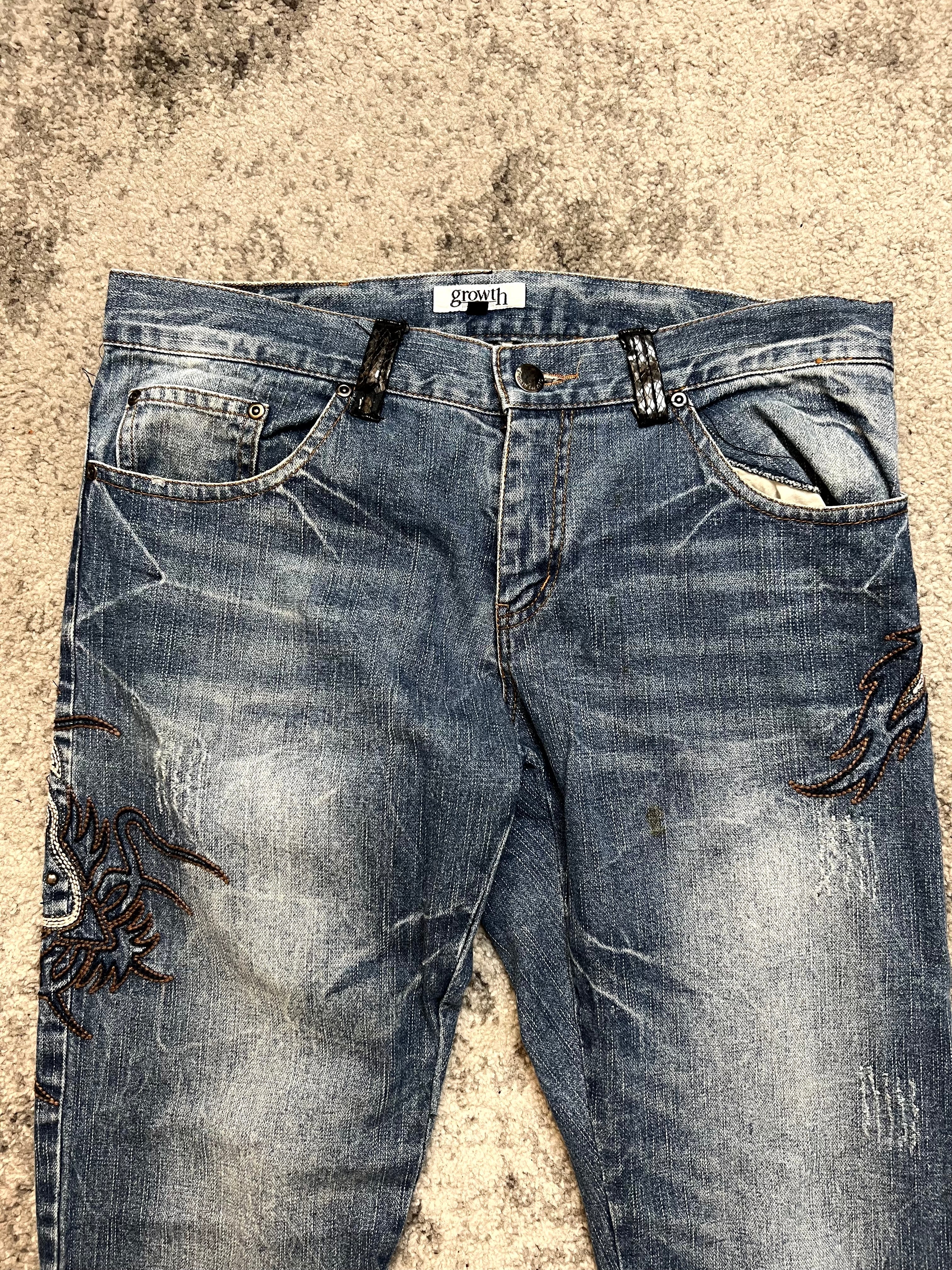 GROWTH “Dragon’s Whisper” Denim – faded thunder, stitched in fire.