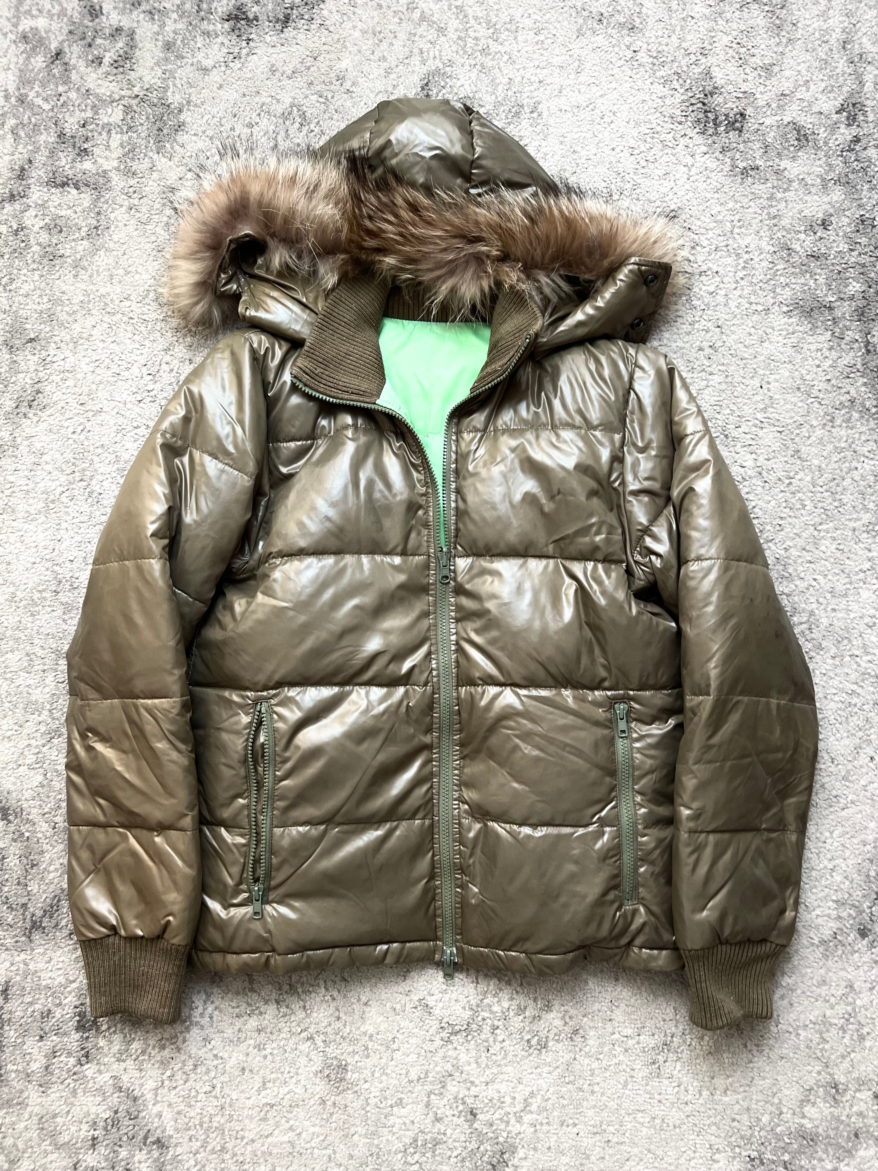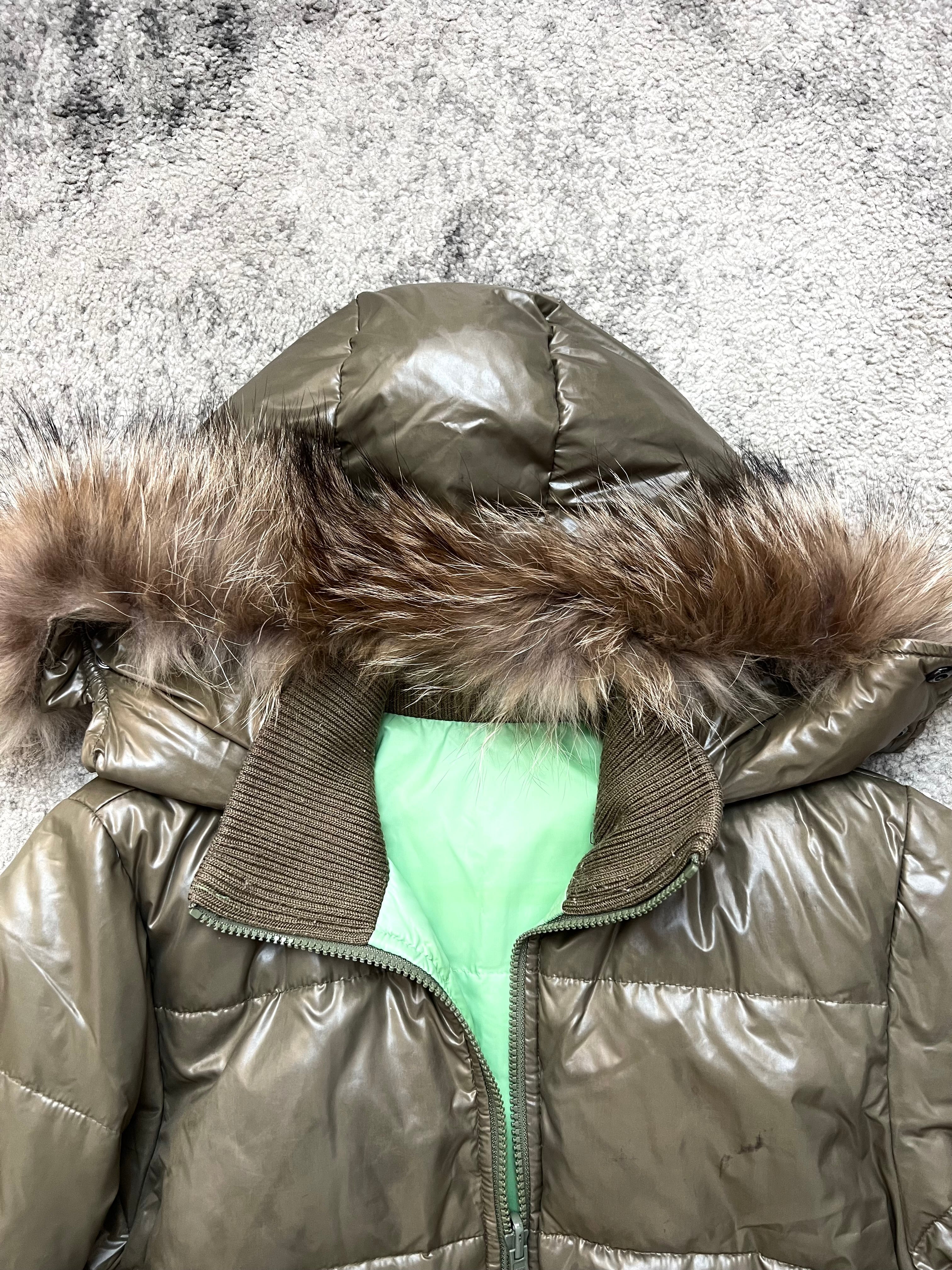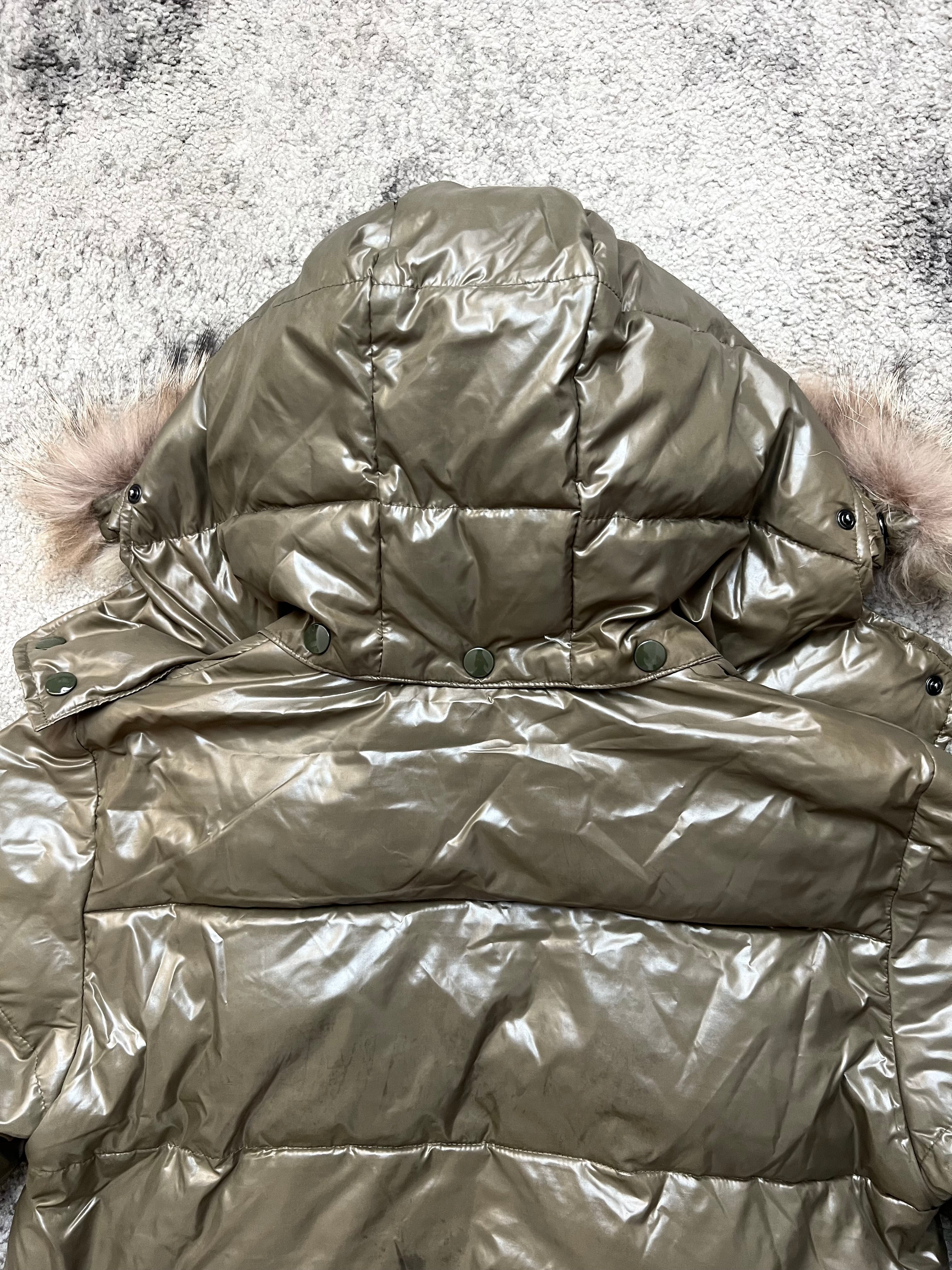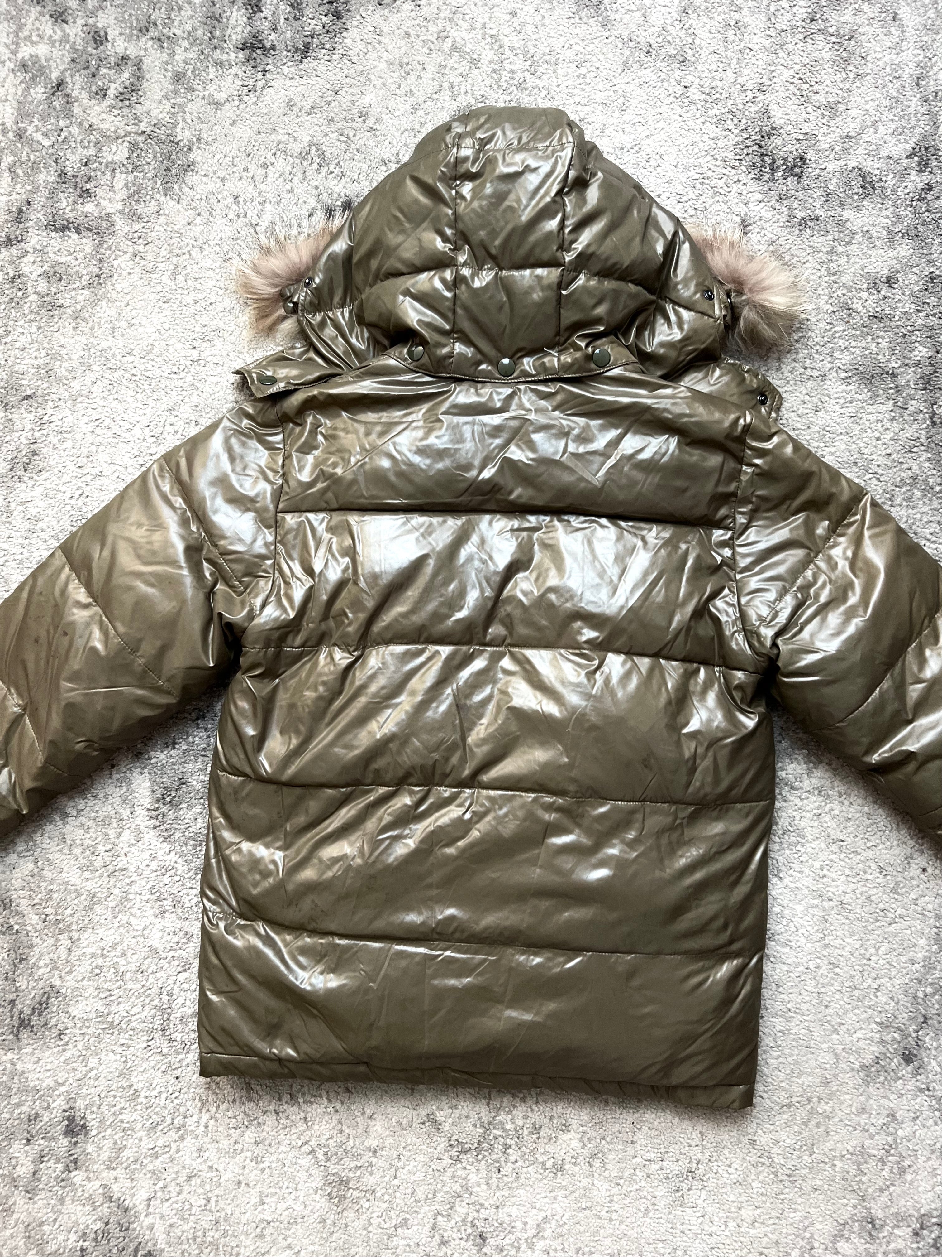 Material: Gloss-finished nylon shell with plush down fill, trimmed with real fur at the hood. Warmth meets a slick, reflective sheen.