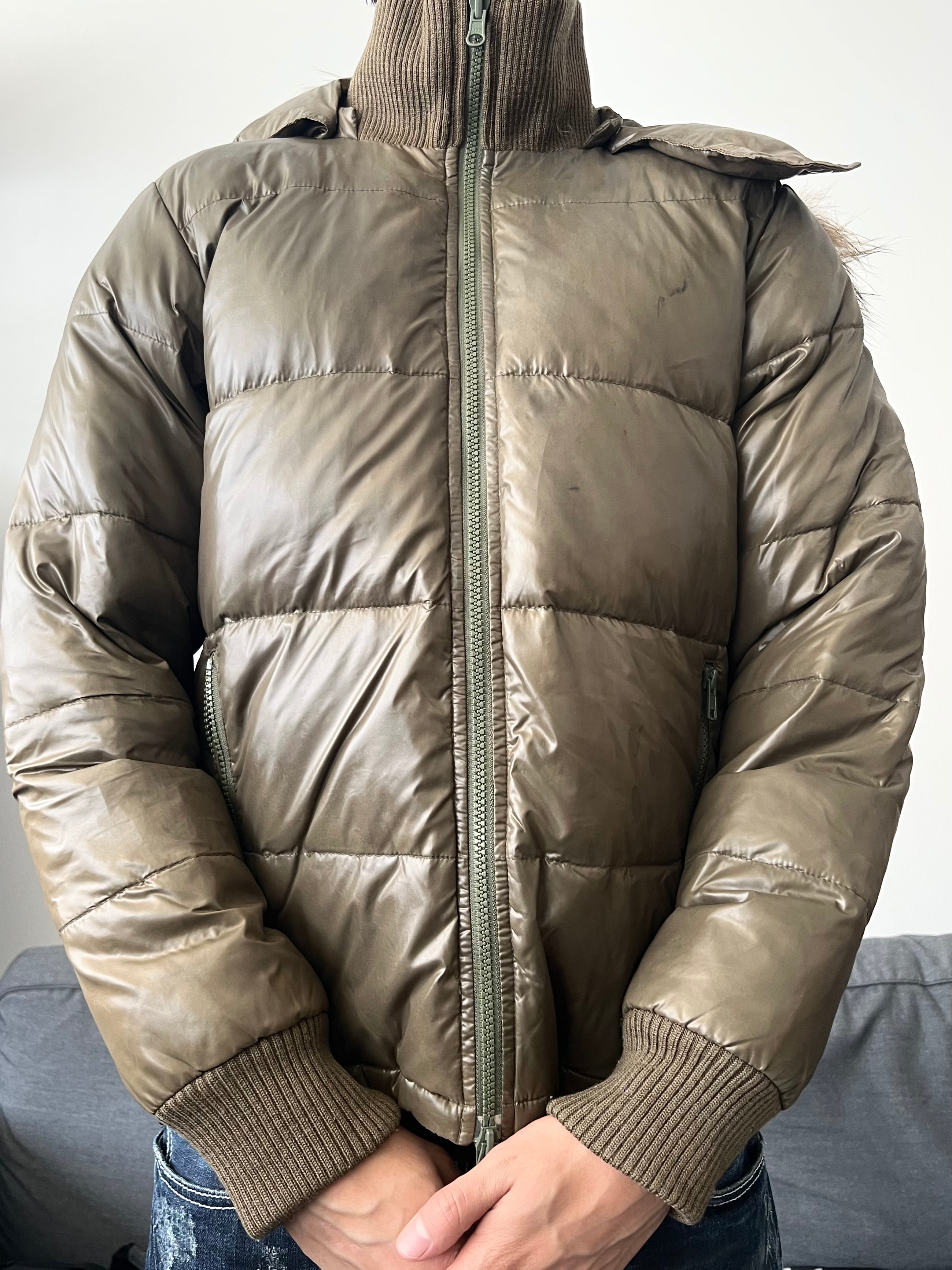 Styling: Classic padded silhouette reimagined with Japanese edge. The olive tone shifts under light, equal parts military and street rebellion.