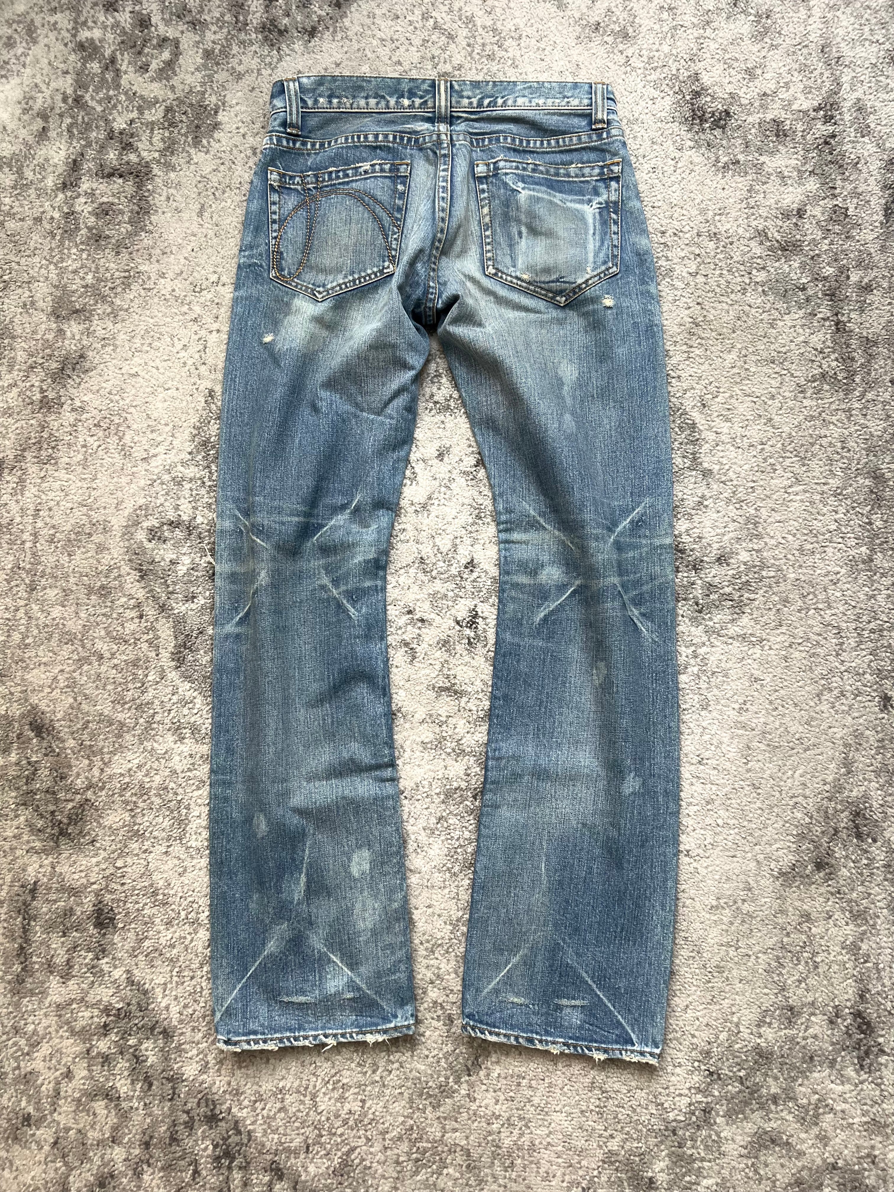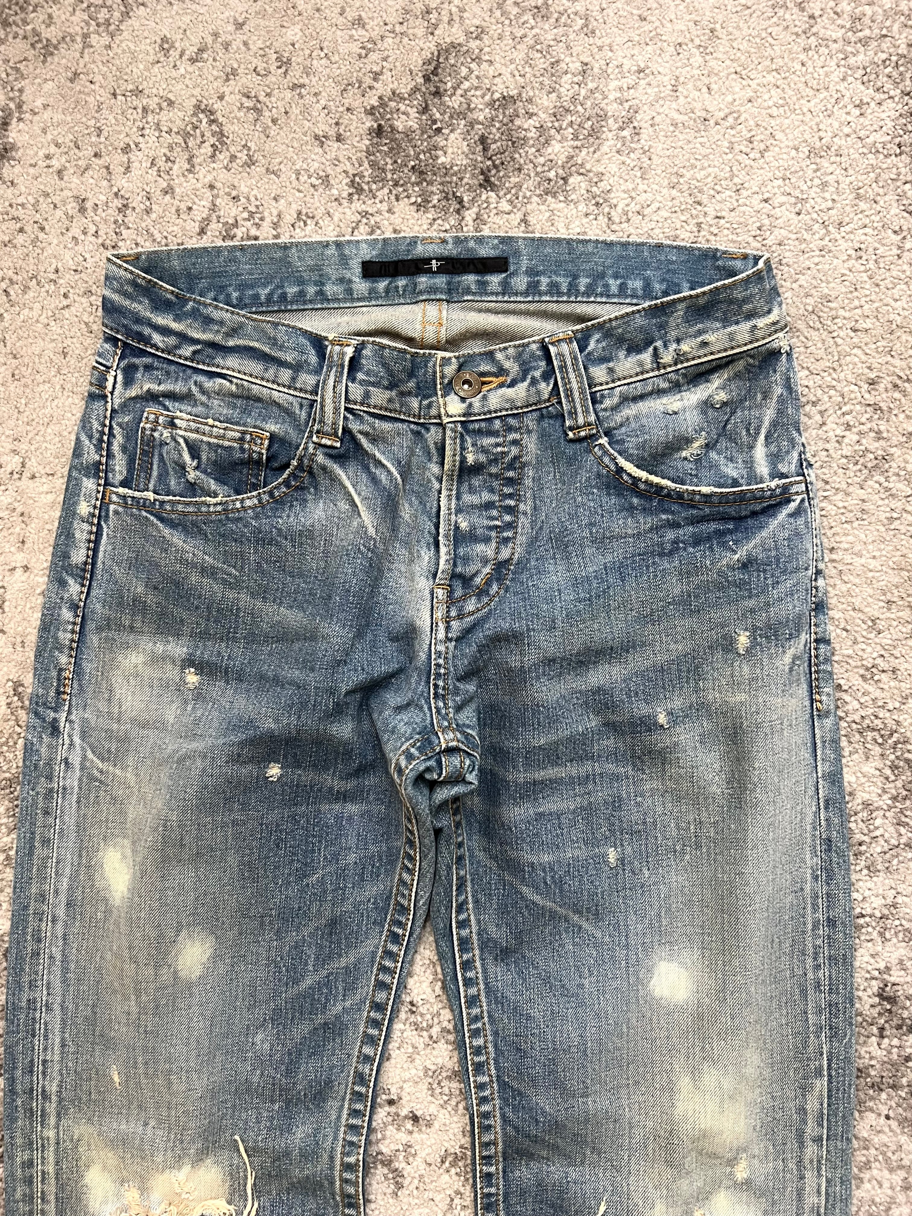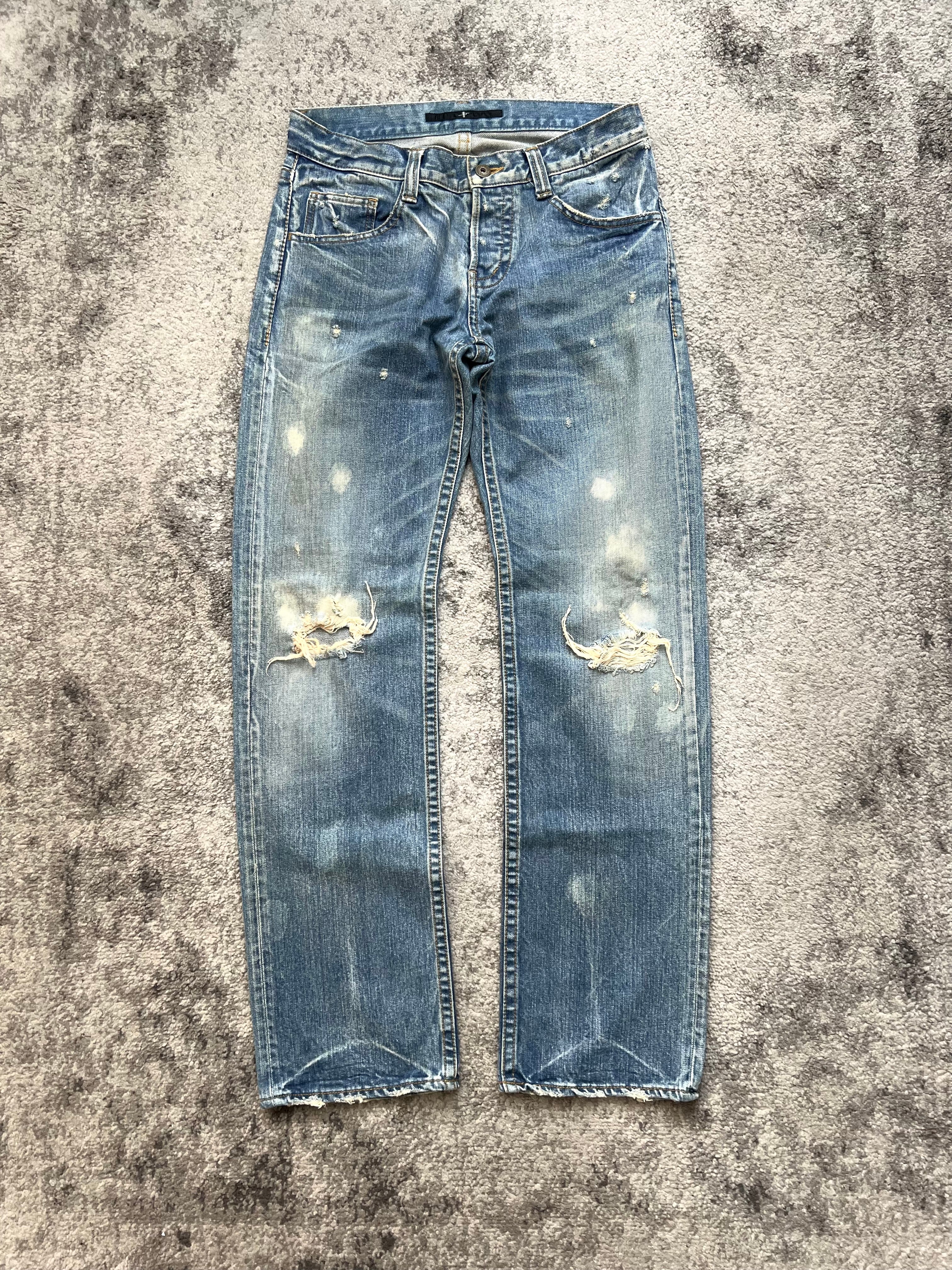 Pre-owned with expressive wear. Rips, frays, and heavy fading throughout. All damage is intentional—no flaws, only feeling.