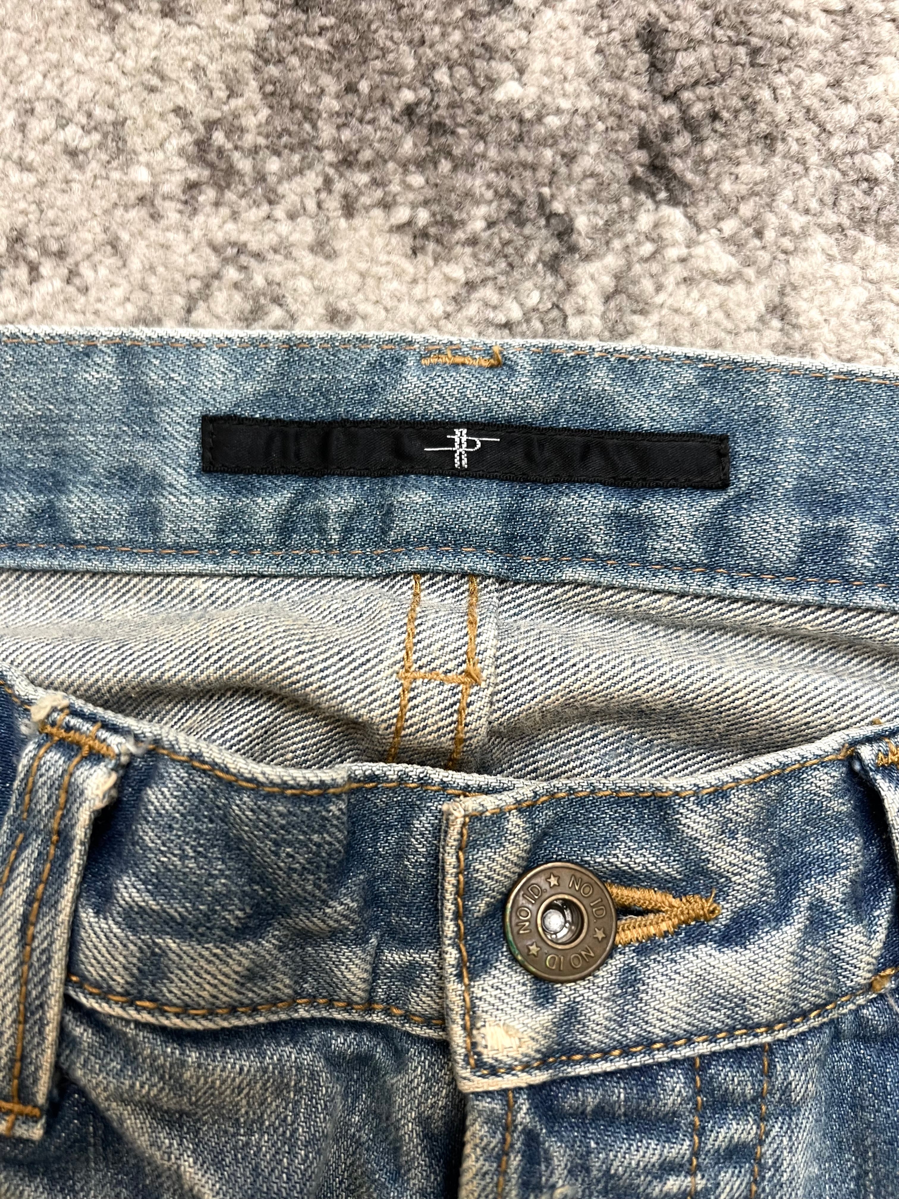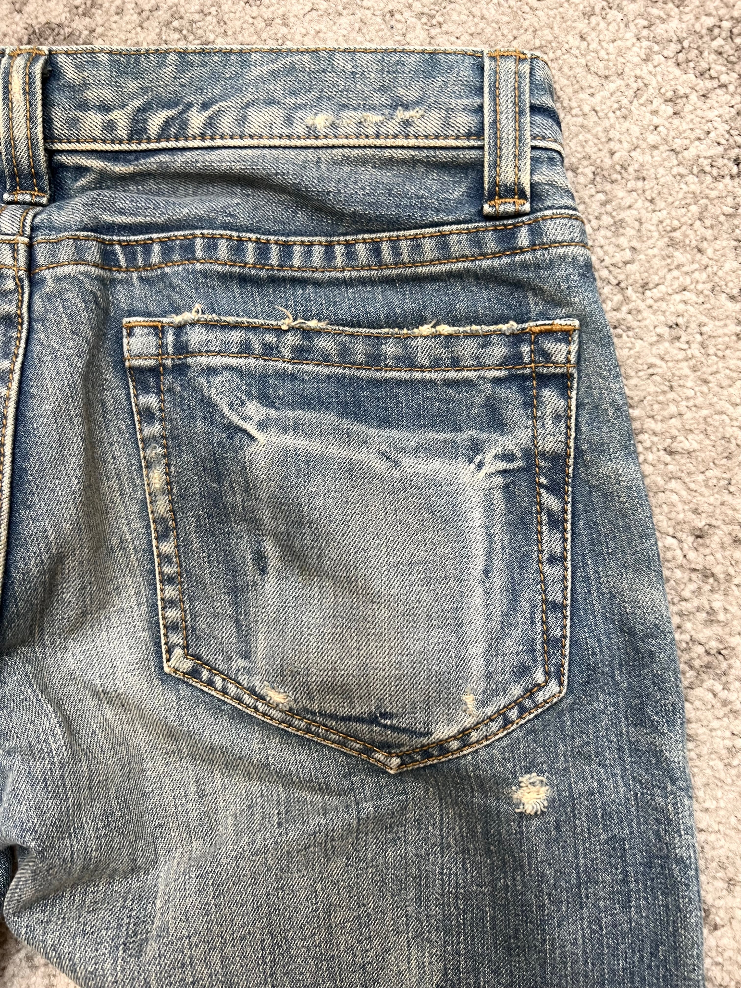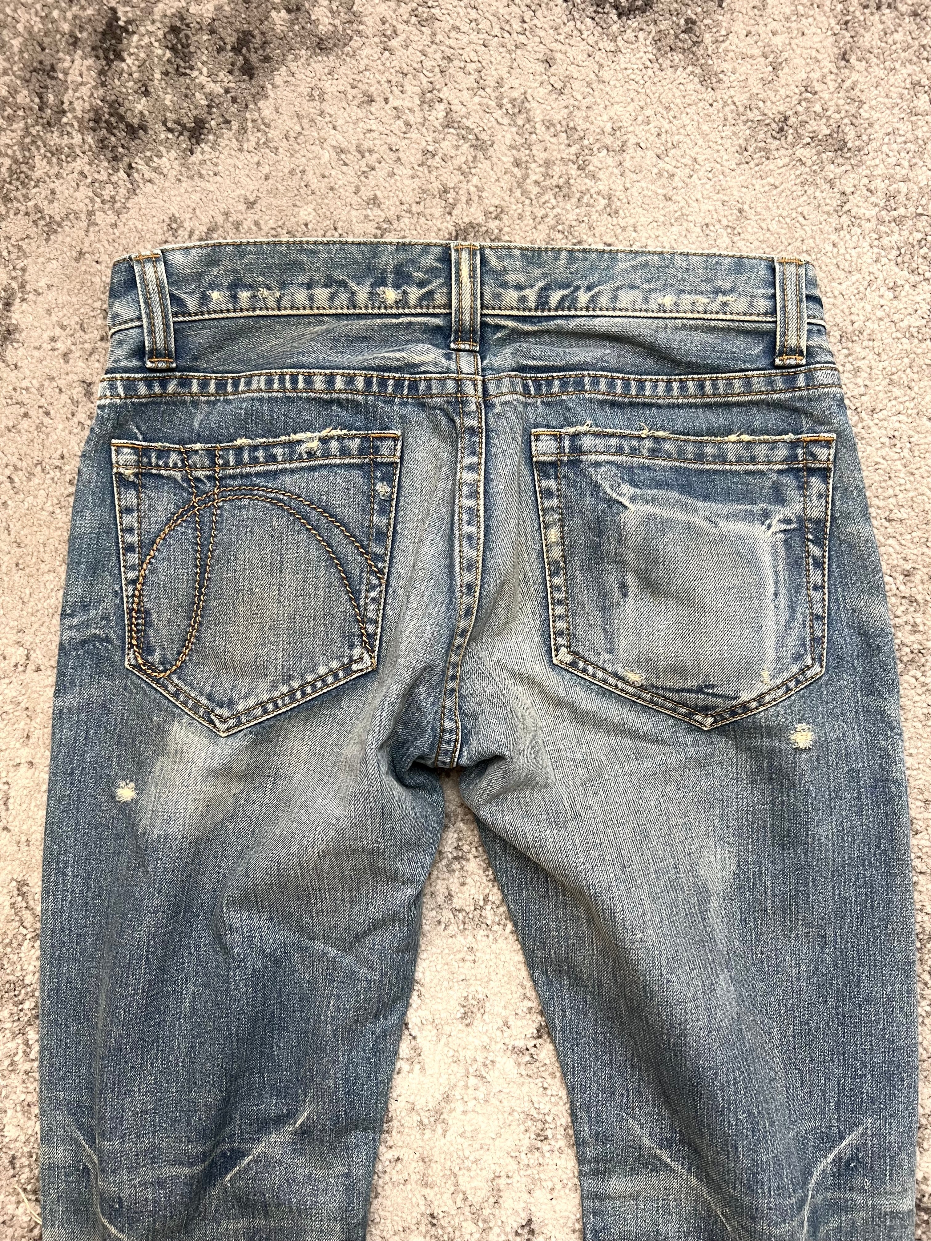 Pre-owned with expressive wear. Rips, frays, and heavy fading throughout. All damage is intentional—no flaws, only feeling.