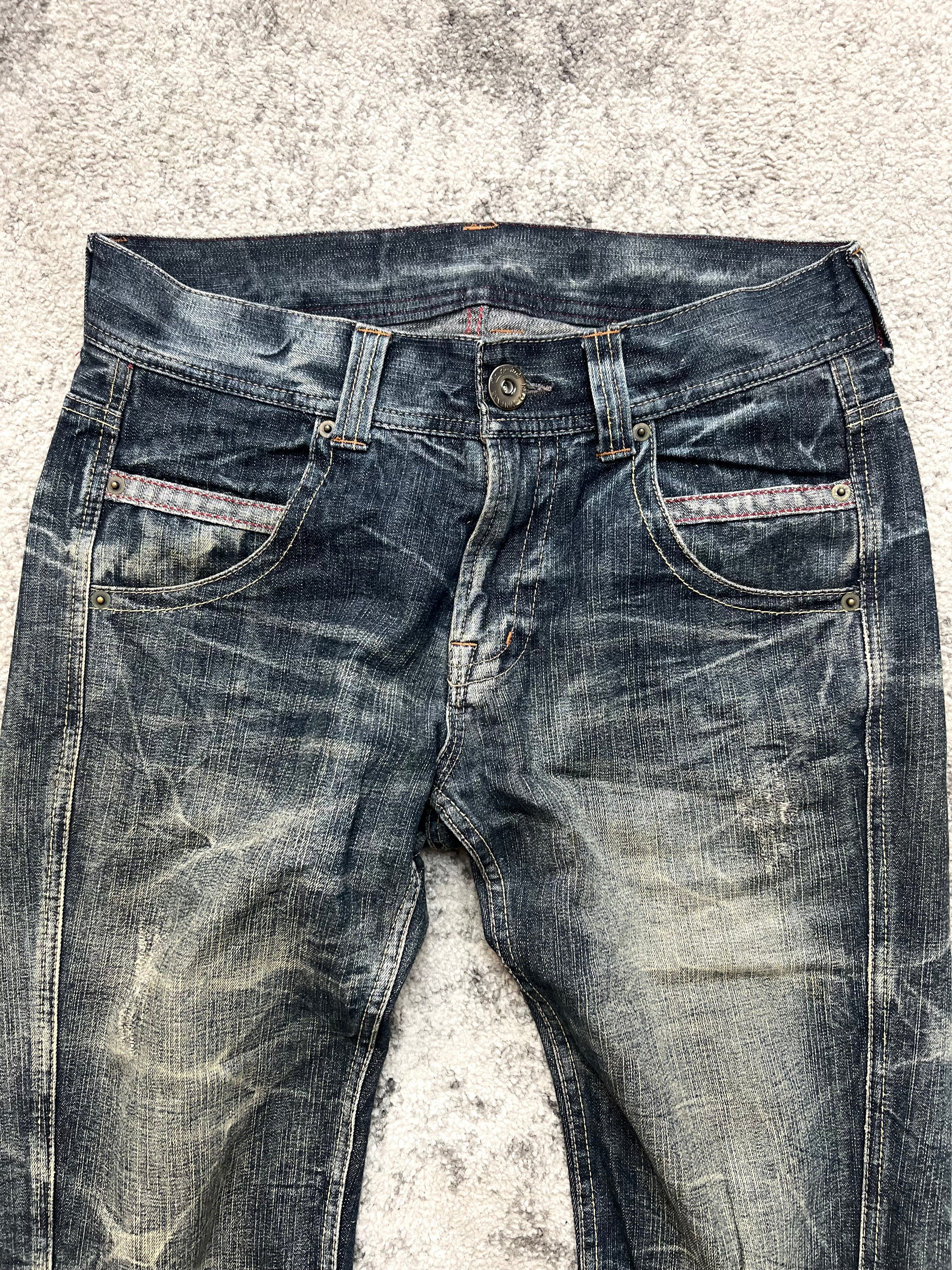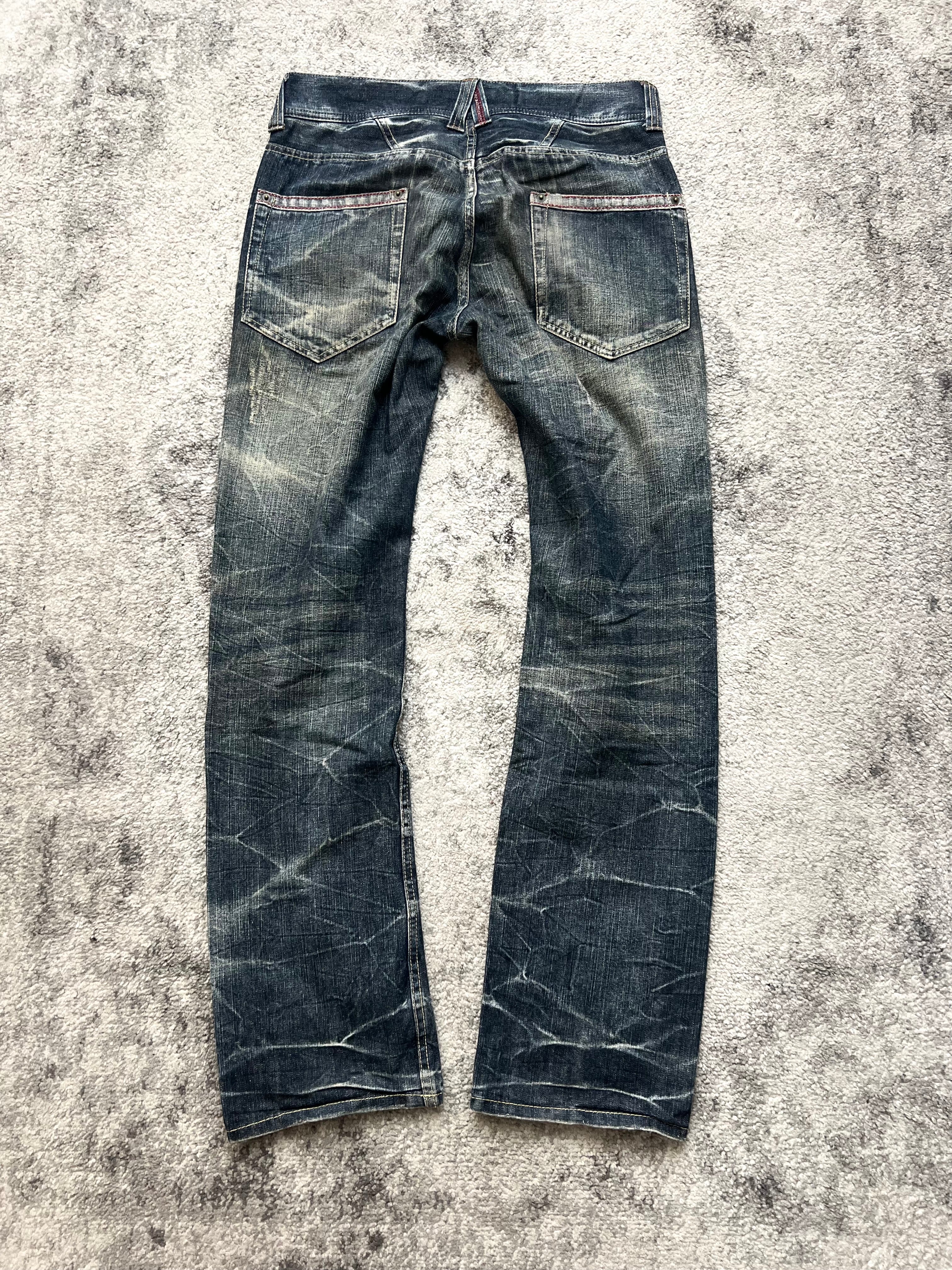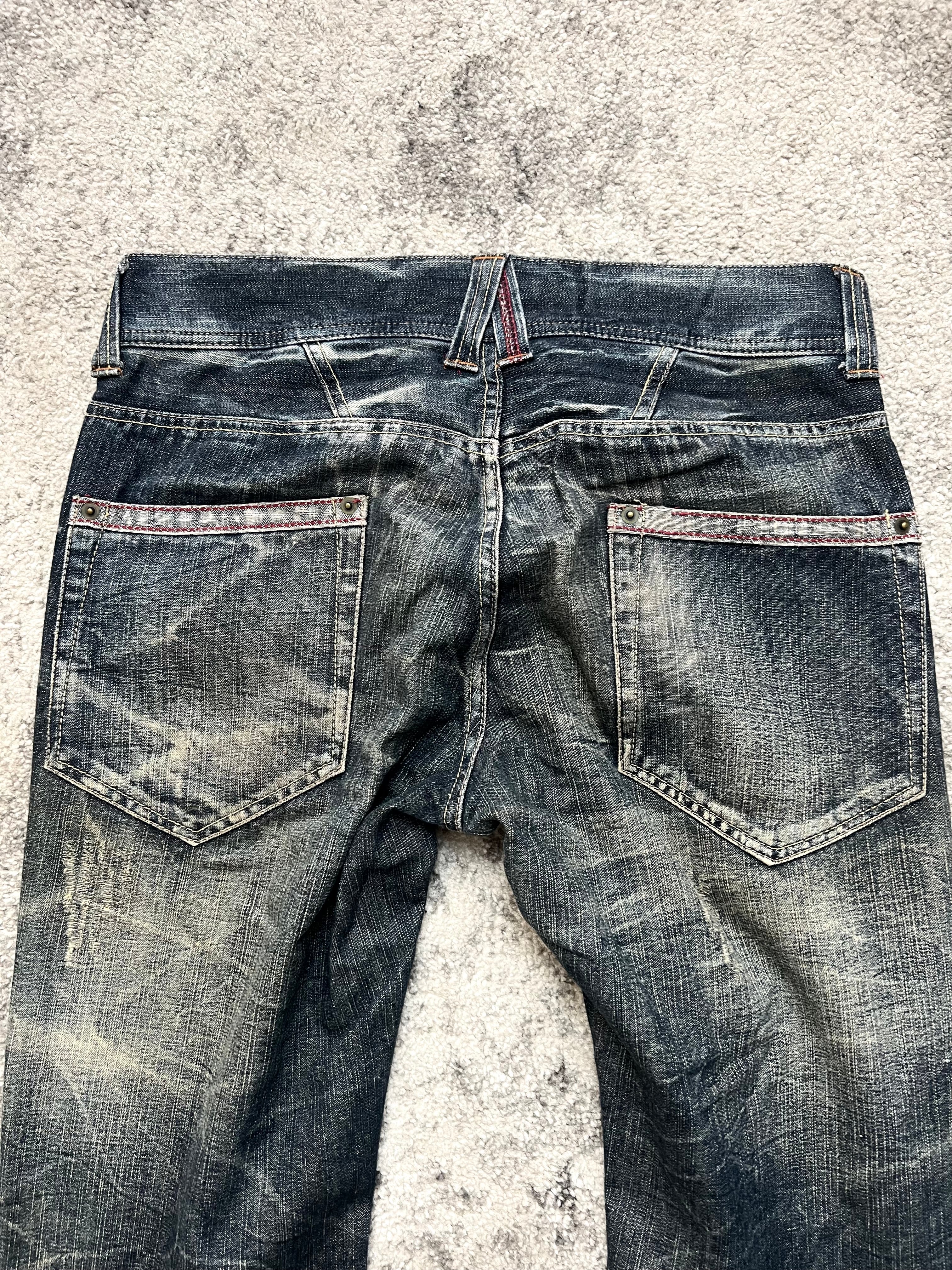 Denim that hums like an old tape deck in a midnight room. This rare Heisei piece radiates quiet tension—crosshatched fading like signal interference, bleached bruises across a rugged silhouette. Streetwear for the ones who move in silence but leave an afterglow.