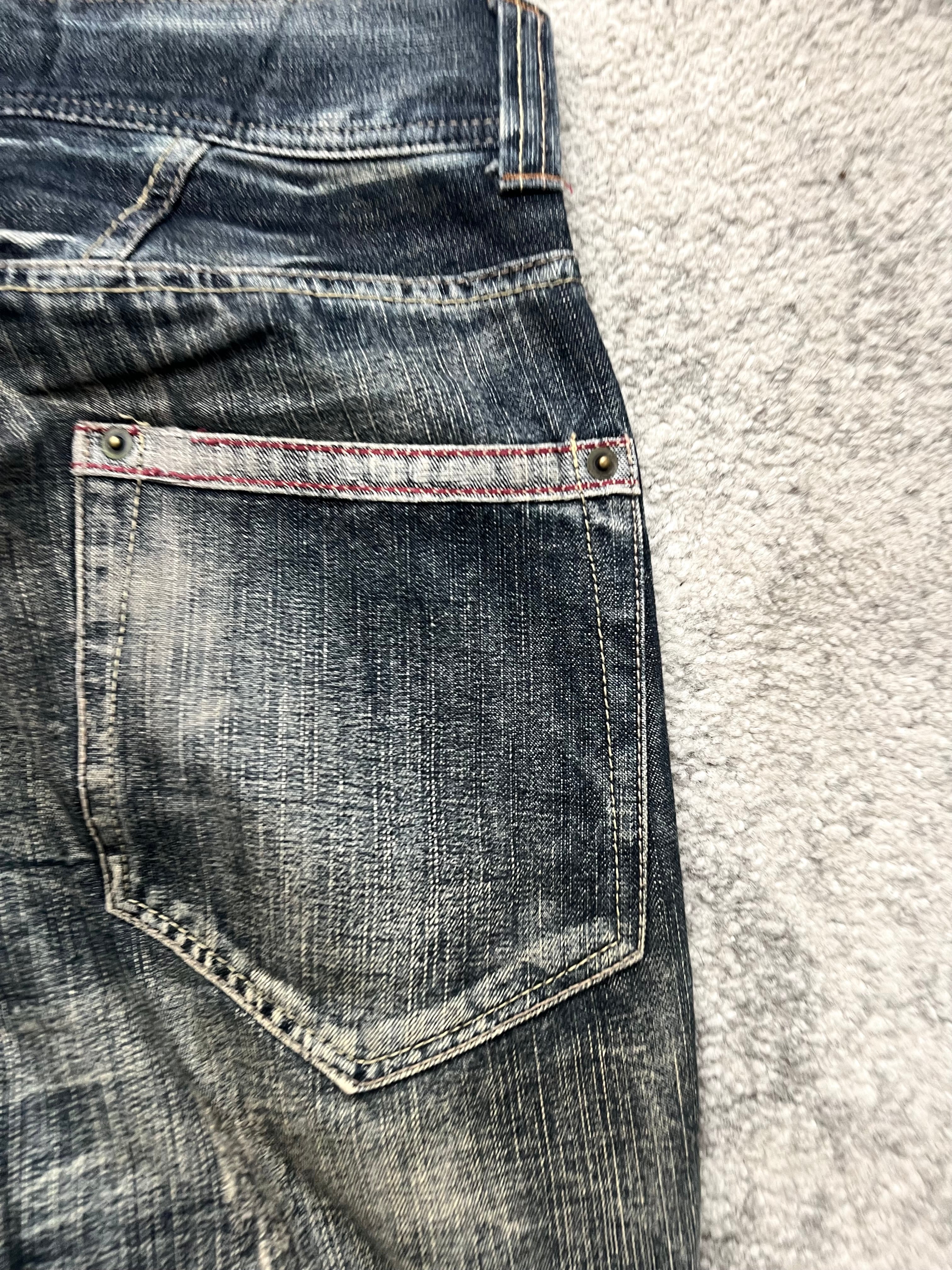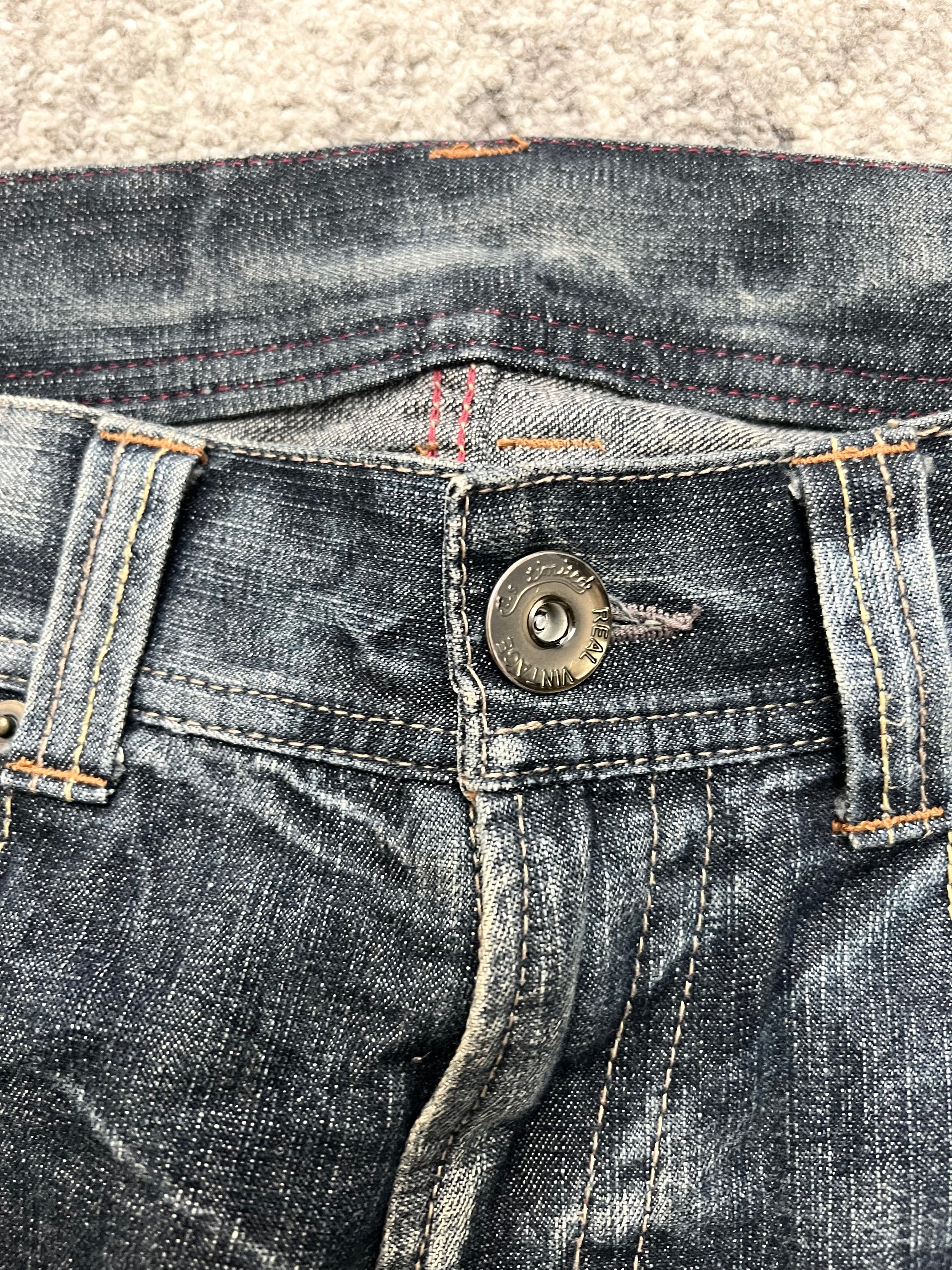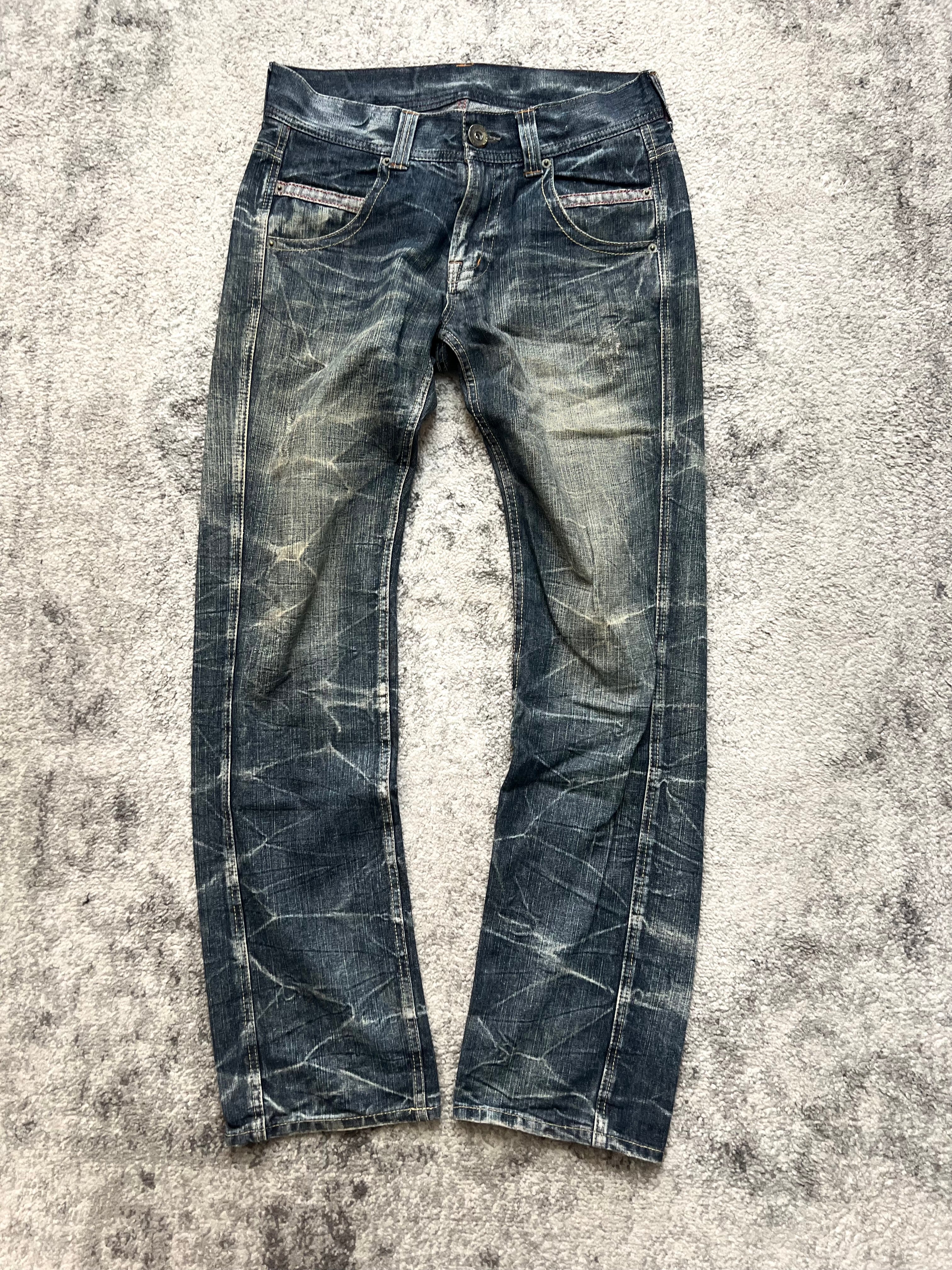 Denim that hums like an old tape deck in a midnight room. This rare Heisei piece radiates quiet tension—crosshatched fading like signal interference, bleached bruises across a rugged silhouette. Streetwear for the ones who move in silence but leave an afterglow.