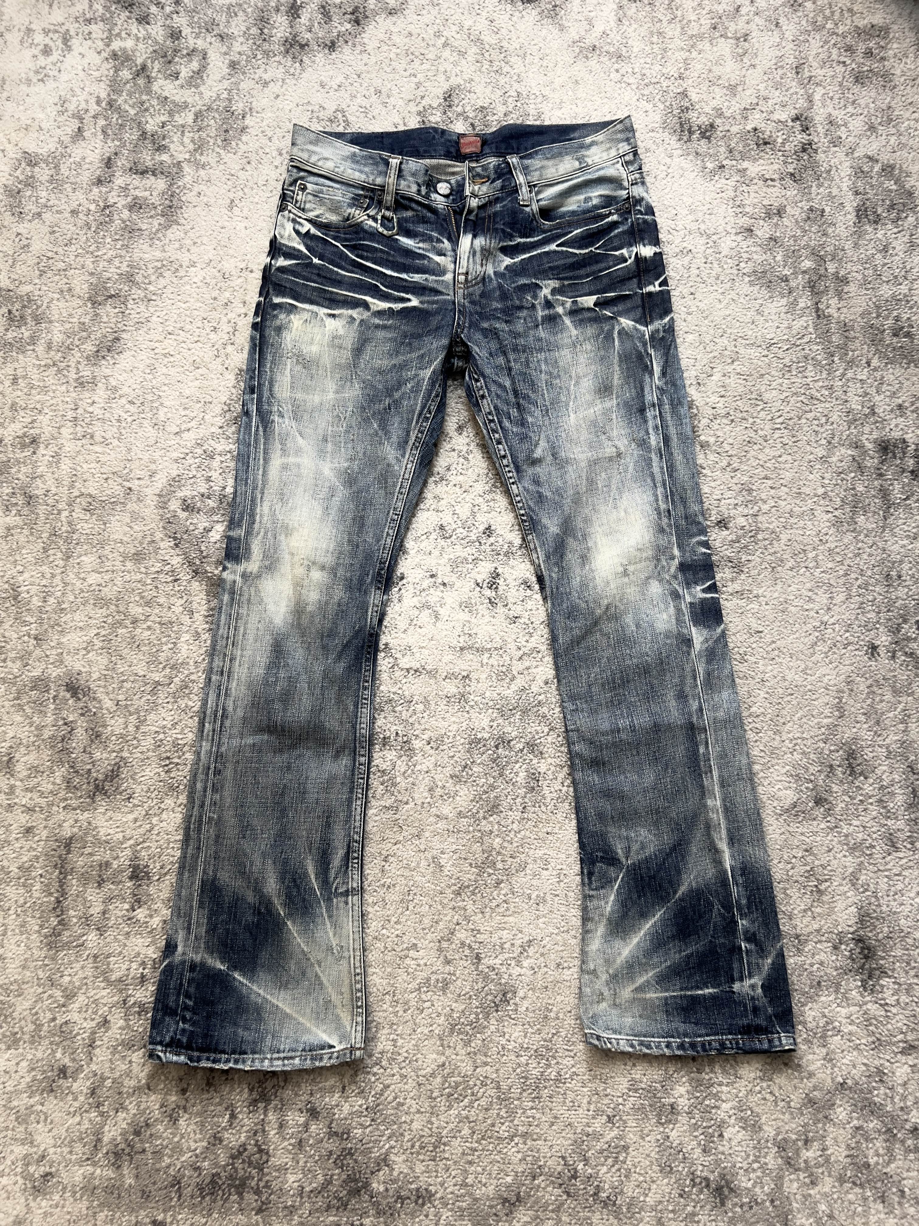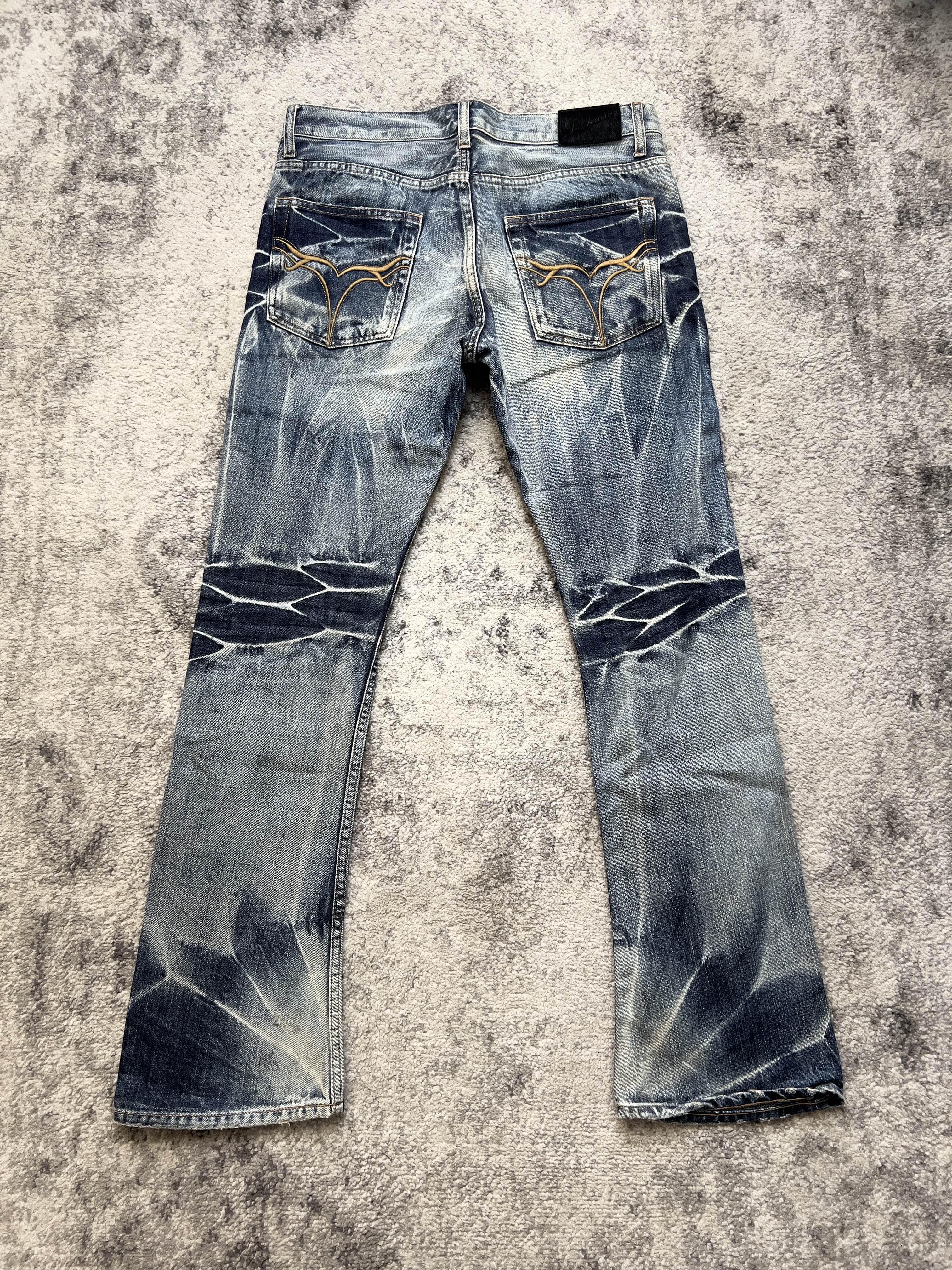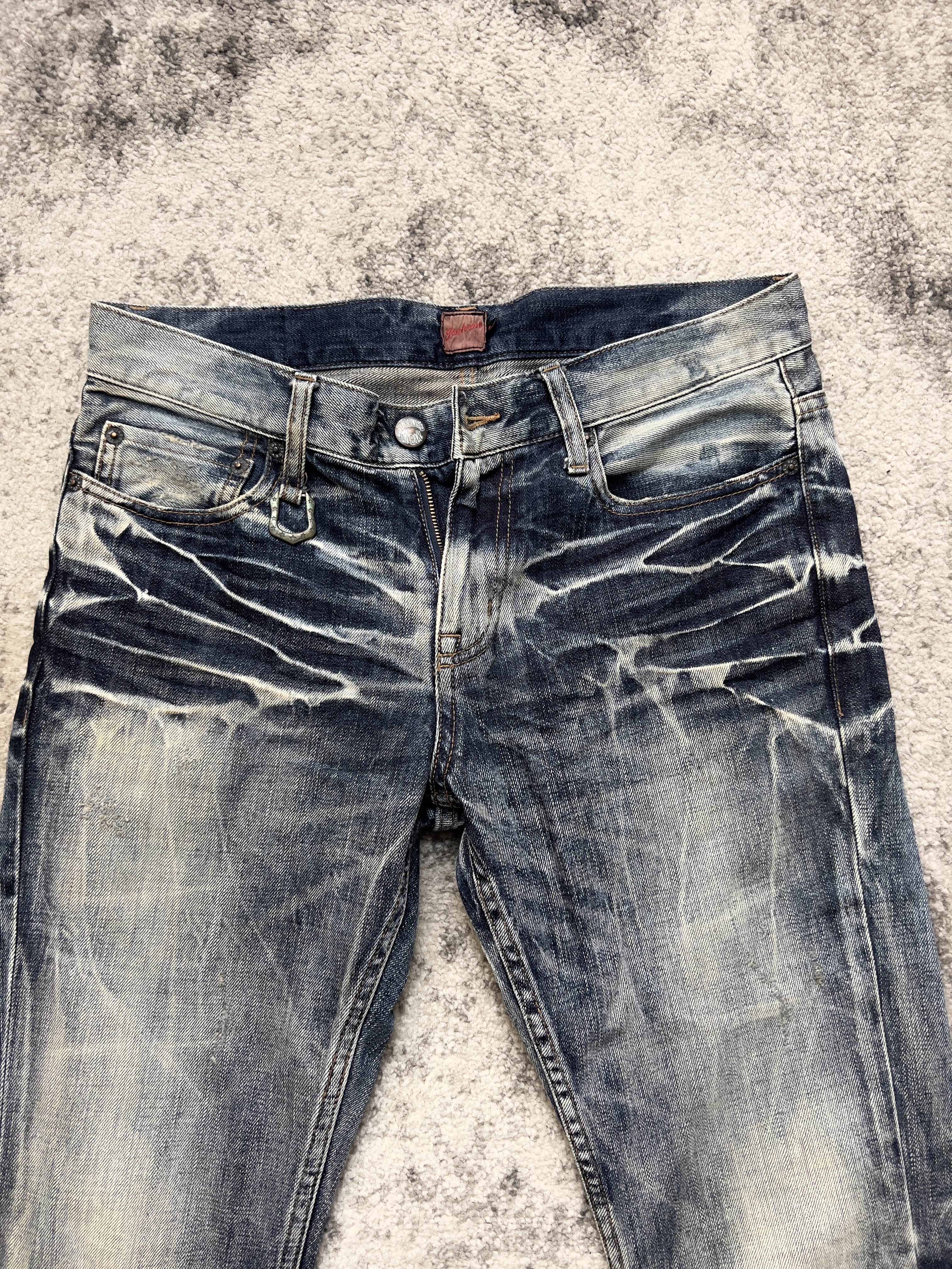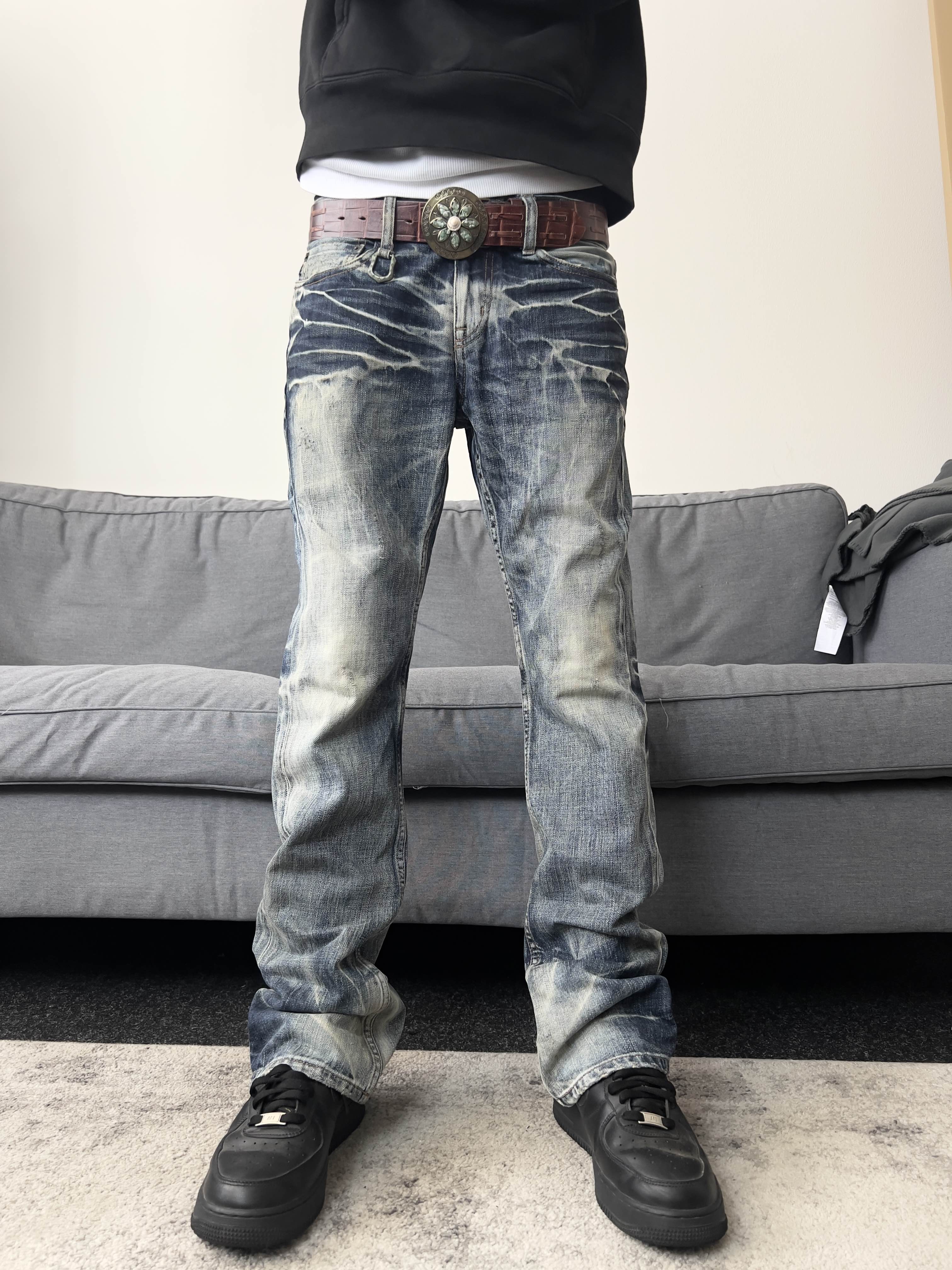 Pre-loved with precision. Vintage abrasion, high-contrast whiskering, and natural stack fades. Every mark tells a story – none of it artificial.