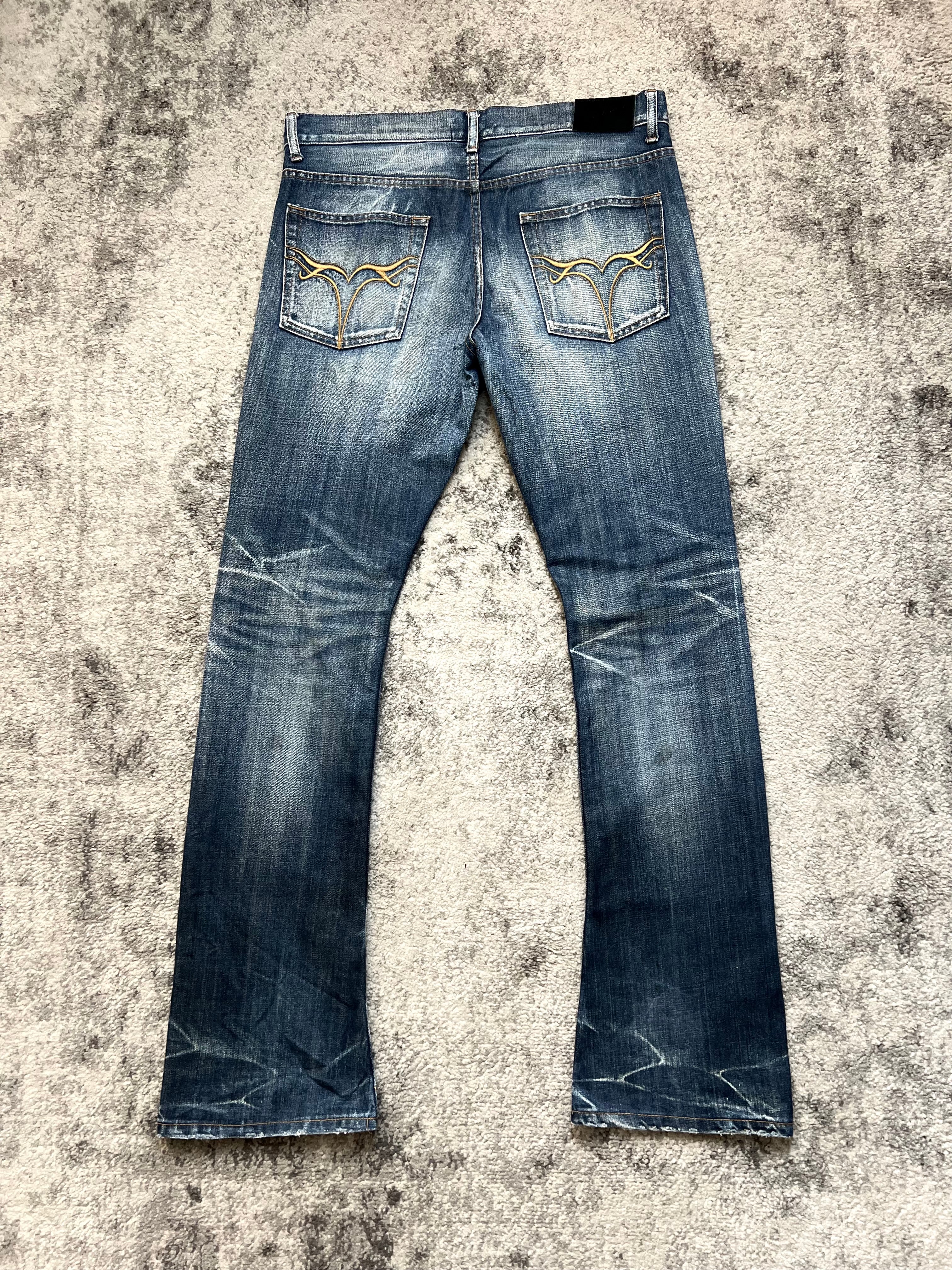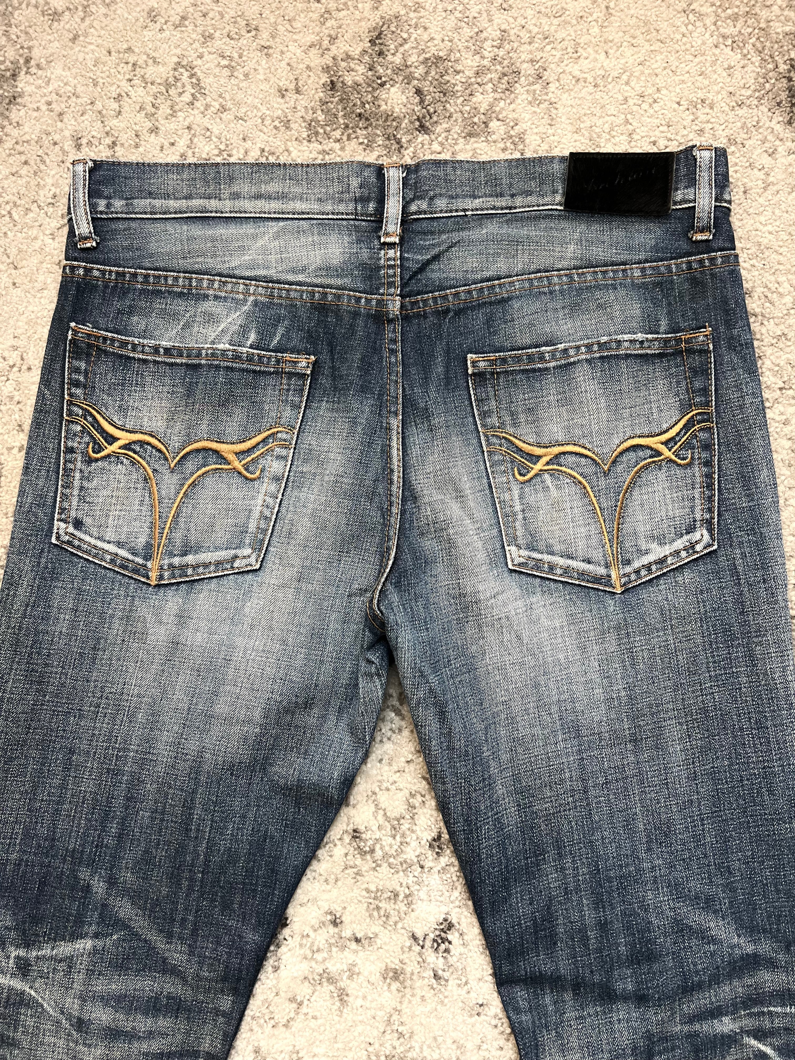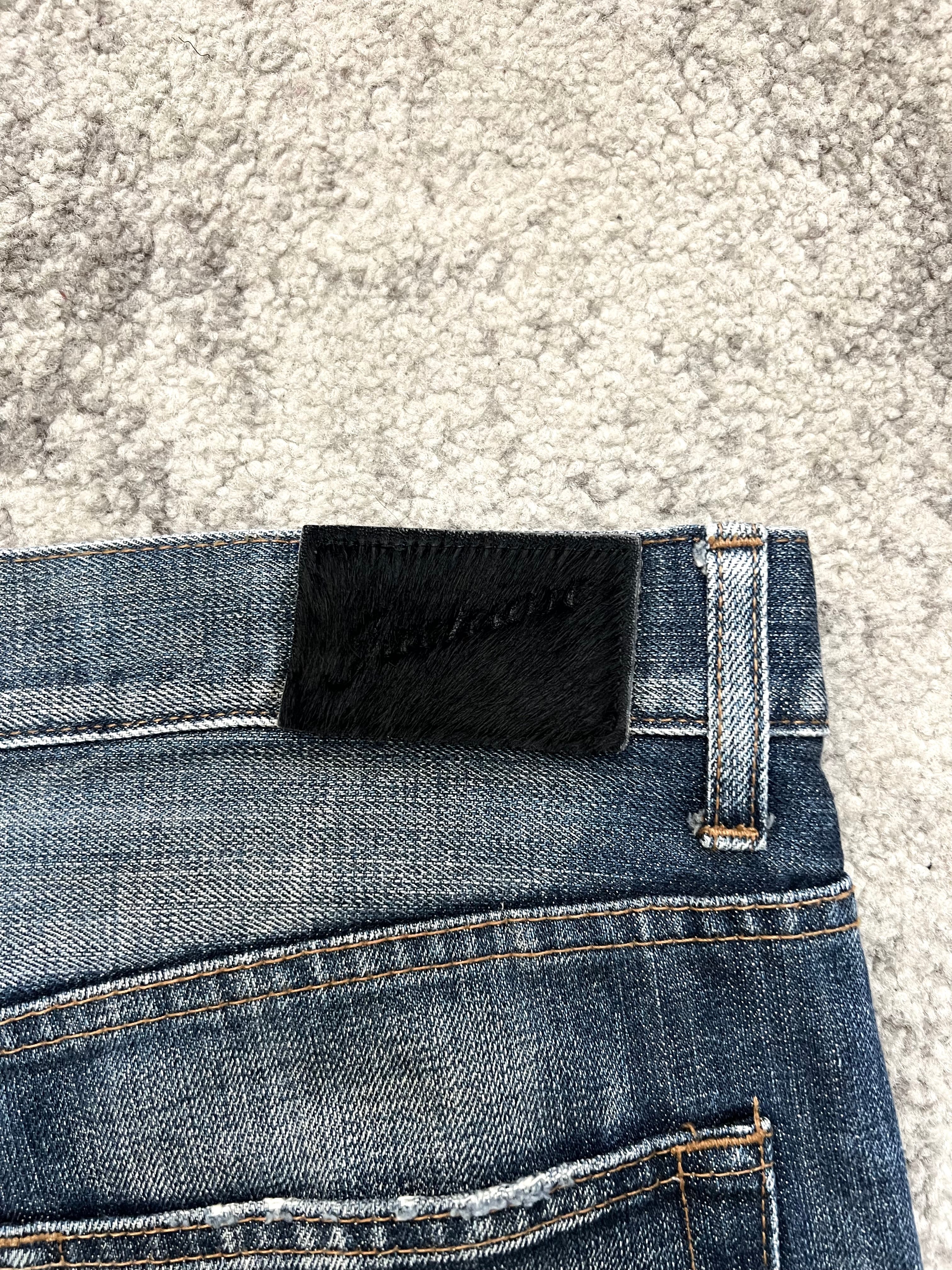 Pre-owned, gently distressed. Natural whiskering, faded thighs, and knee rips that feel earned — not factory-forced.