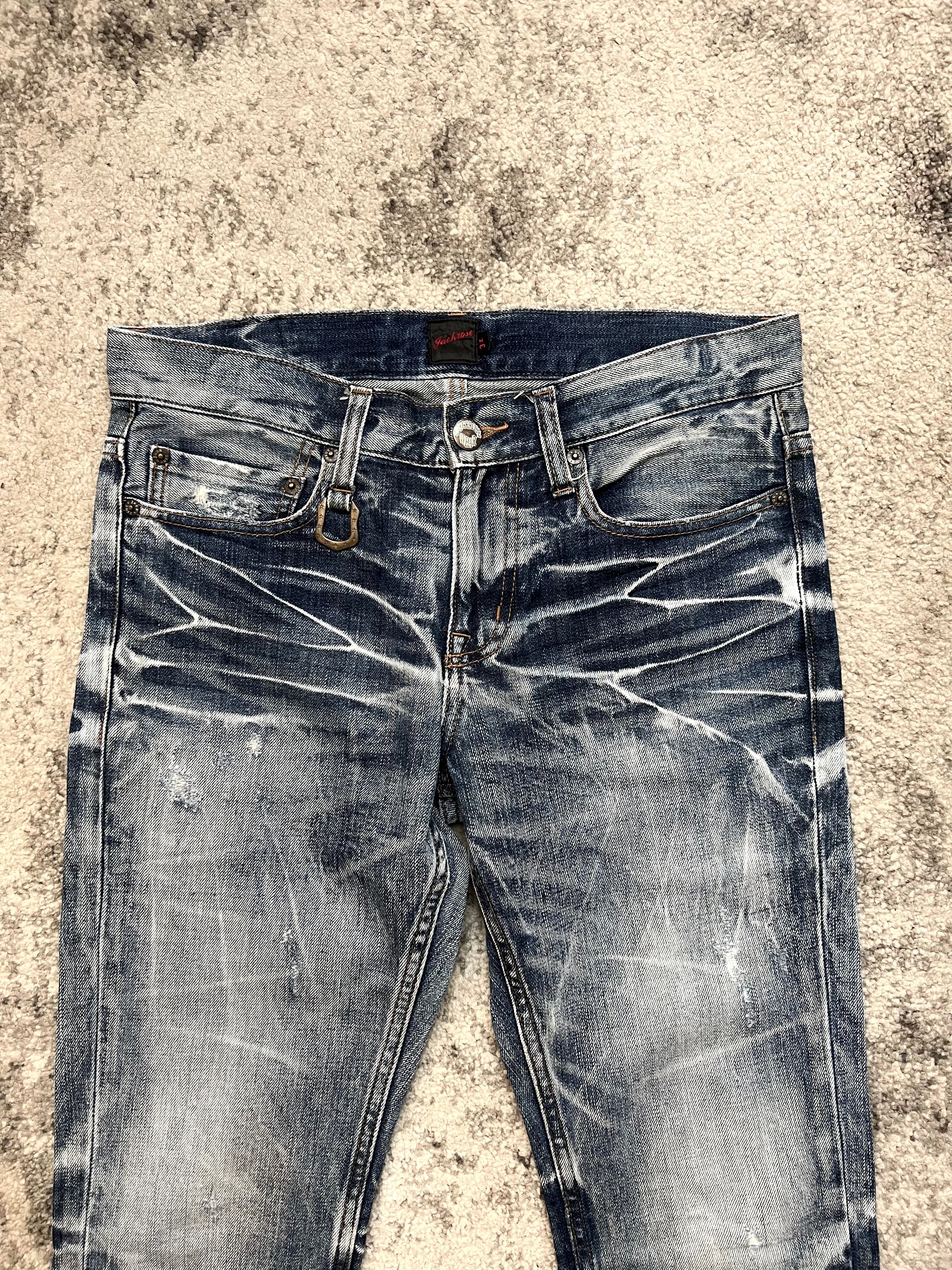 Japanese stretch denim with structured drape. Washed to hell and back – heavy fading, contrast whiskers, and hand-finished bleachwork throughout.