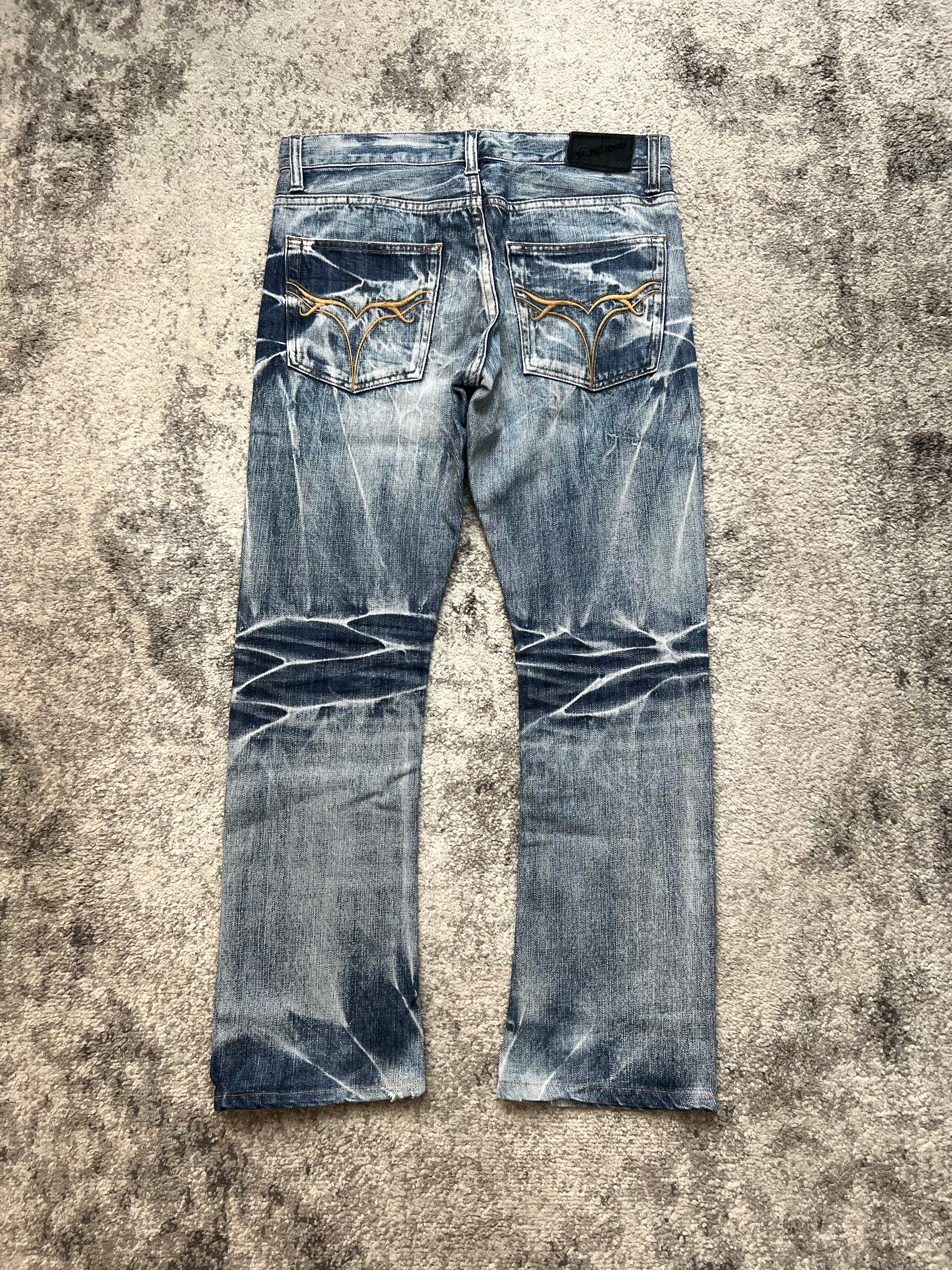 Mid-rise slim with slight flare – made to stack. D-ring belt loop detail up front. Rear pockets hit hard with golden barbed embroidery – signature Jackrose flex.