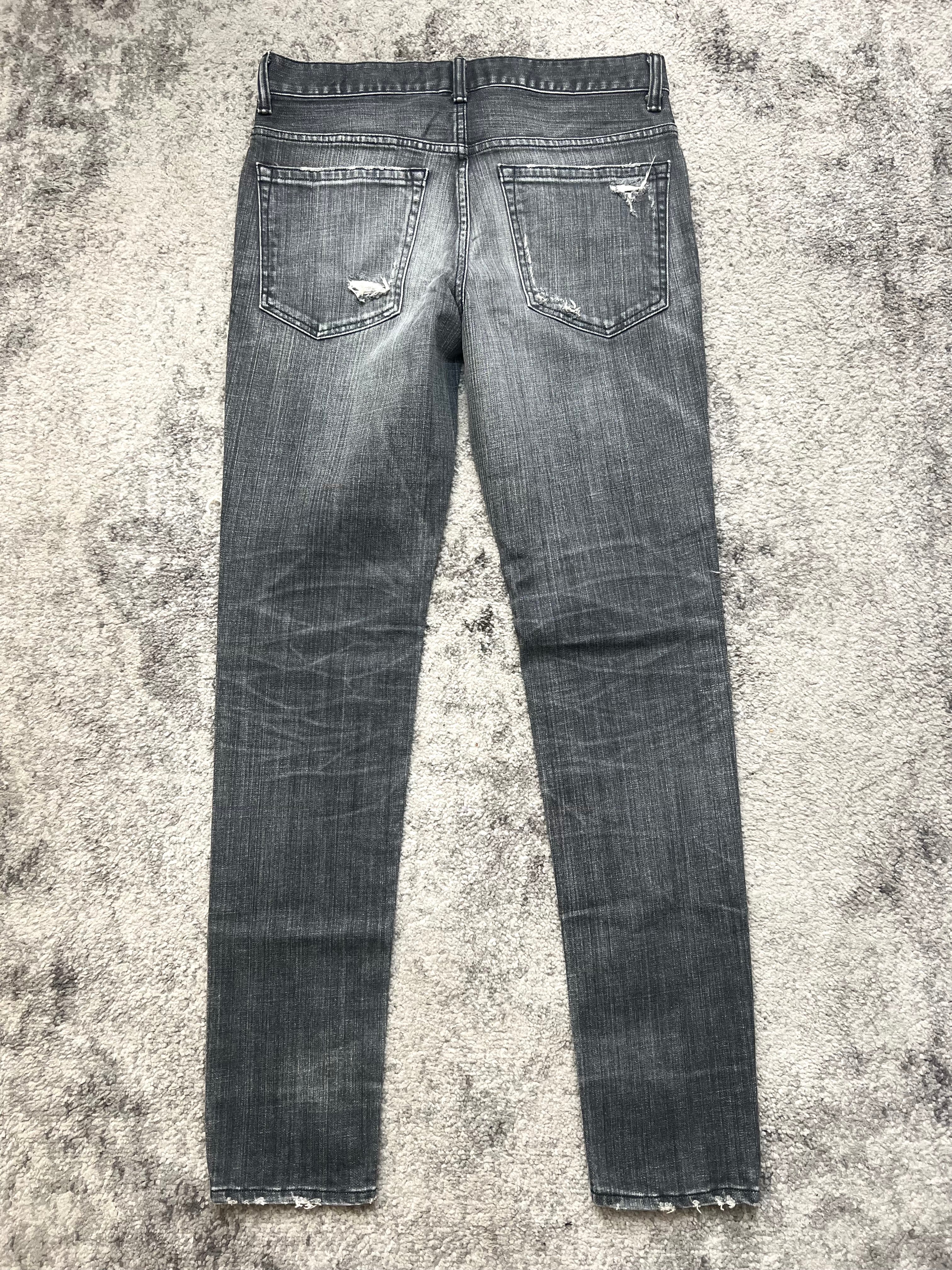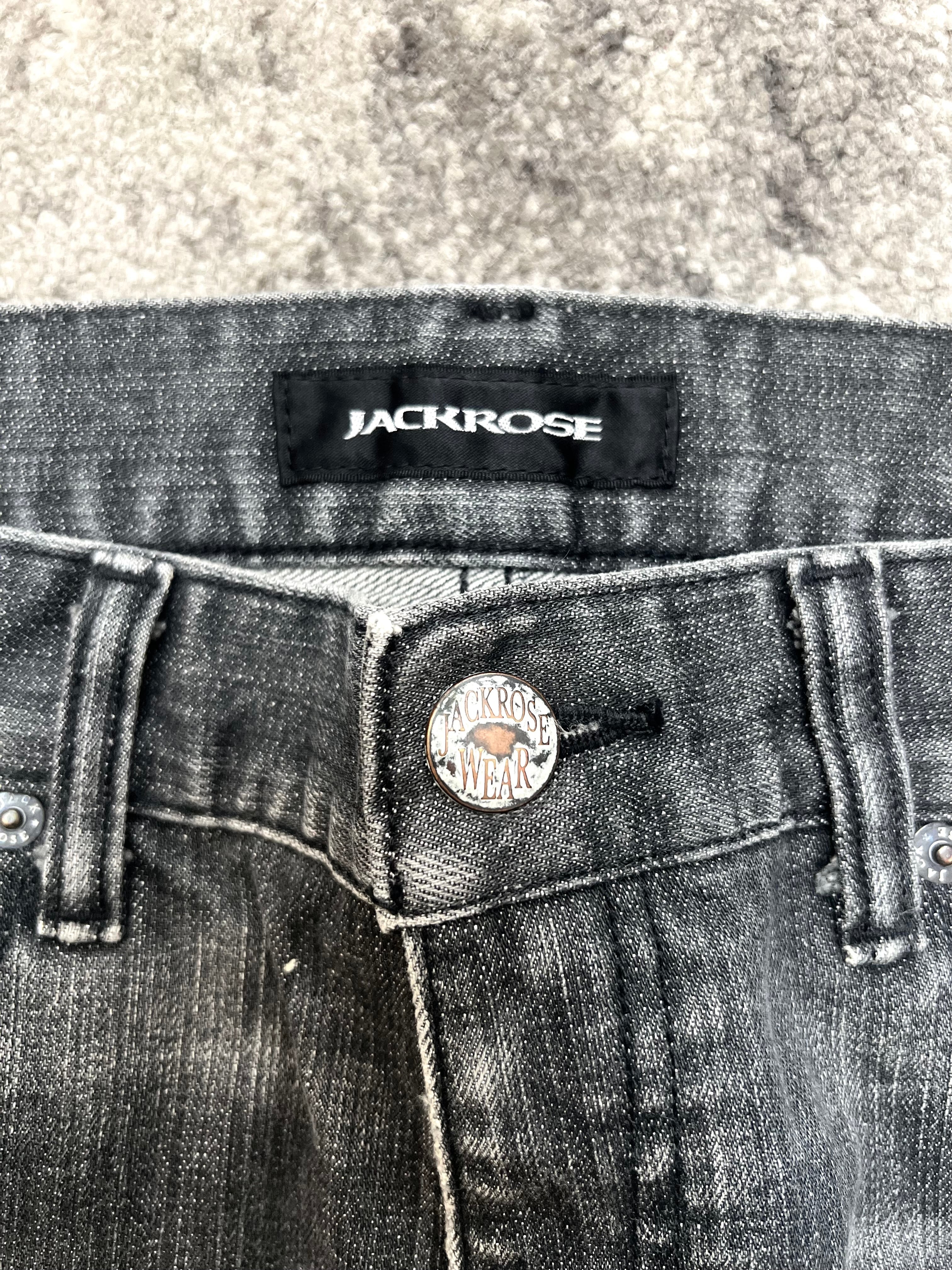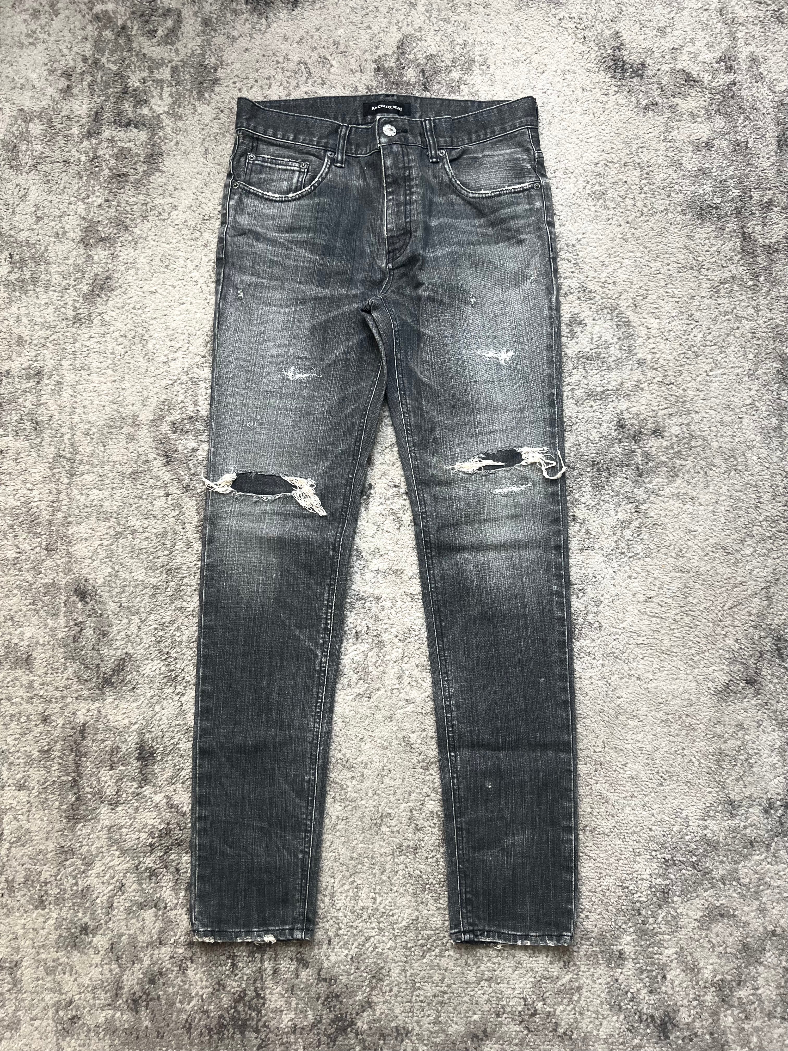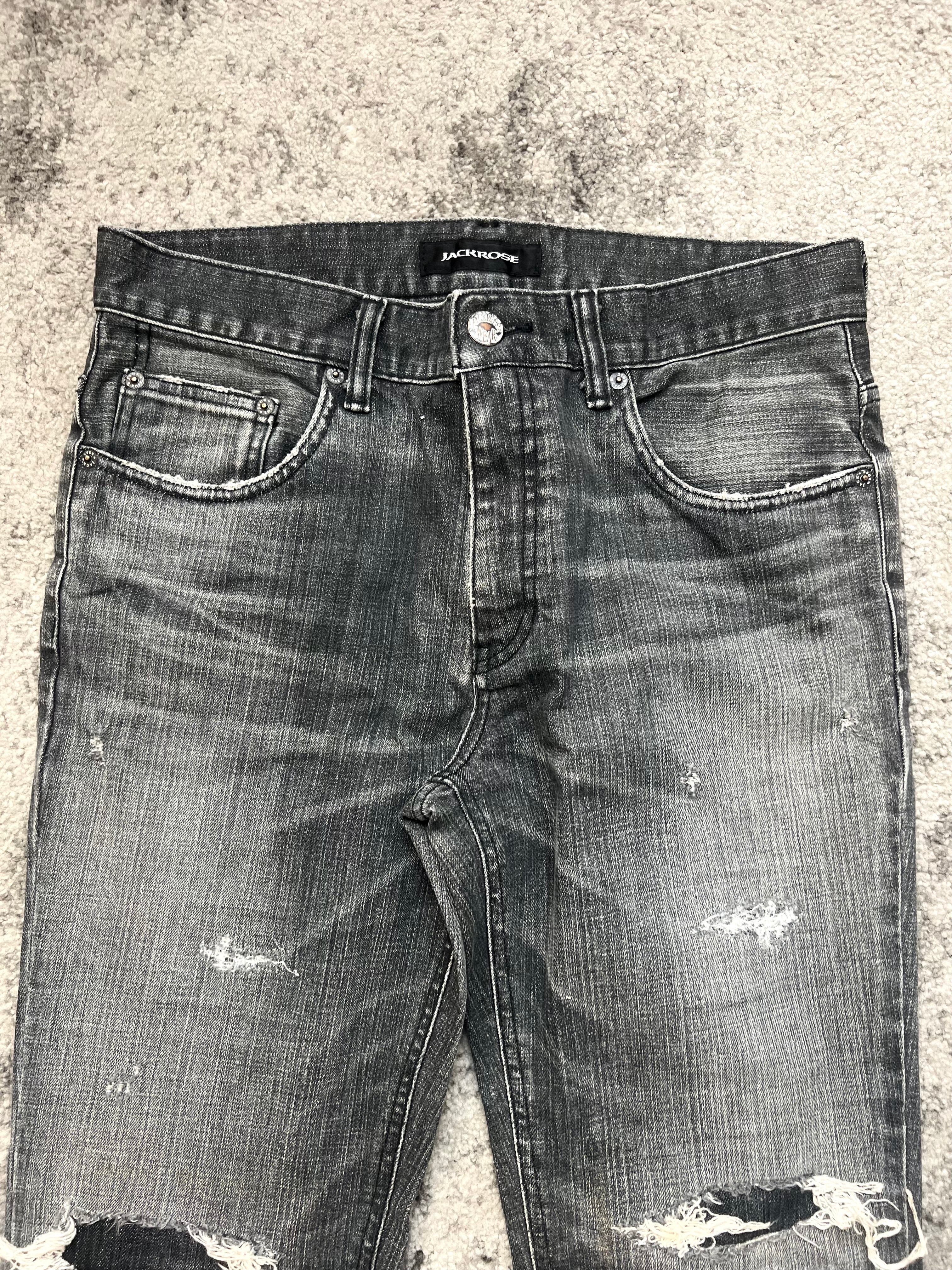 Slim cut through the legs, low-rise silhouette. Faded thigh-whiskering, distressed knees, raw hems—meant to be lived in, not just worn. “Jackrose” label intact, but this one speaks louder in silence.