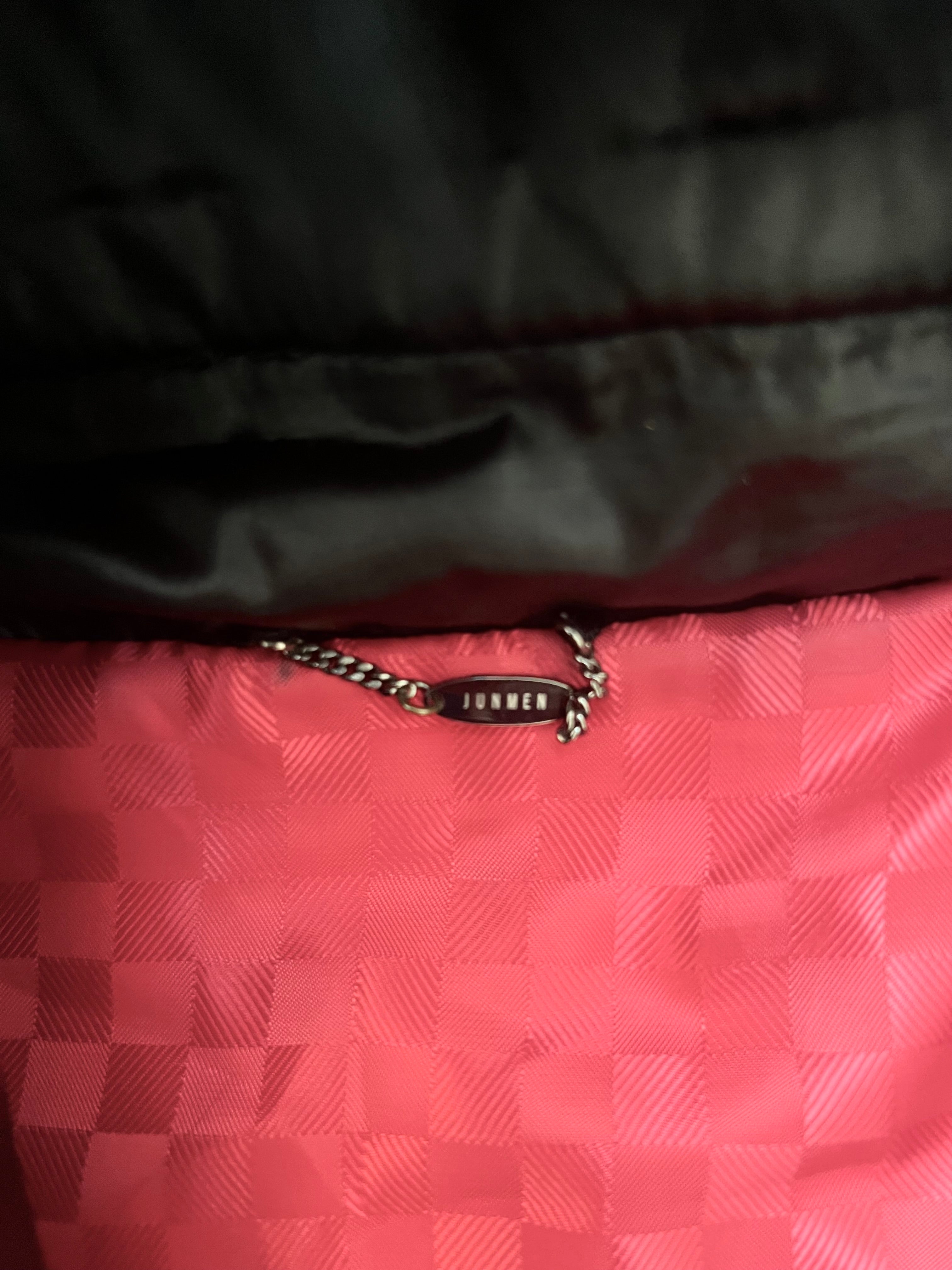 This isn’t just outerwear – it’s Tokyo winter energy, sleek and restless. Junmen crafts a jacket with a glossy black shell, fur-trimmed hood, and that unexpected red lining – a secret blaze under the cold.