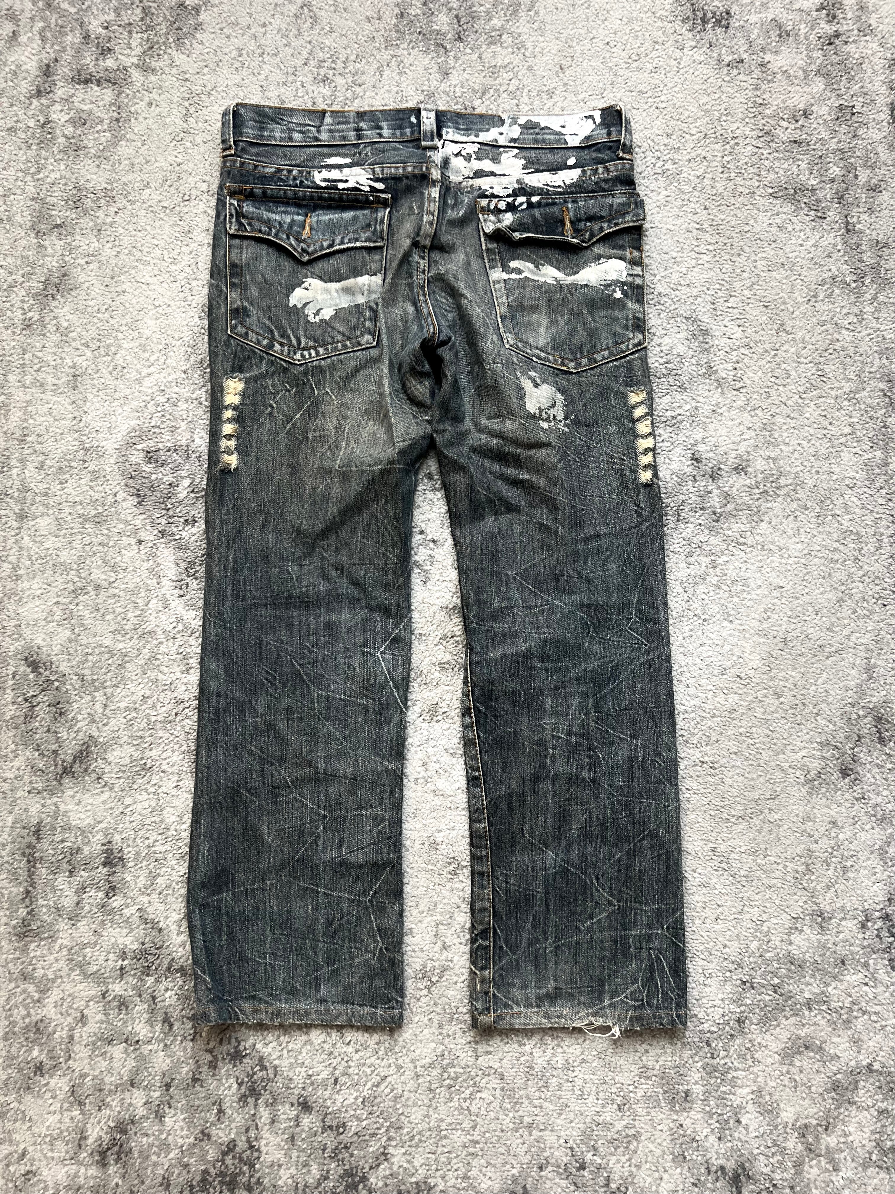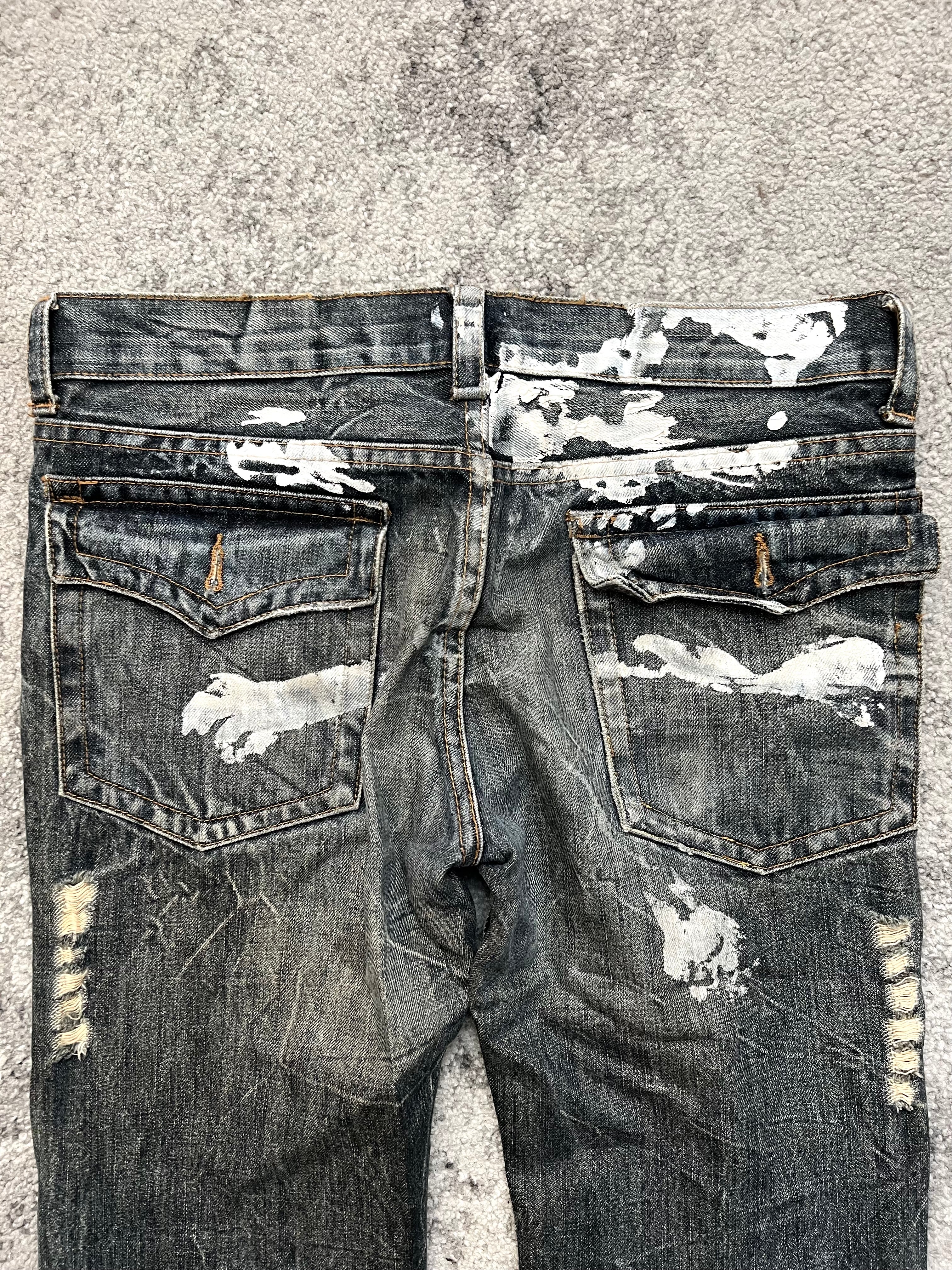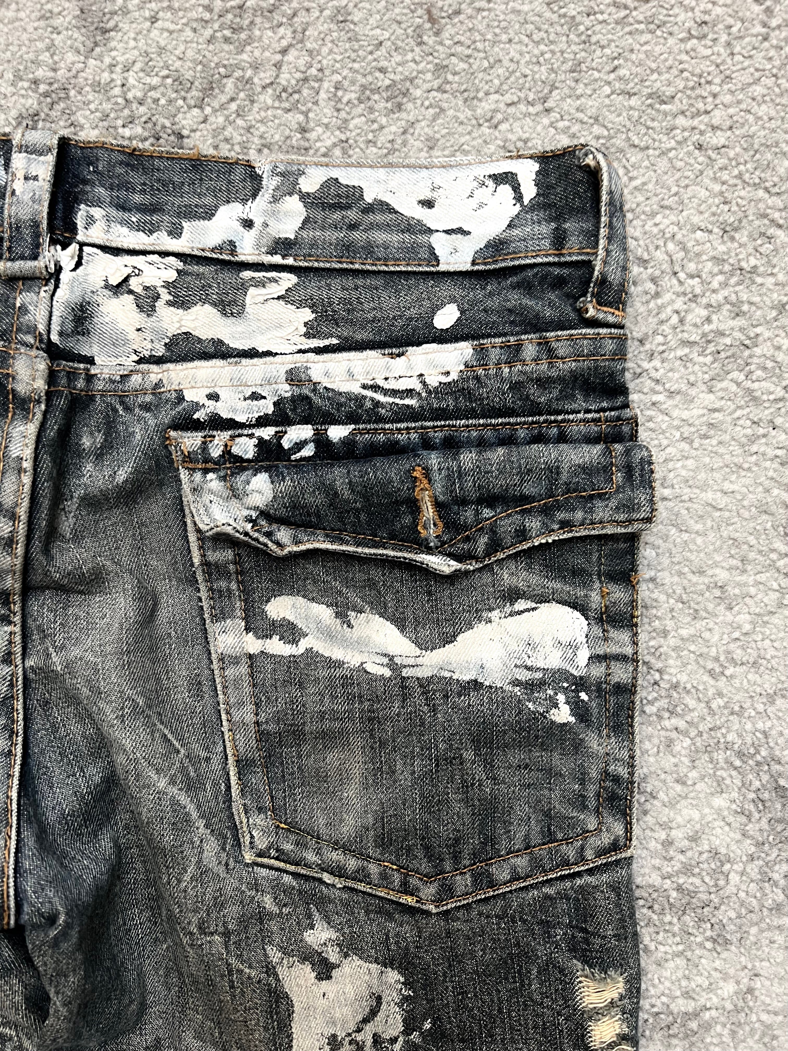Condition: Pre-owned with heavy distressing, shredded thighs, raw abrasions, and paint-splattered ghost marks on the back—every flaw a badge of rebellion.