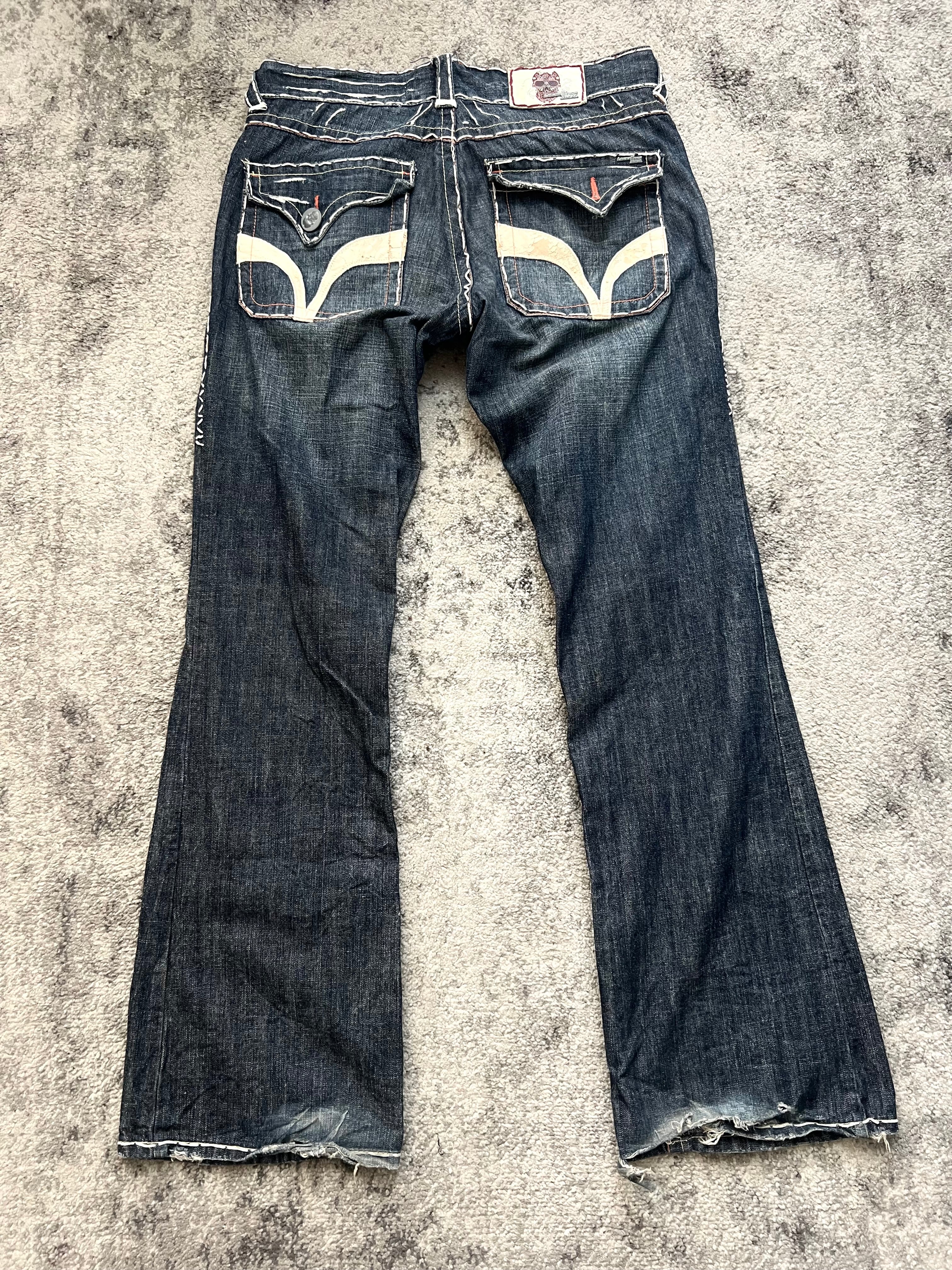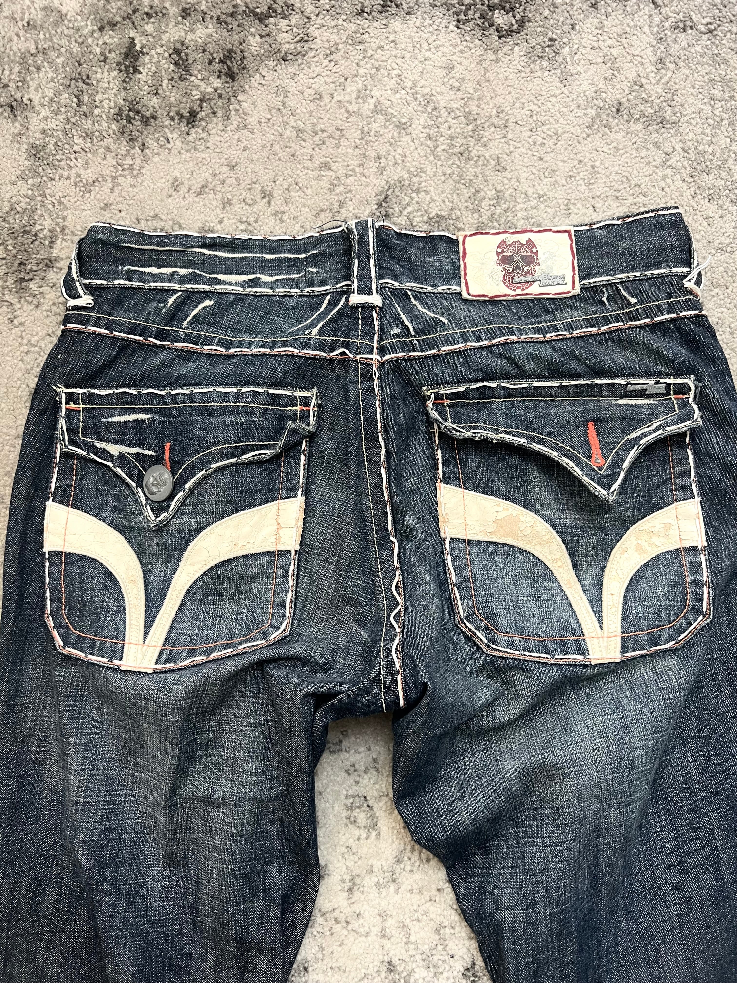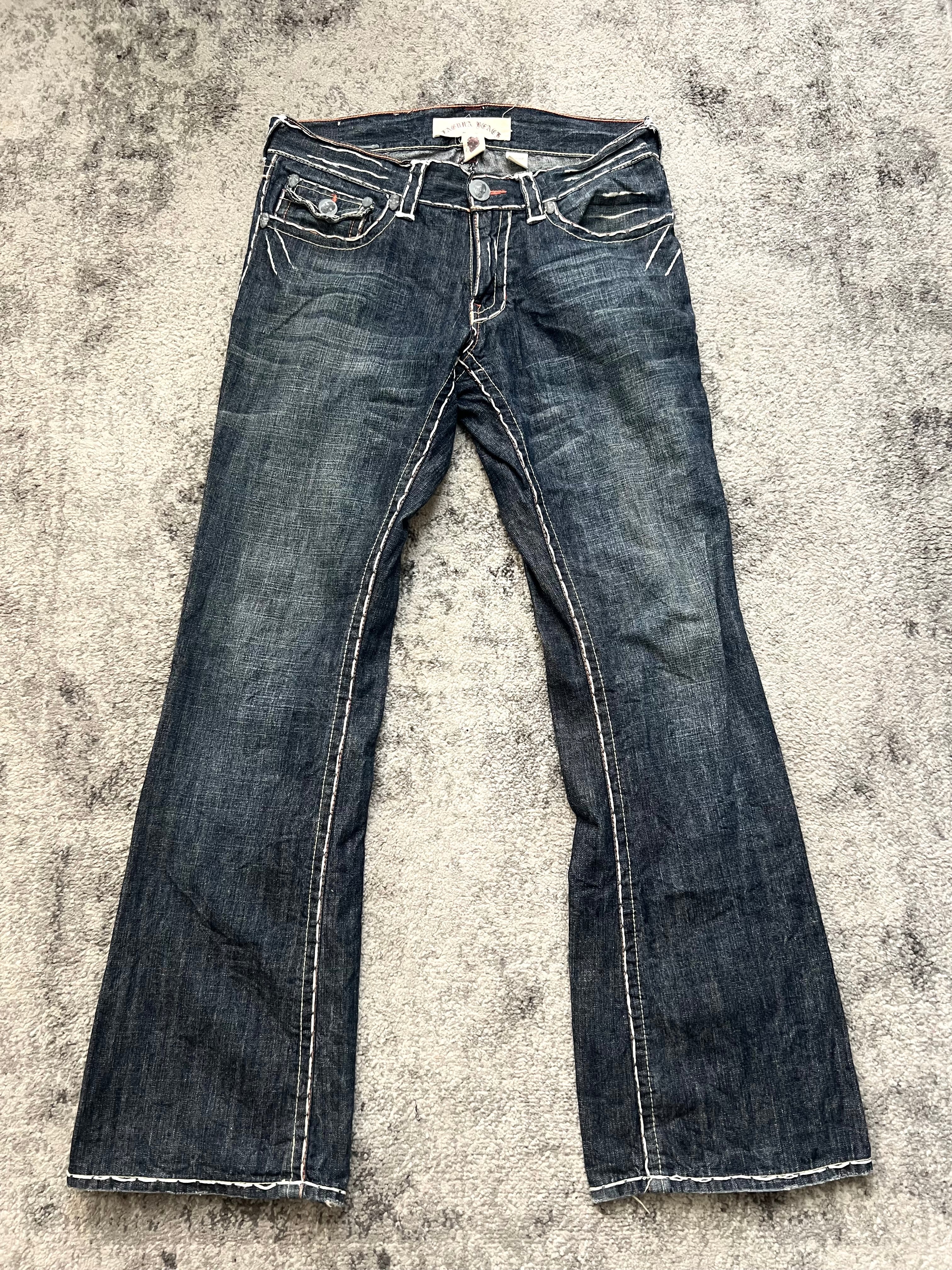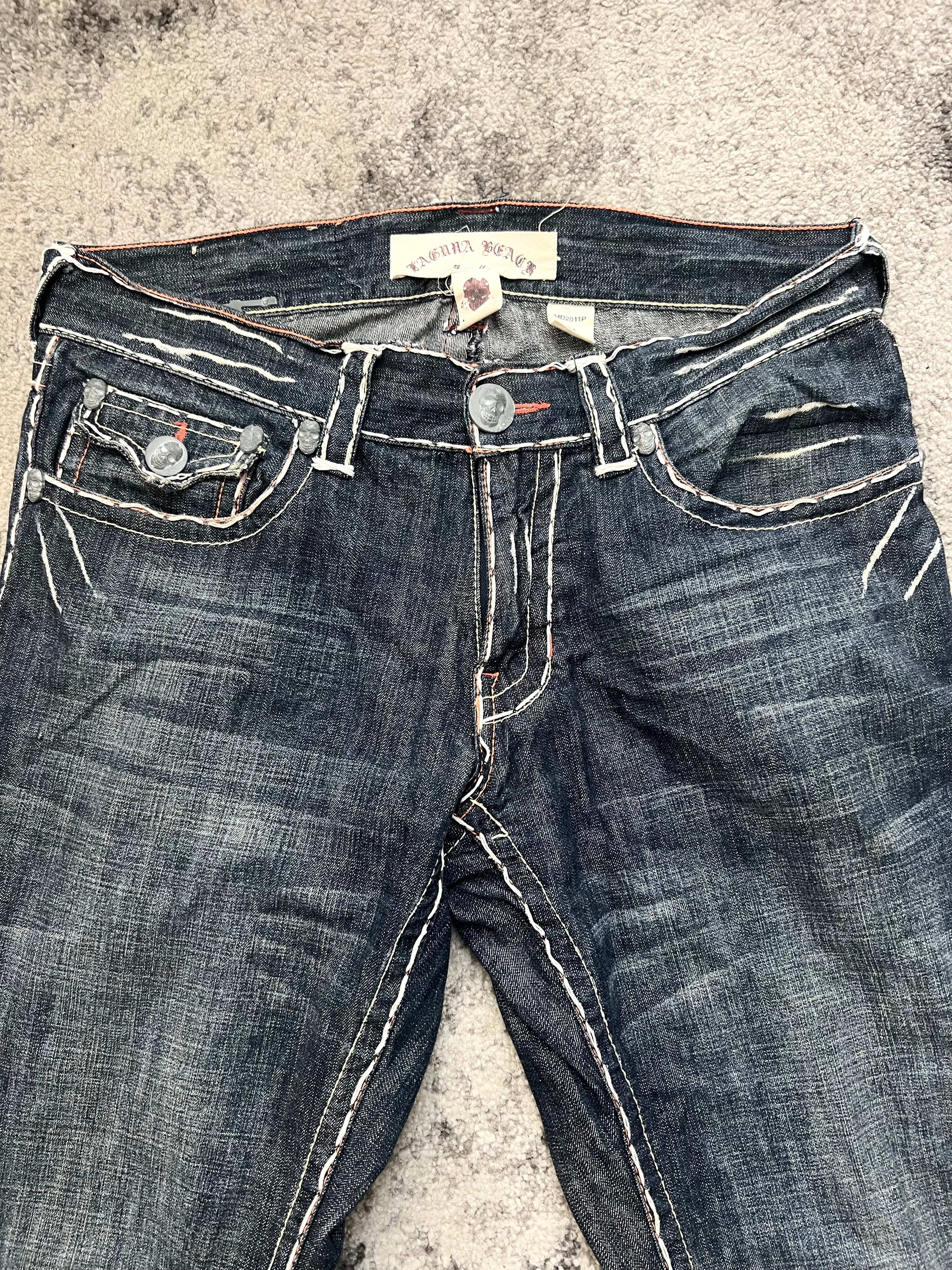 Low rise, wide bootcut fit. Designed to stack, sag, and move like it owns the pavement. Classic Y2K Laguna silhouette with a hint of Americana overstimulation.