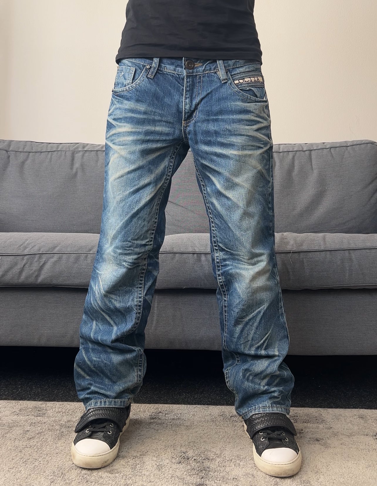 Soft but sturdy Japanese denim. Midweight, minimal stretch. A mellow vintage blue with authentic fading and whiskers.