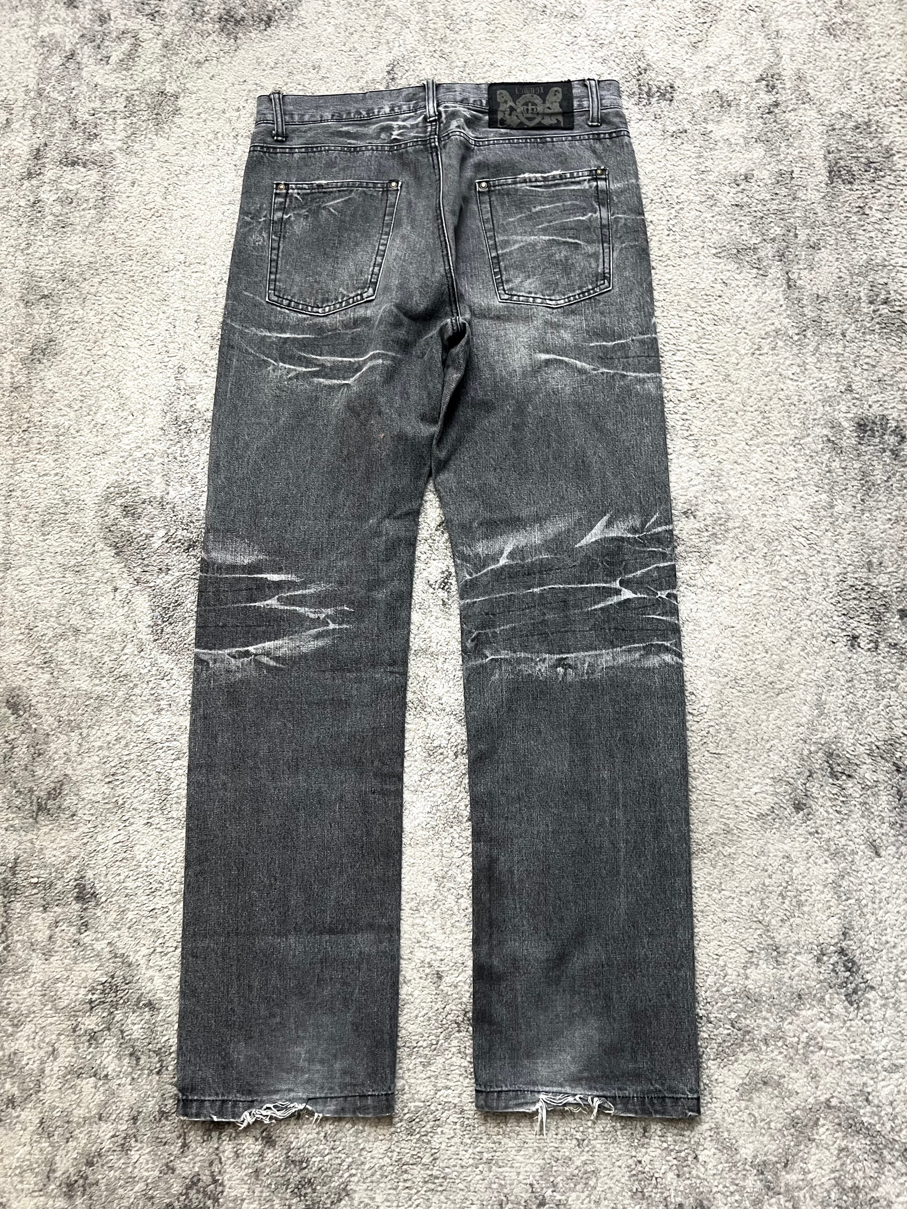 Condition: Pre-owned with heavy fades, whiskering, and shredded hems. The wear is part of its soul—every line and abrasion etched in authenticity.