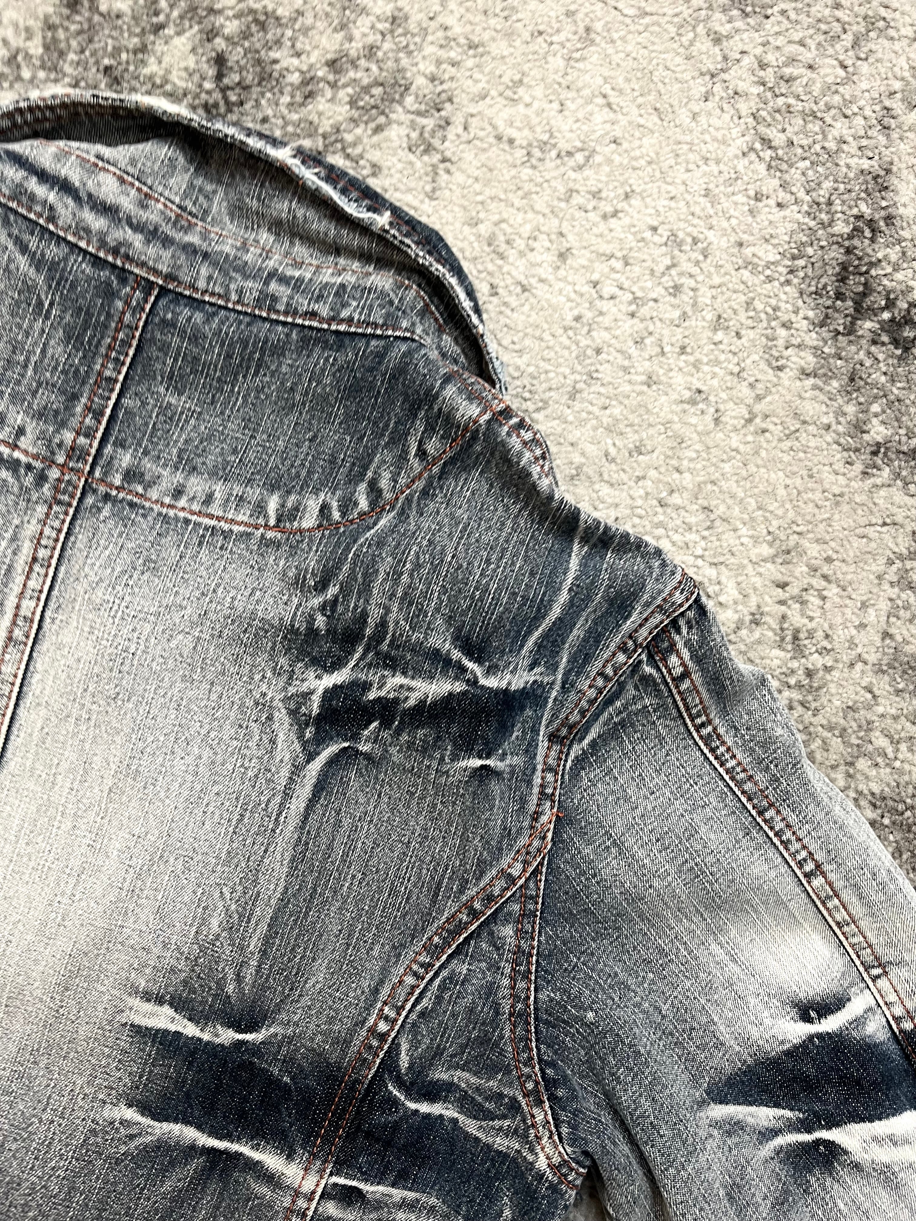Slim tailored cut with aggressive distressing across arms and body. Unique zip chest pocket detail. Deep contrast fades and stacked creasing for a true archive silhouette. Looks best layered over graphic tees or rugged basics.