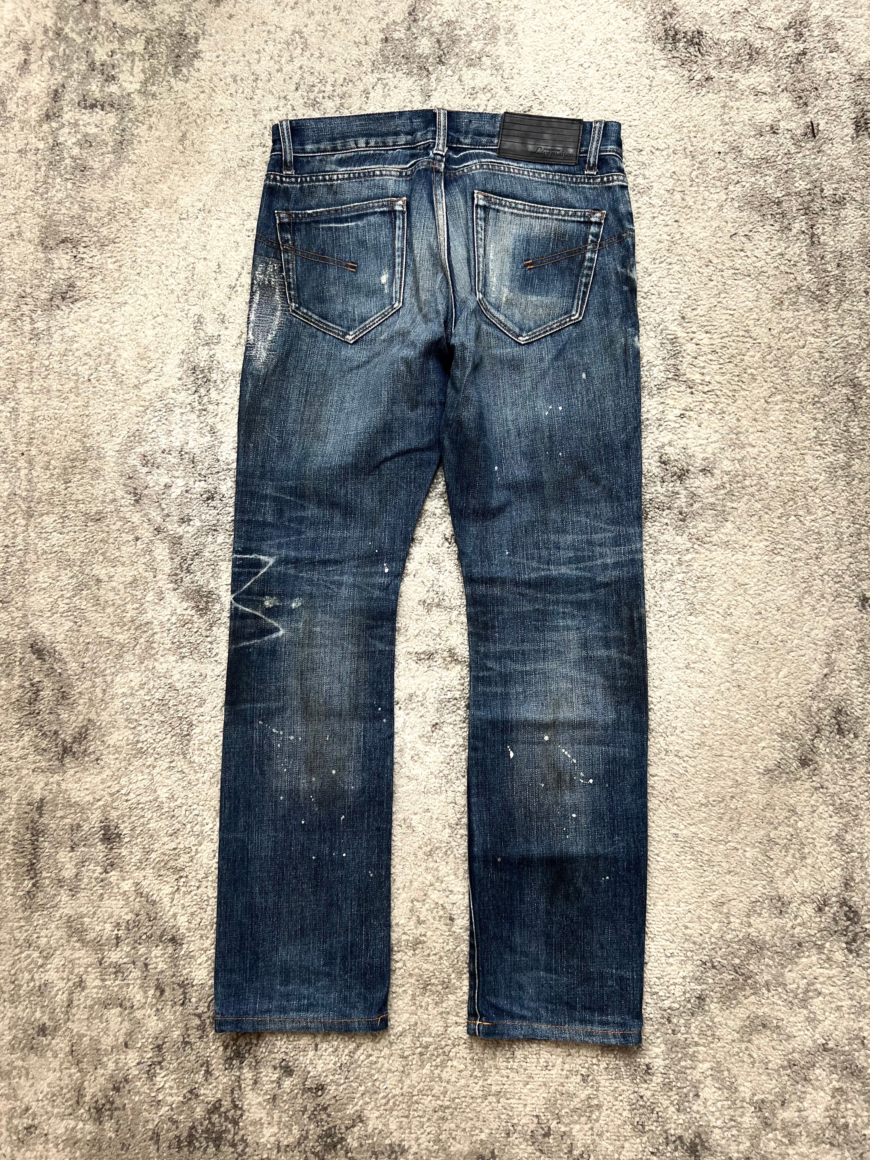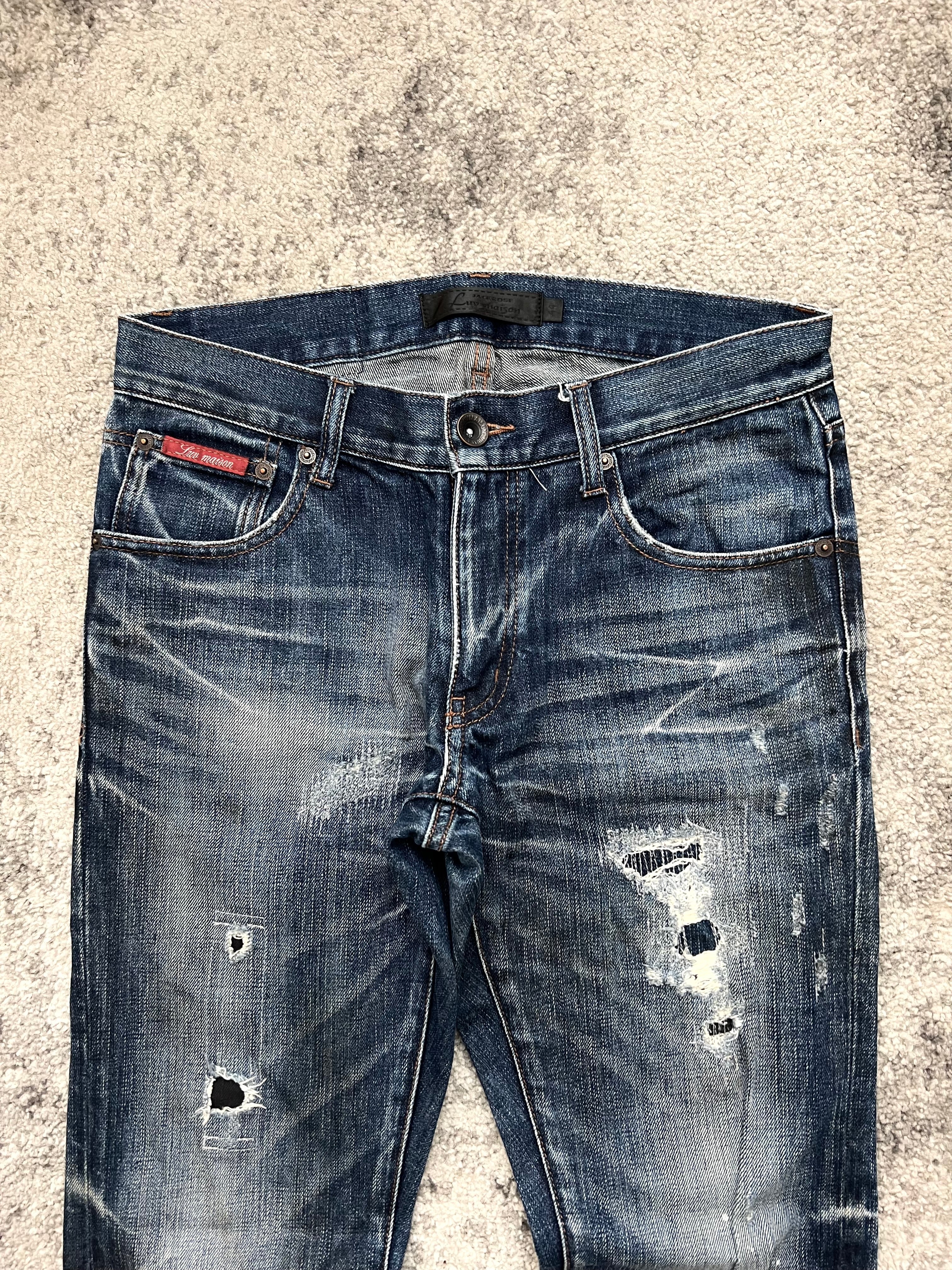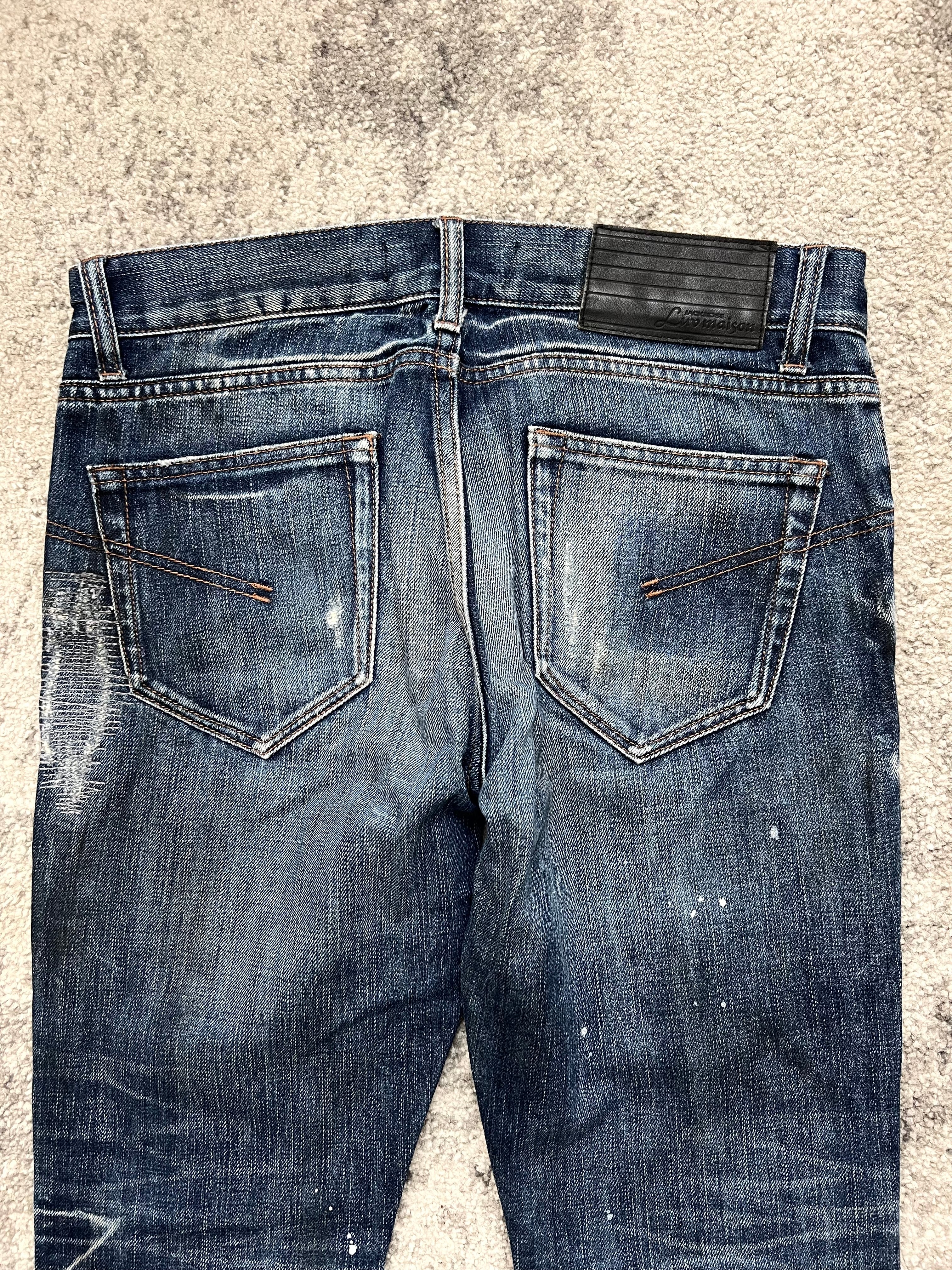 Pre-owned, with expressive distressing. Worn-in abrasions, intentional tears, and light paint flecks. Heavy fade through thighs and back knees — raw and real.