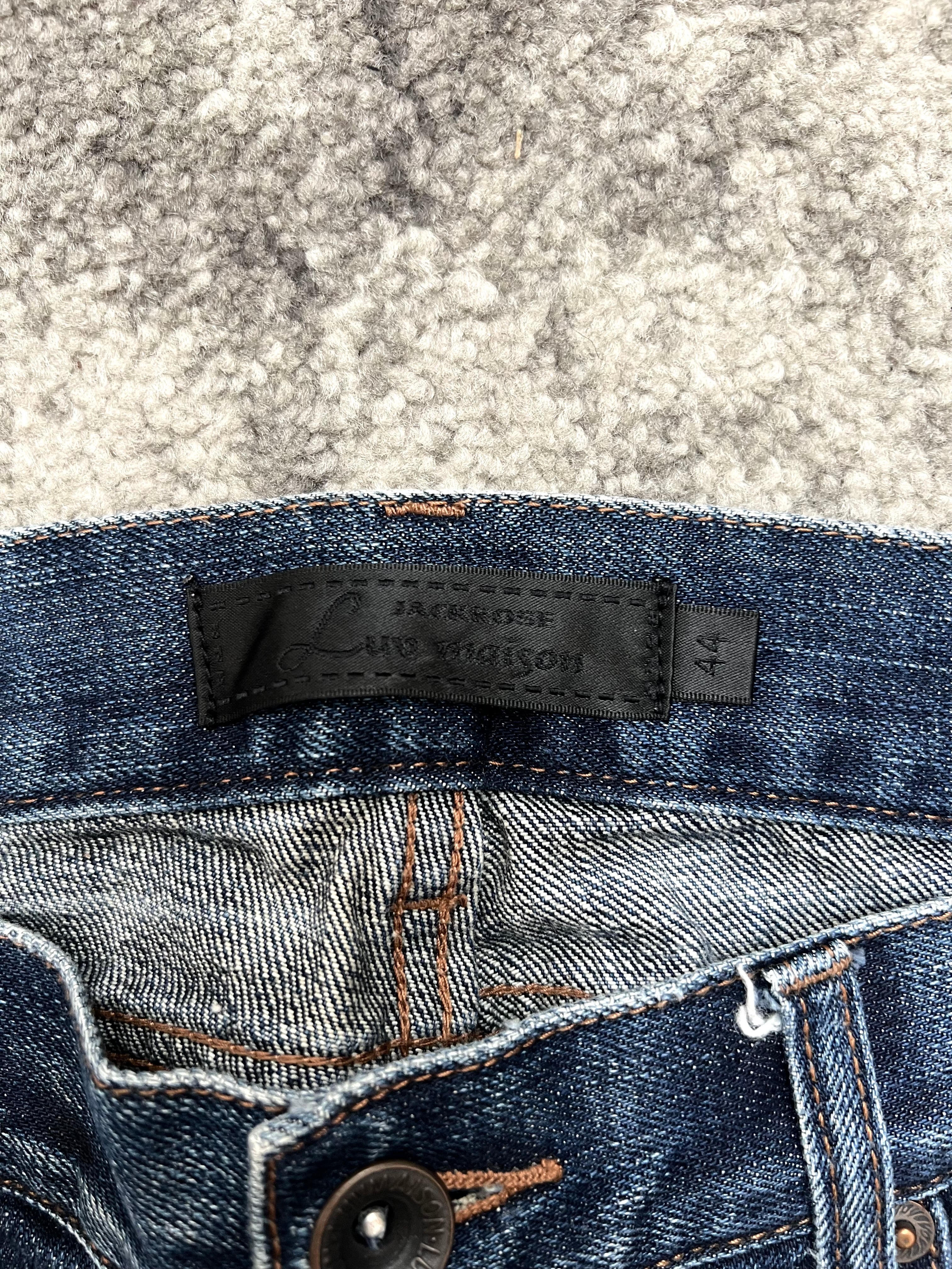 Classic five-pocket cut with raw hems and dark copper stitching