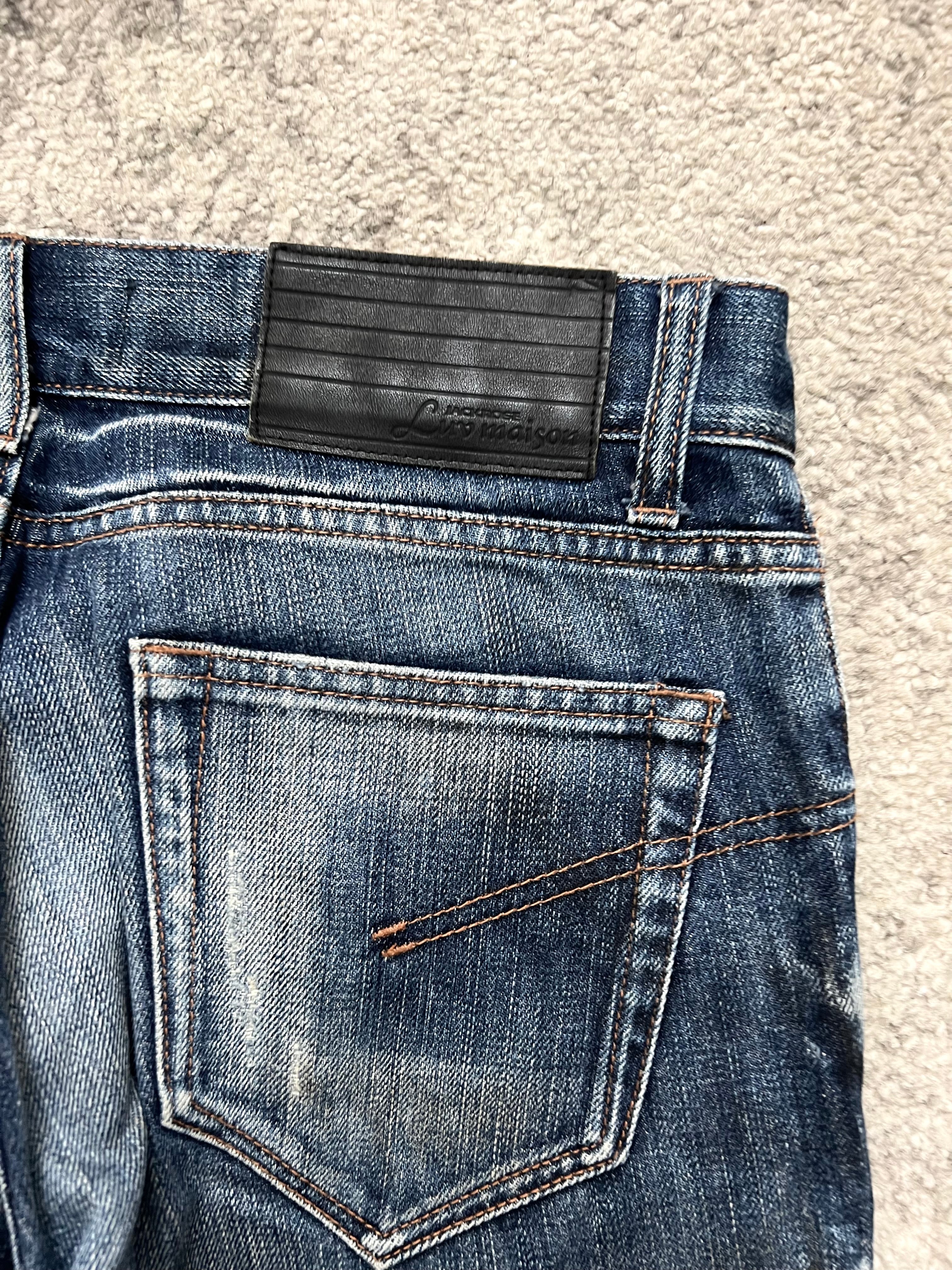 A pair that feels like feedback from a radio too far gone — scarred, distorted, unforgettable. Worn indigo grounded by streaks of static white, with punctured knees and whispering threadbare zones. A shape caught between noise and calm.