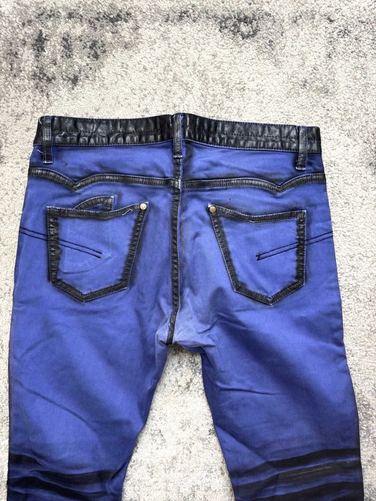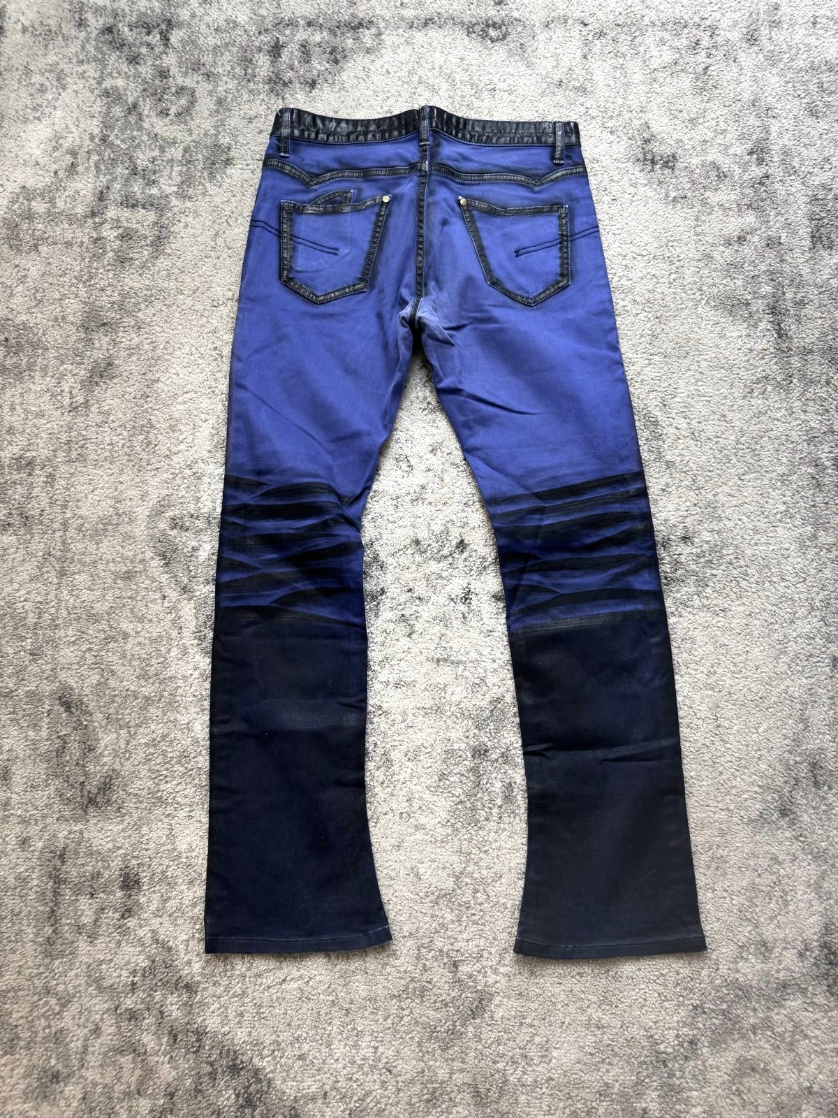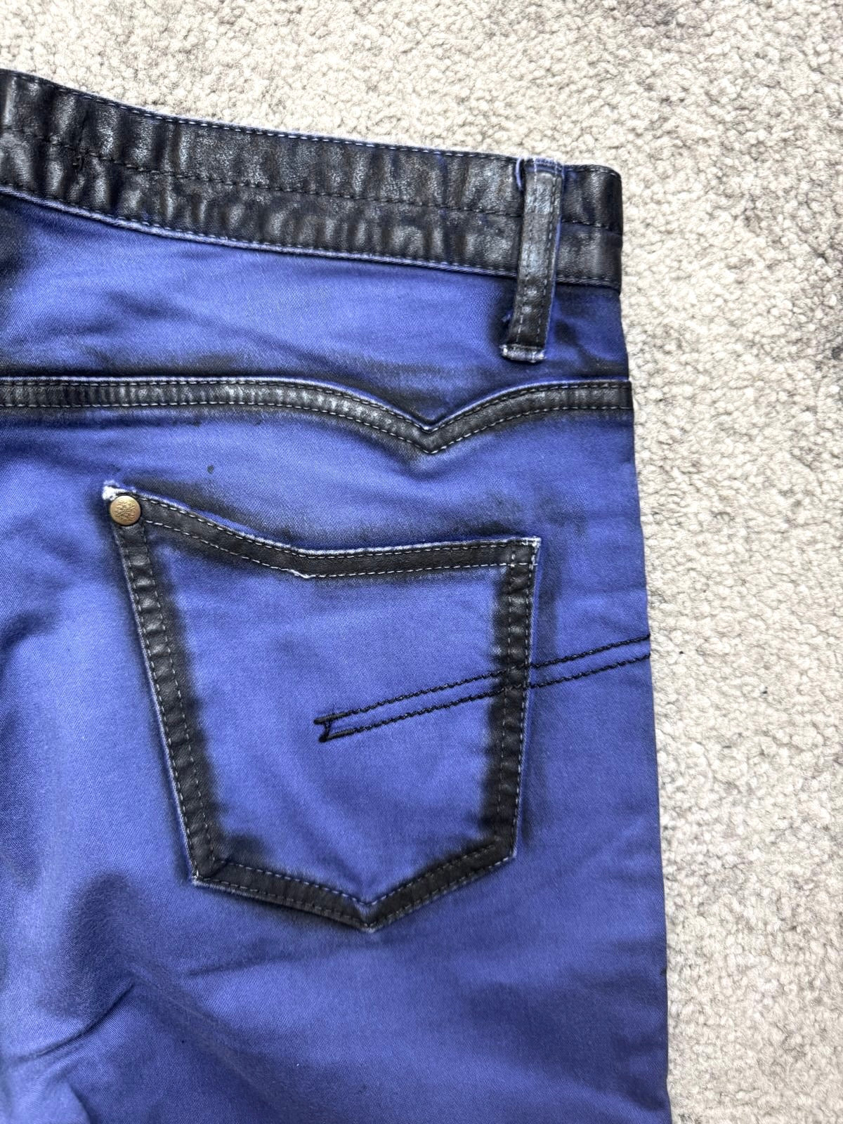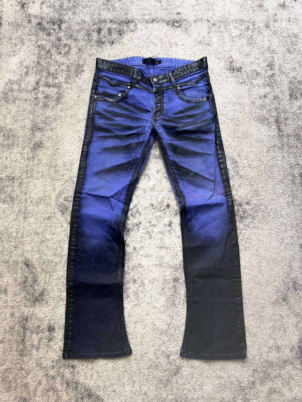 Smooth midweight Japanese cotton blend with a coated leather-look waistband and trim. Saturated violet-indigo base layered with black gradient whiskers and hem shadows.