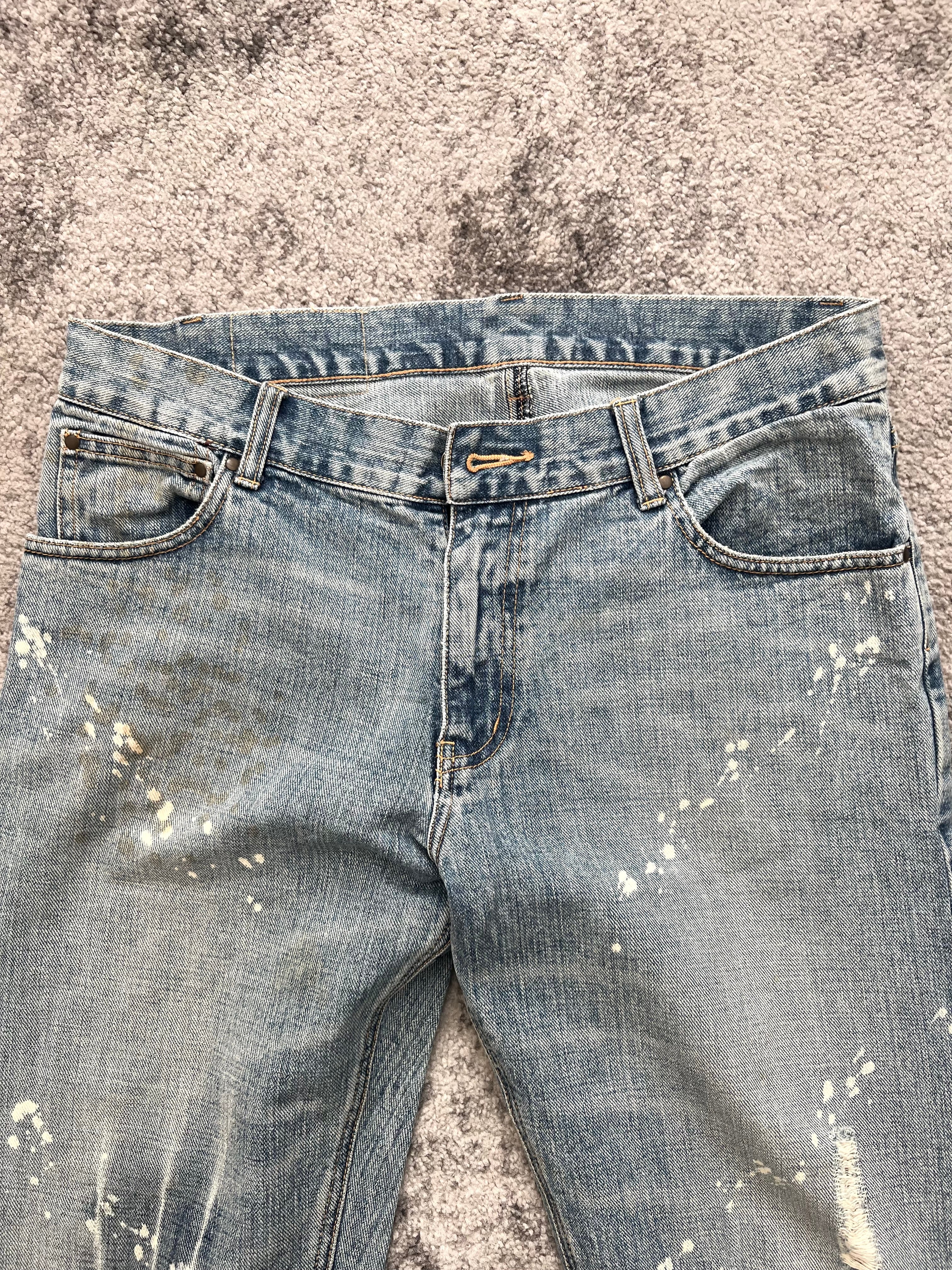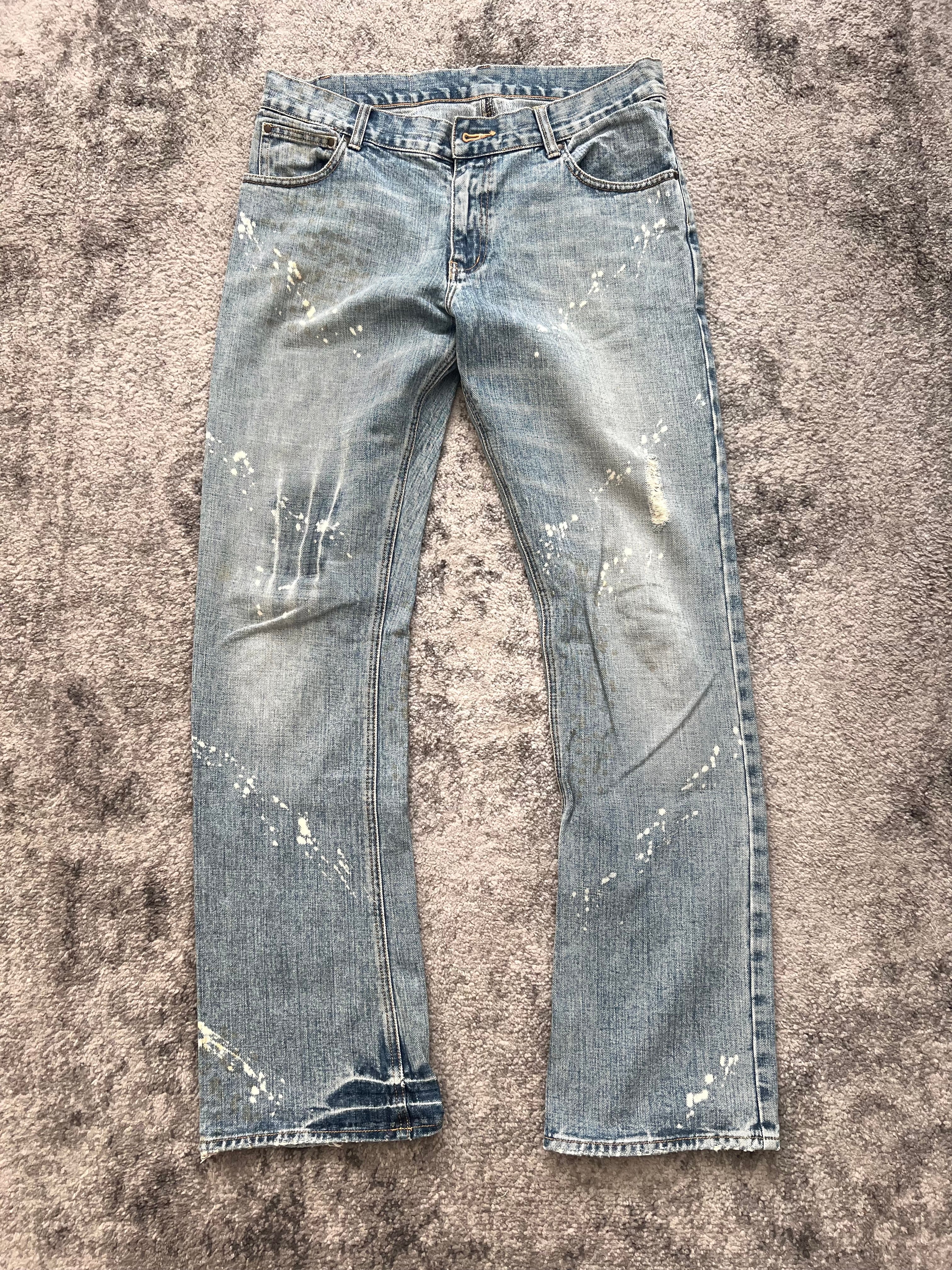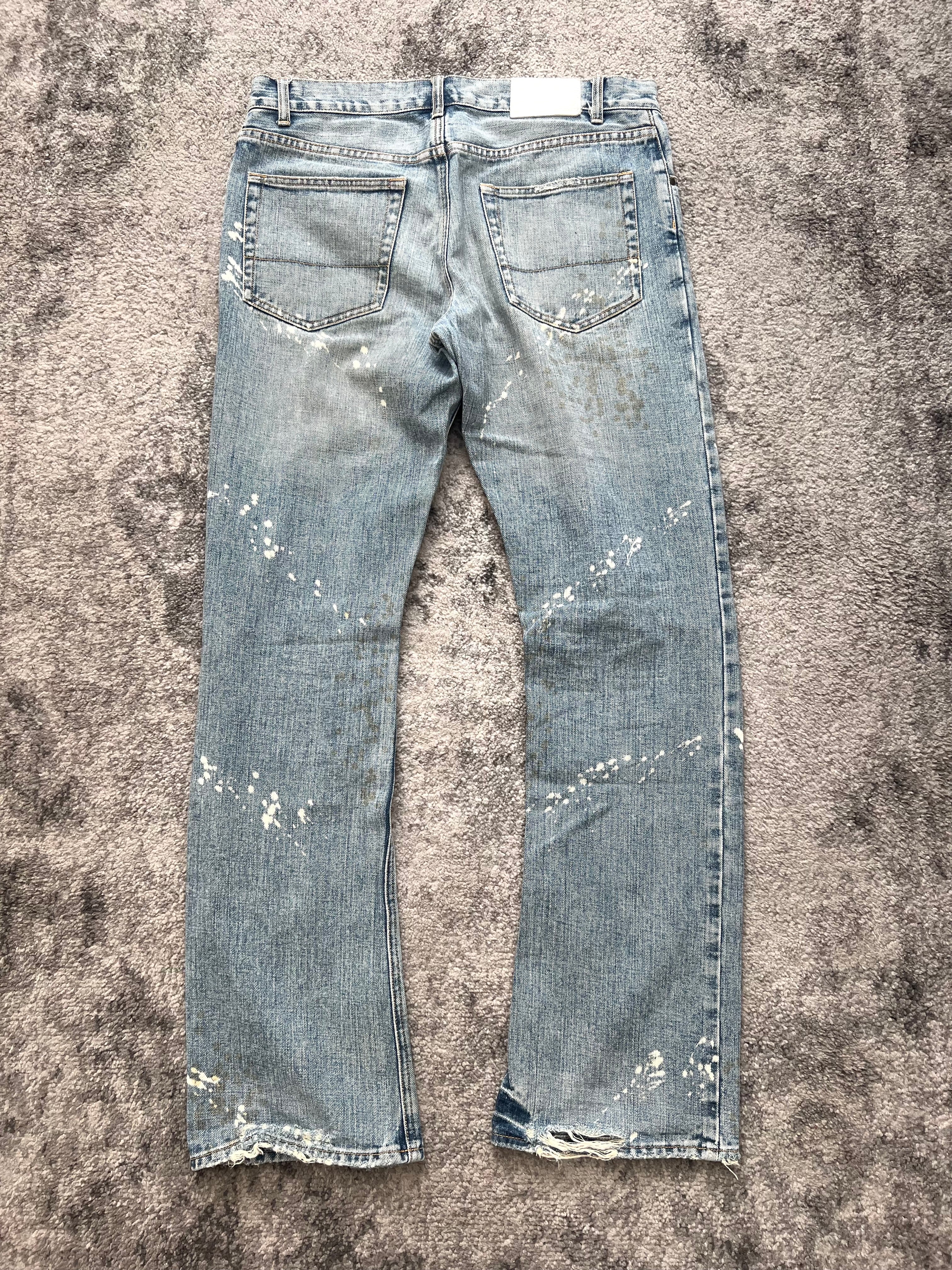 Straight-leg fit with a true vintage fade. Muted sky blue base with paint-speckled patina. Raw hem touches and quiet edge-beard at the cuffs. Think early 2000s Shibuya skate shop meets post-punk rehearsal room.