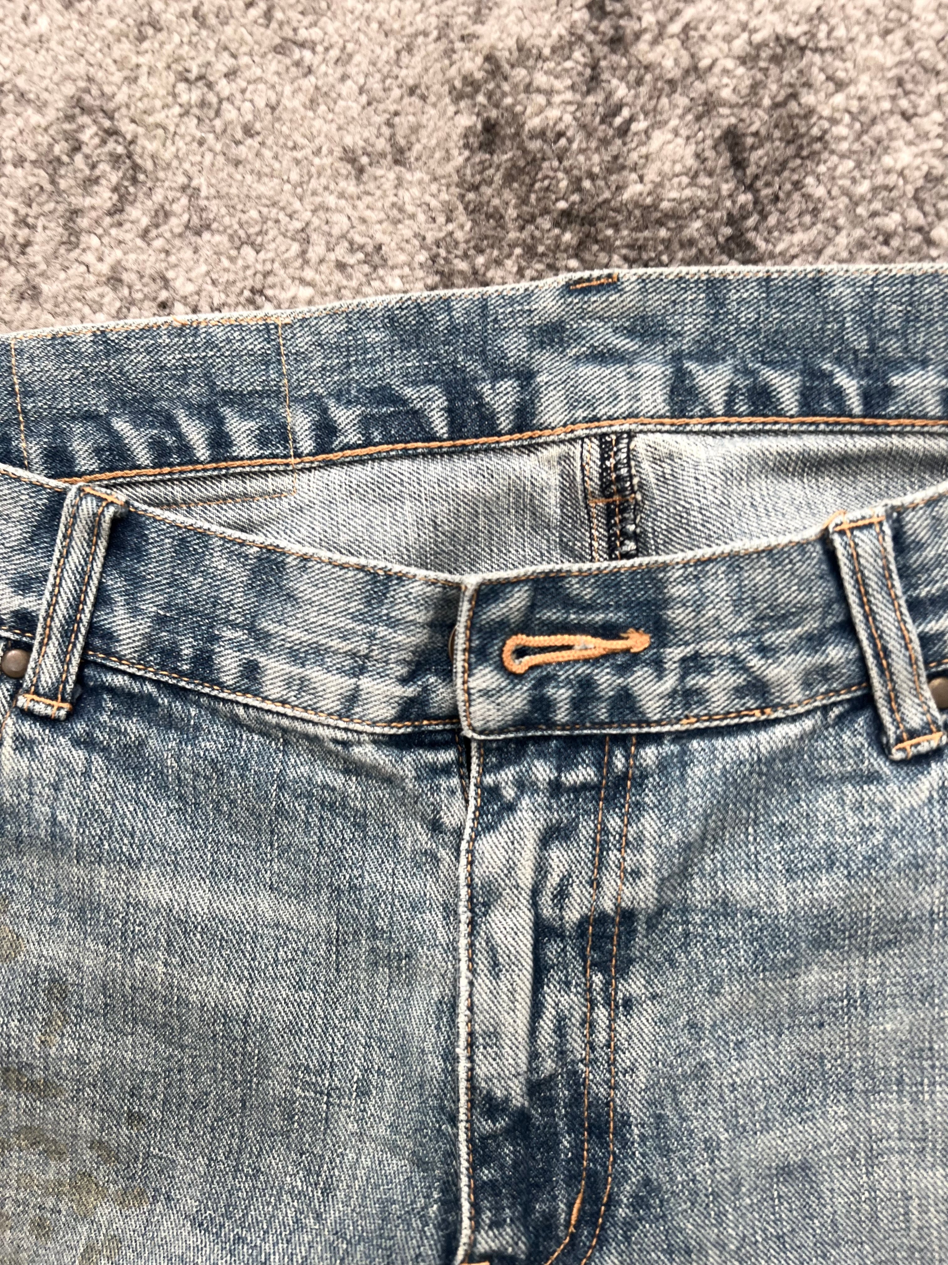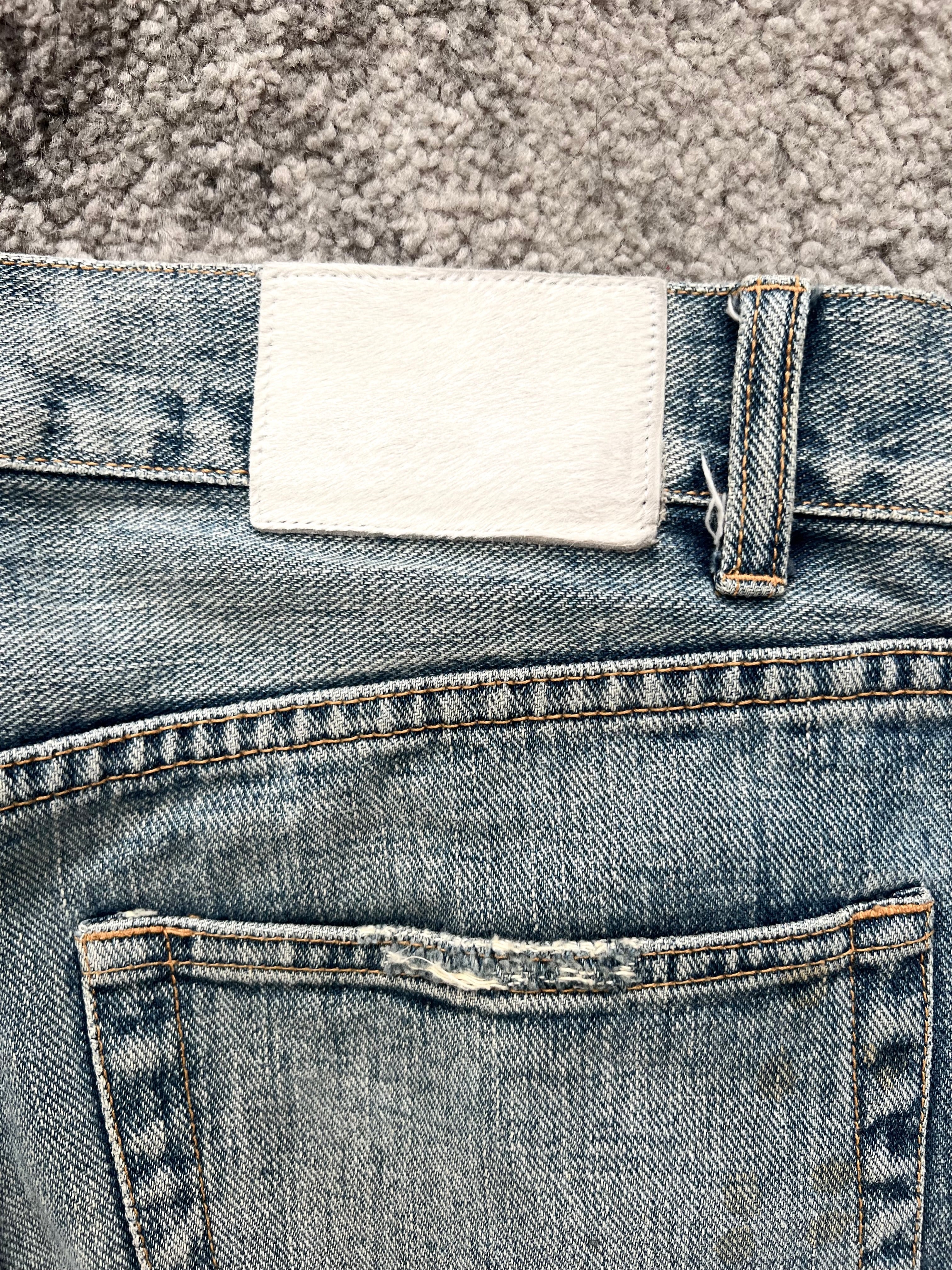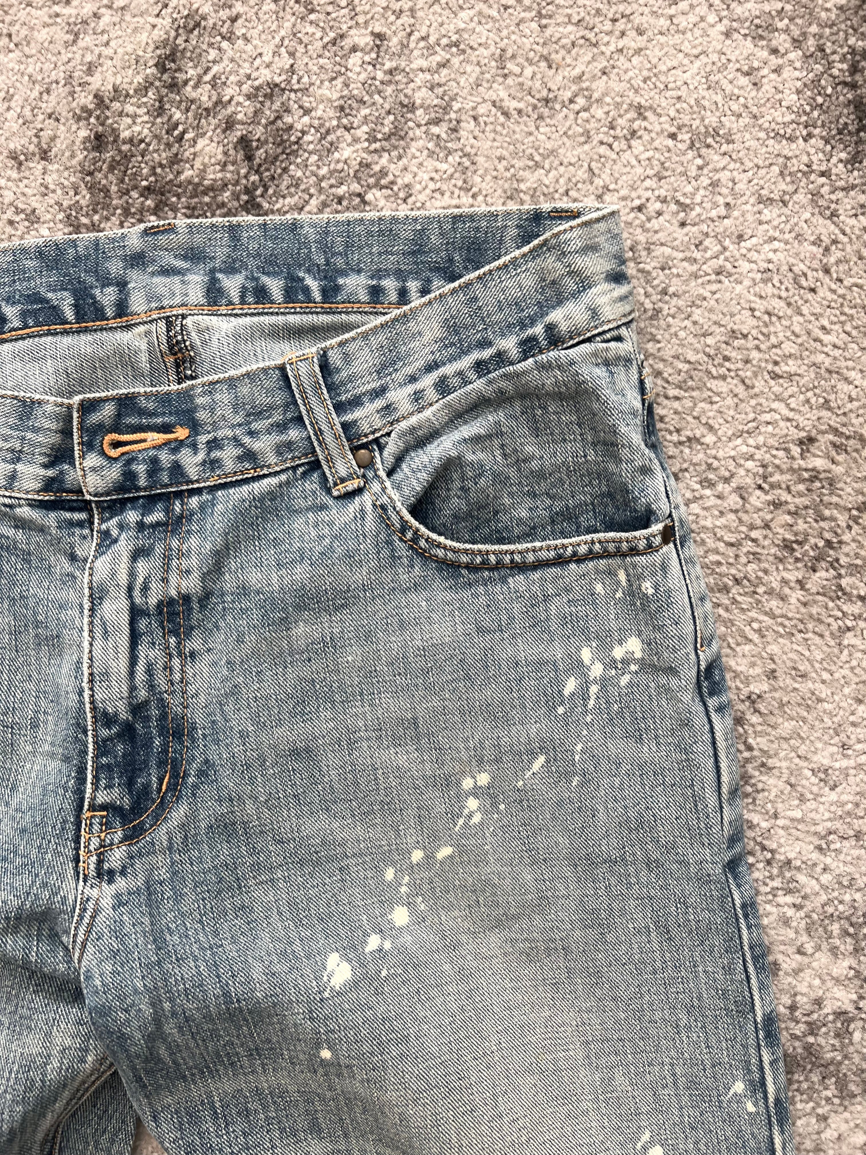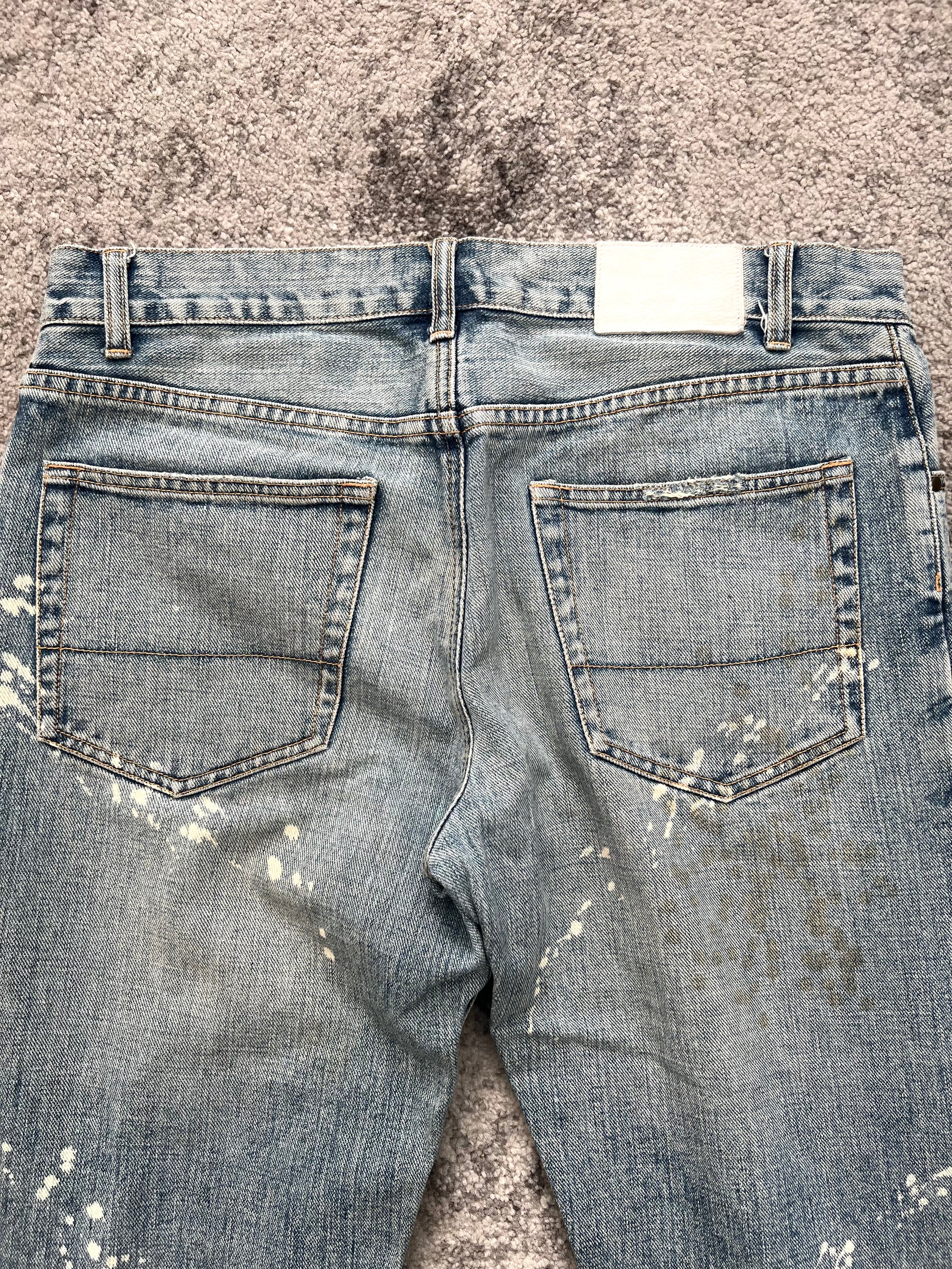 Straight-leg fit with a true vintage fade. Muted sky blue base with paint-speckled patina. Raw hem touches and quiet edge-beard at the cuffs. Think early 2000s Shibuya skate shop meets post-punk rehearsal room.
