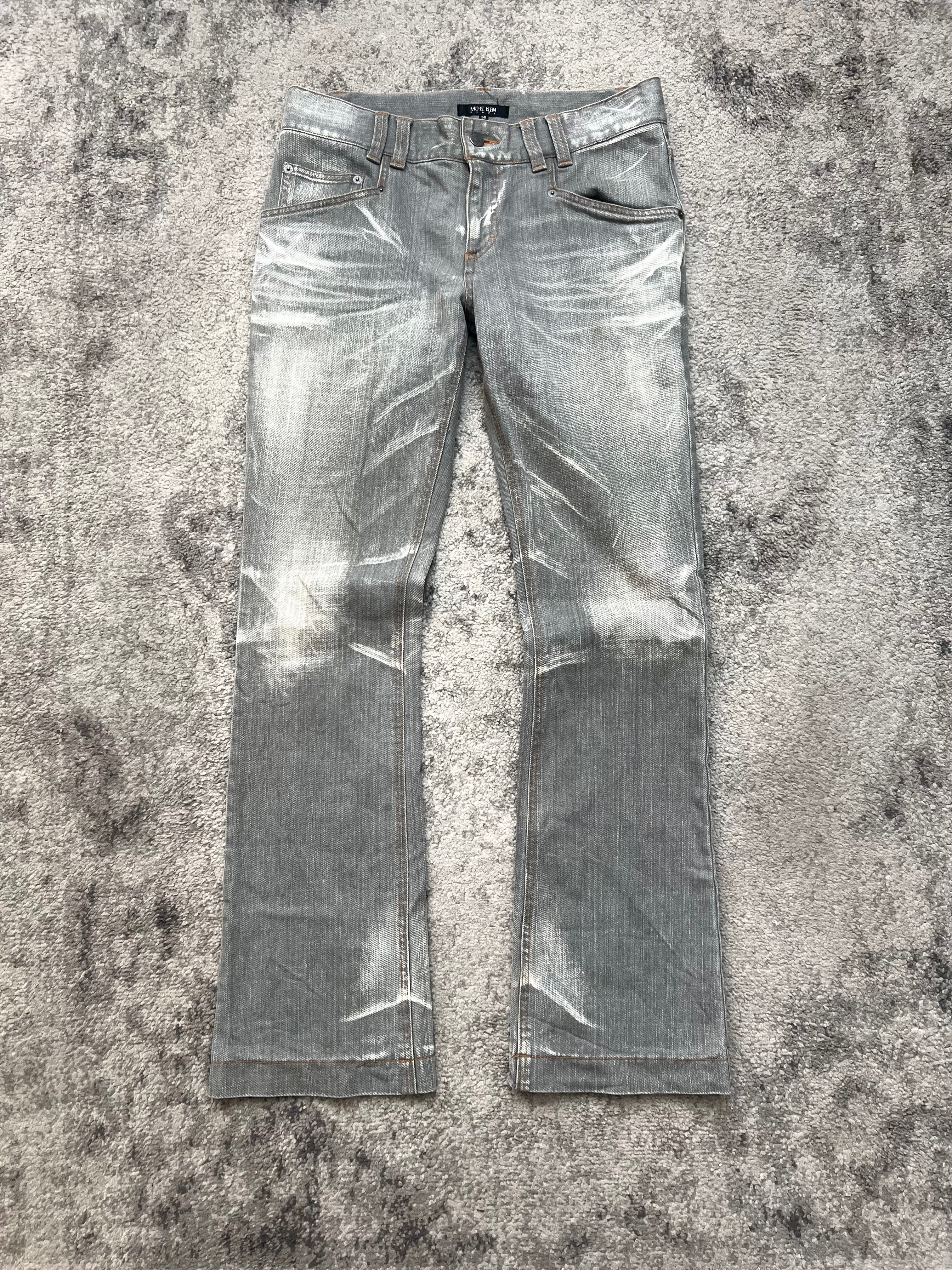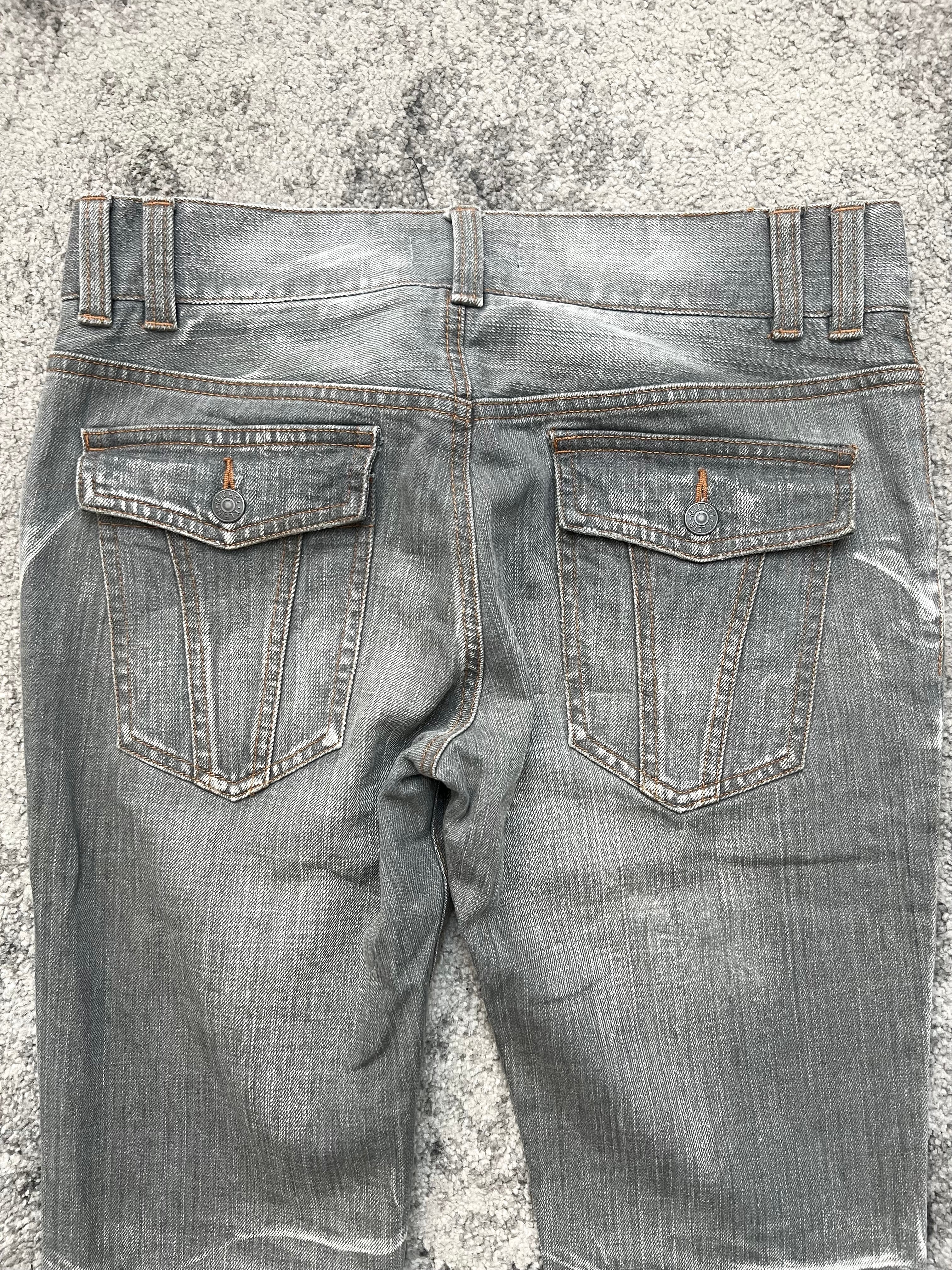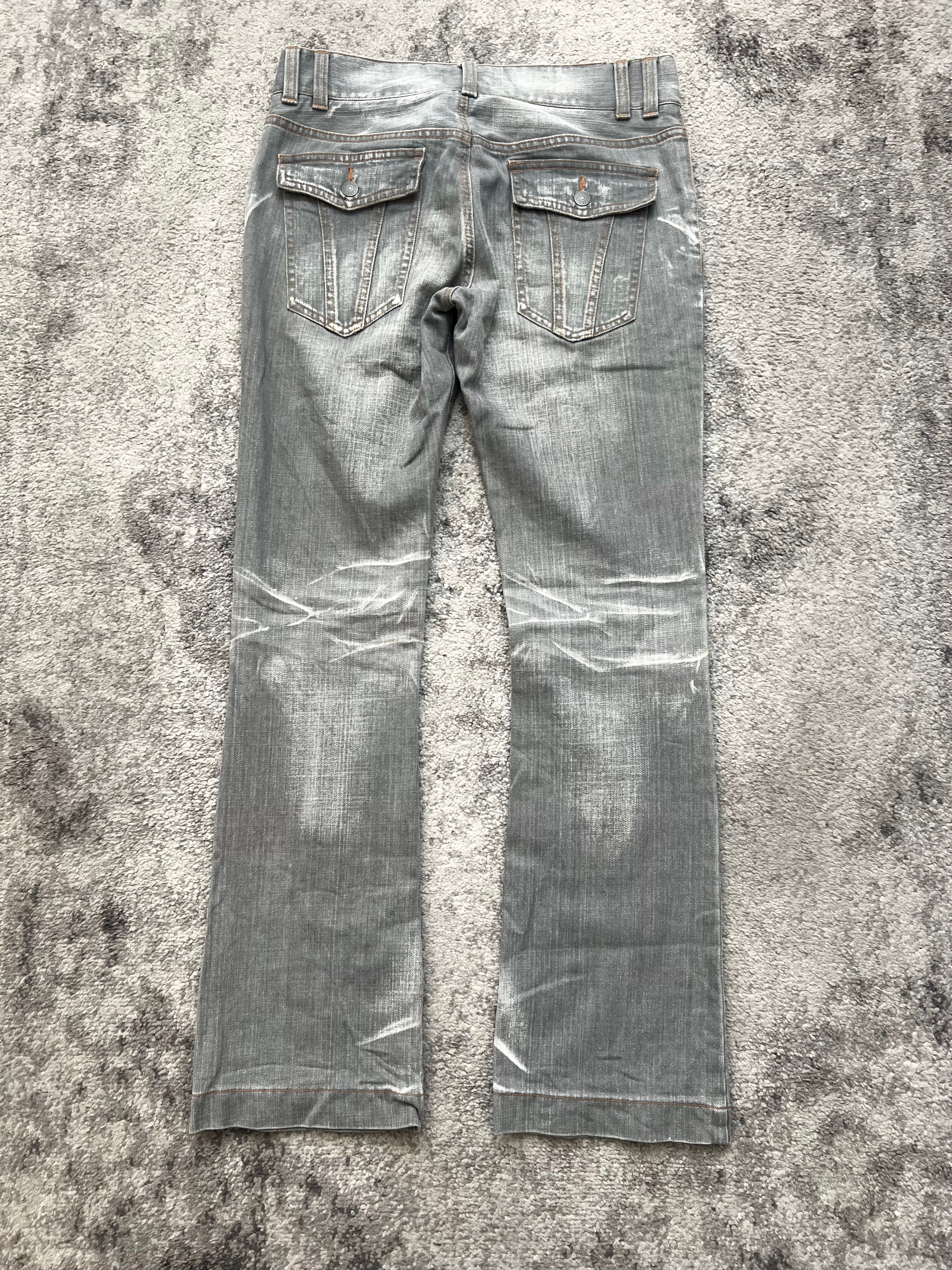 This isn’t soft or quiet – it’s industrial Tokyo energy in denim form. Washed-out lightning fades slash through grey fabric, sharp creases cut like static, and angular flap pockets at the back add that archive punch. Pure Y2K underground attitude.