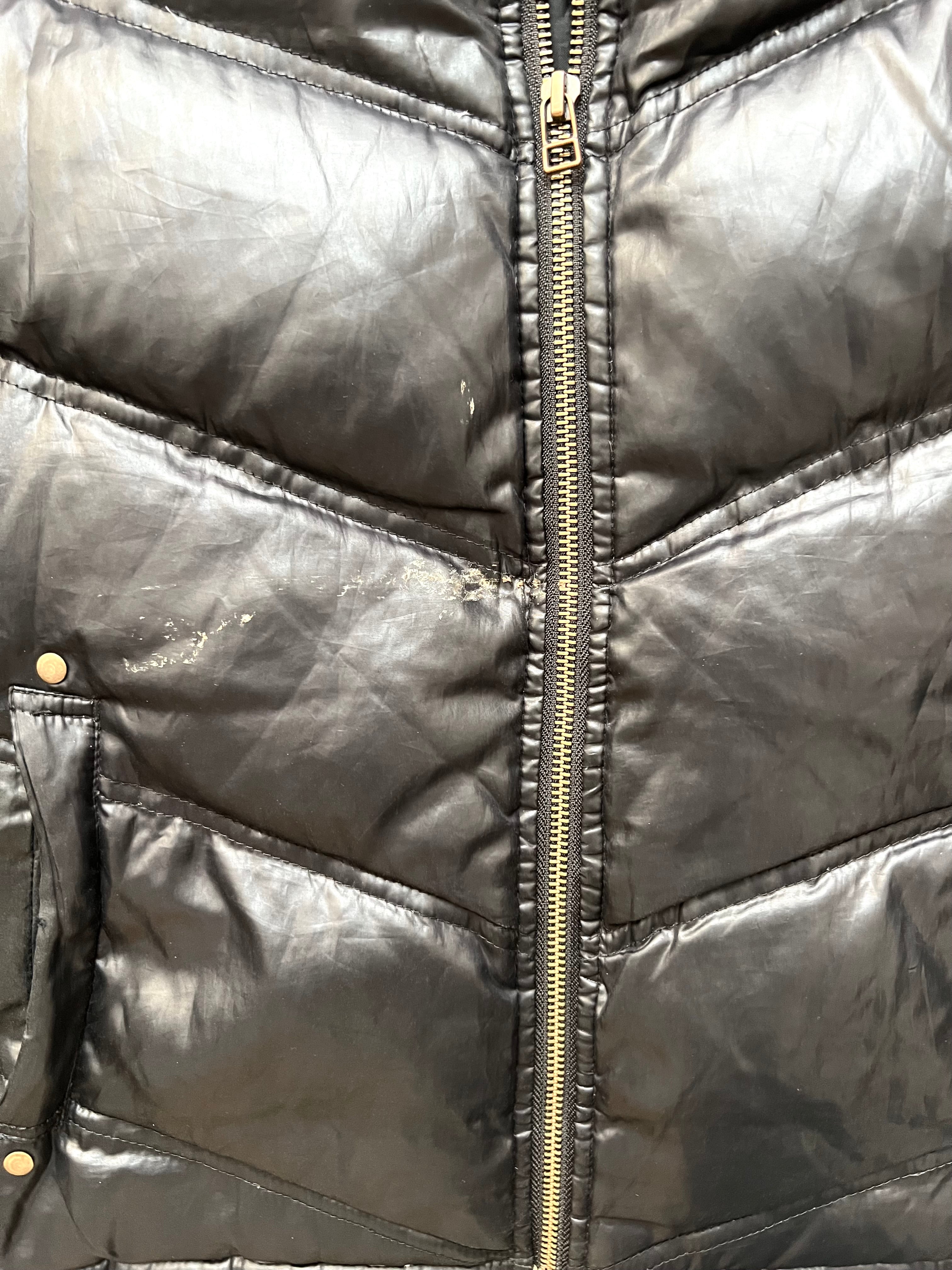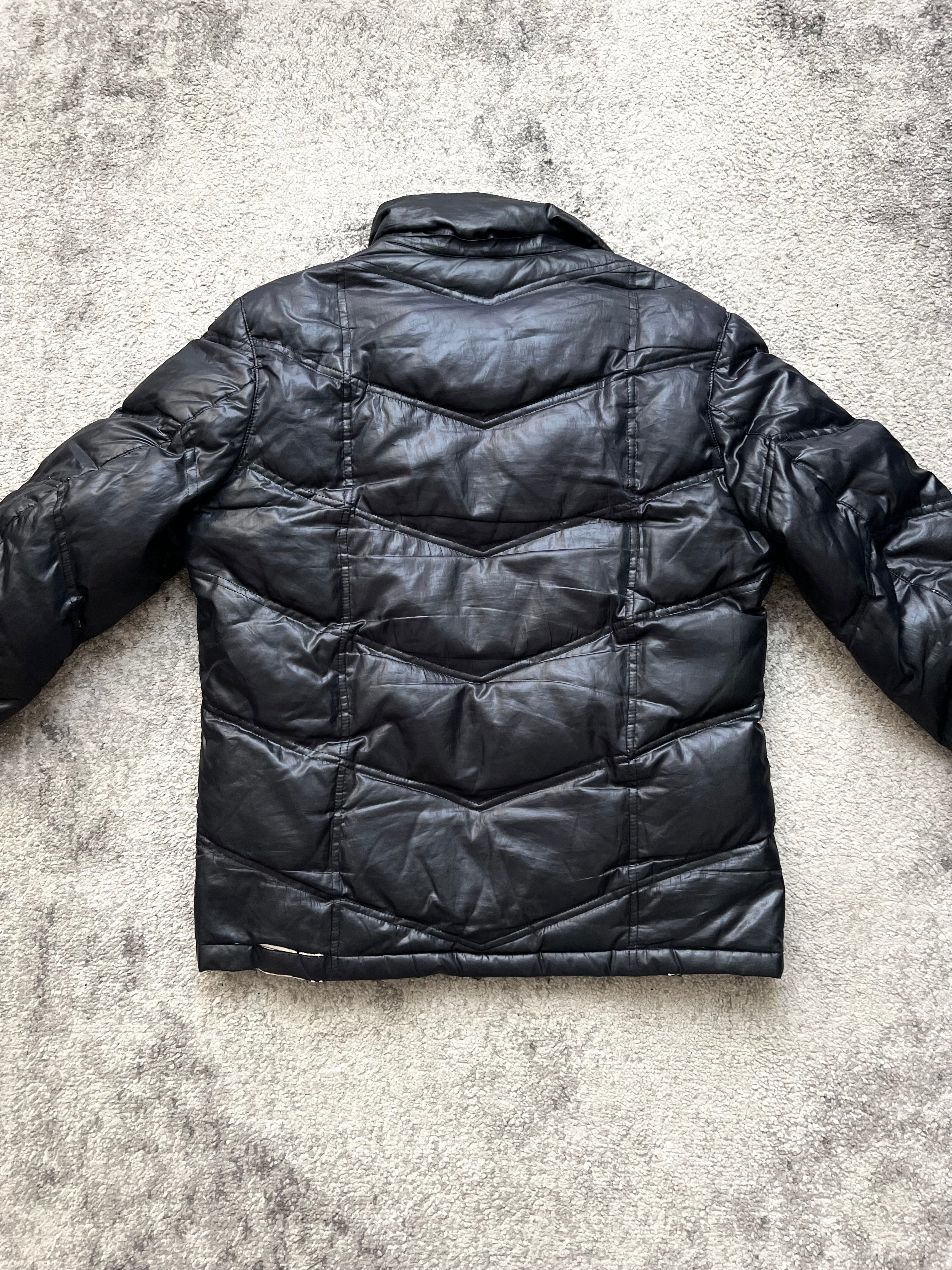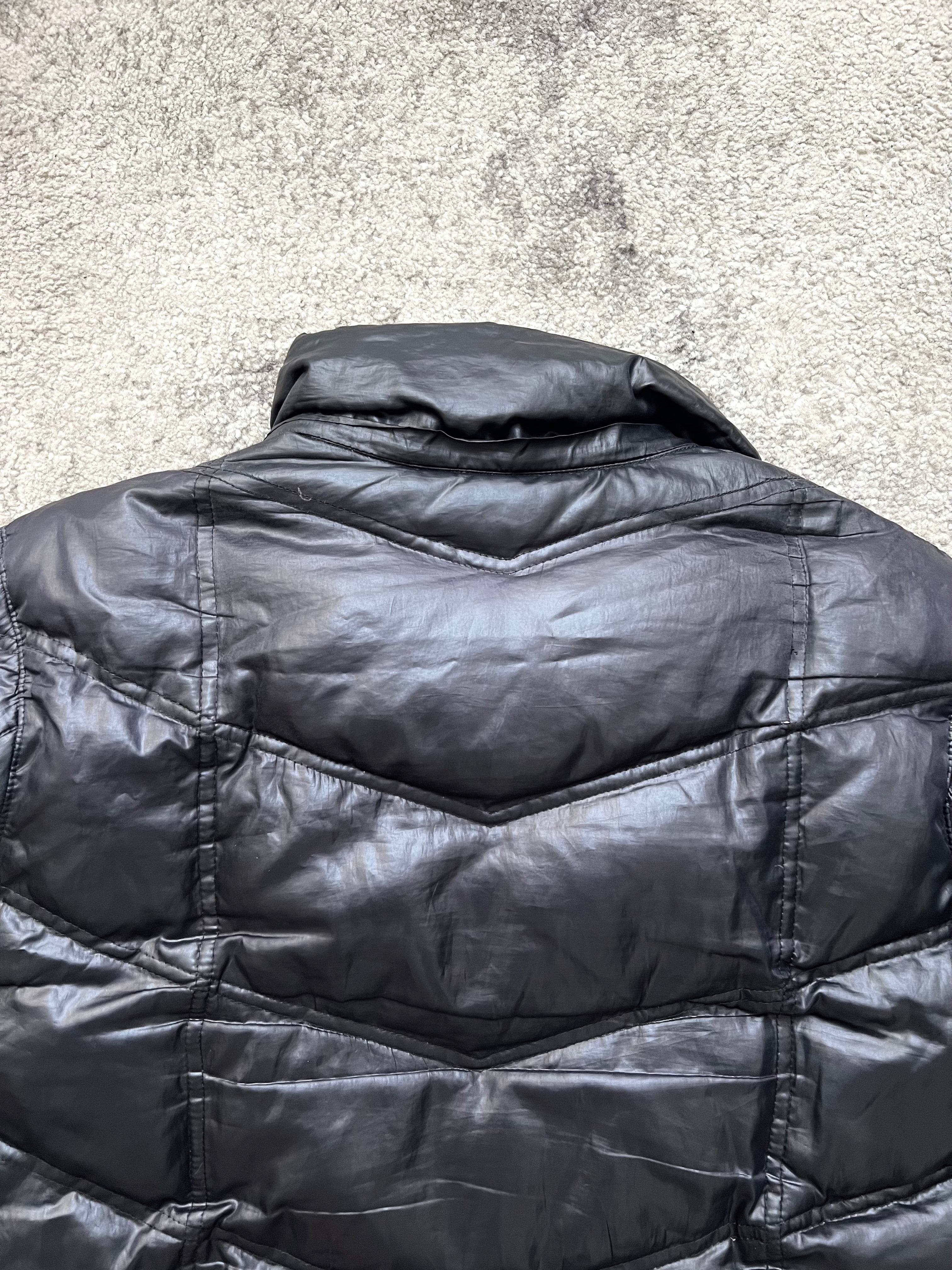 Material: Premium nylon shell with quilted down insulation. Matte black finish with subtle sheen.