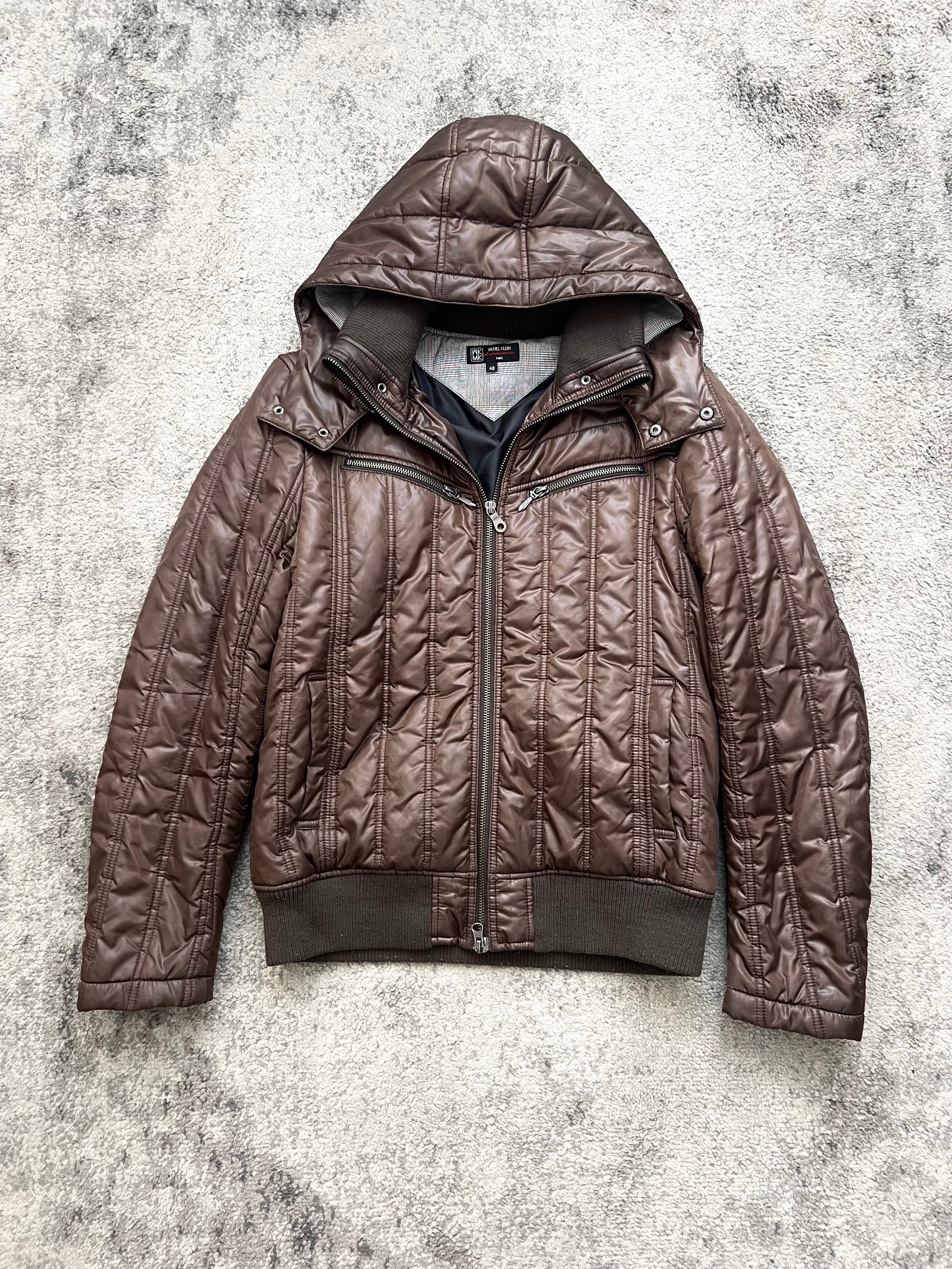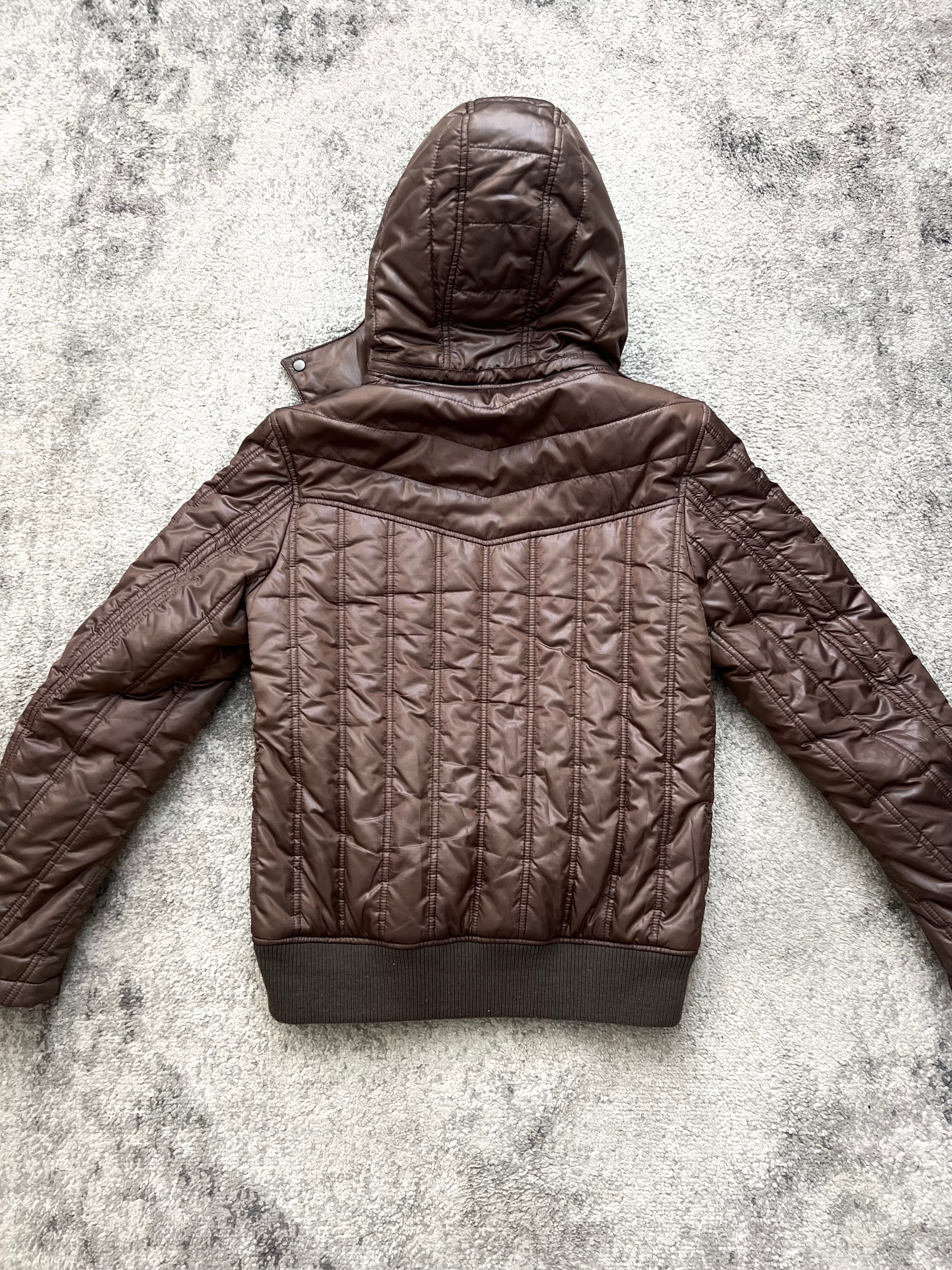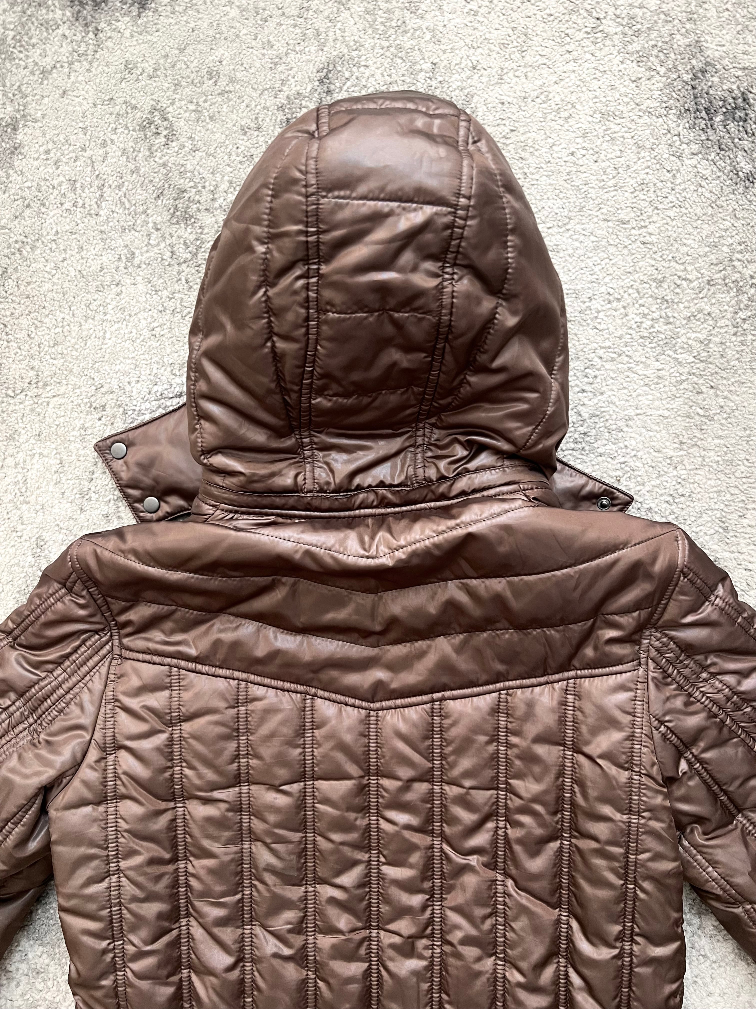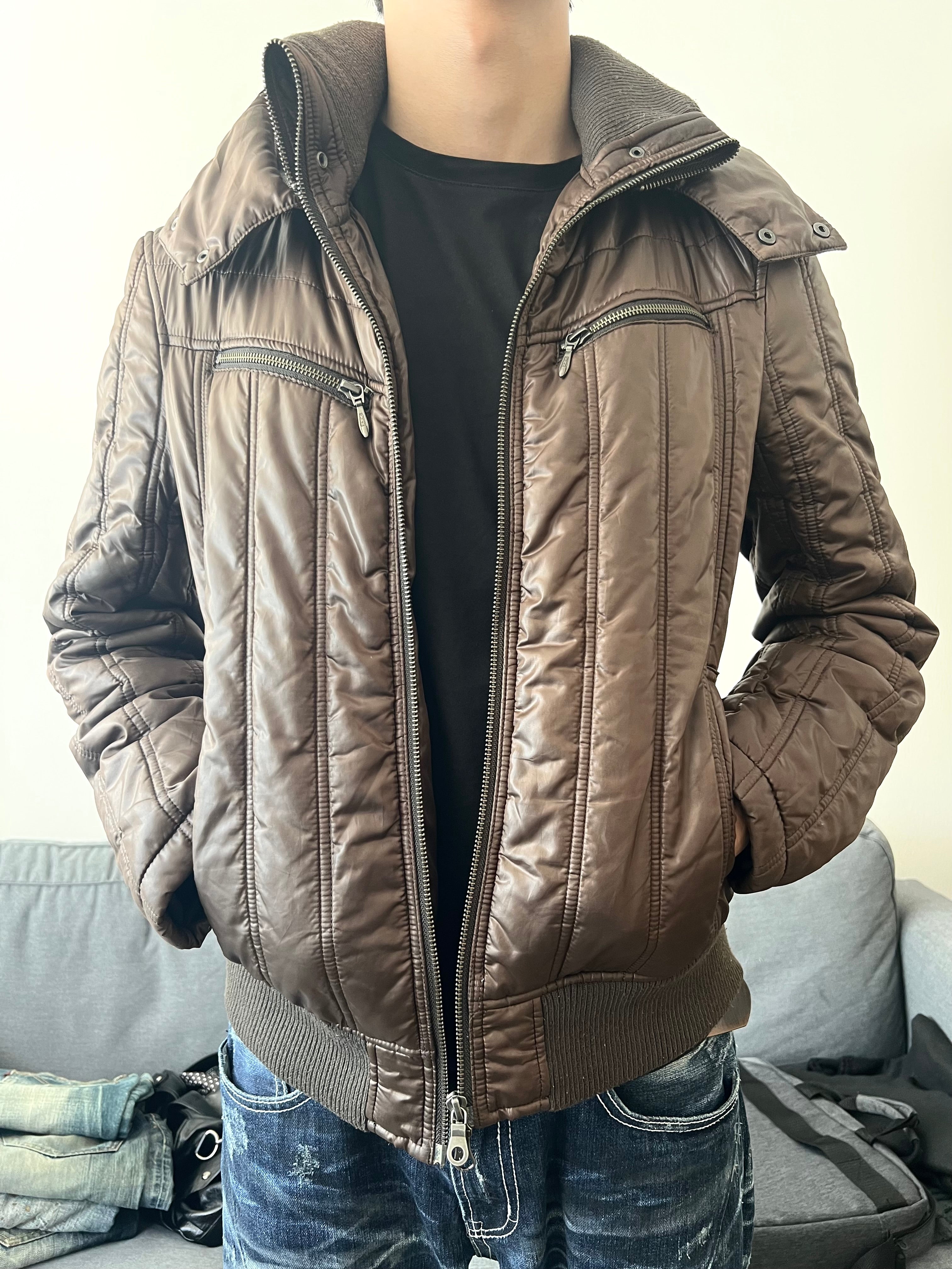Not just outerwear – this is protection stitched in rhythm. Deep brown quilted panels, detachable hood, and subtle metallic hardware bring a sense of underground luxury. A Tokyo archive piece that feels both street and avant-garde.