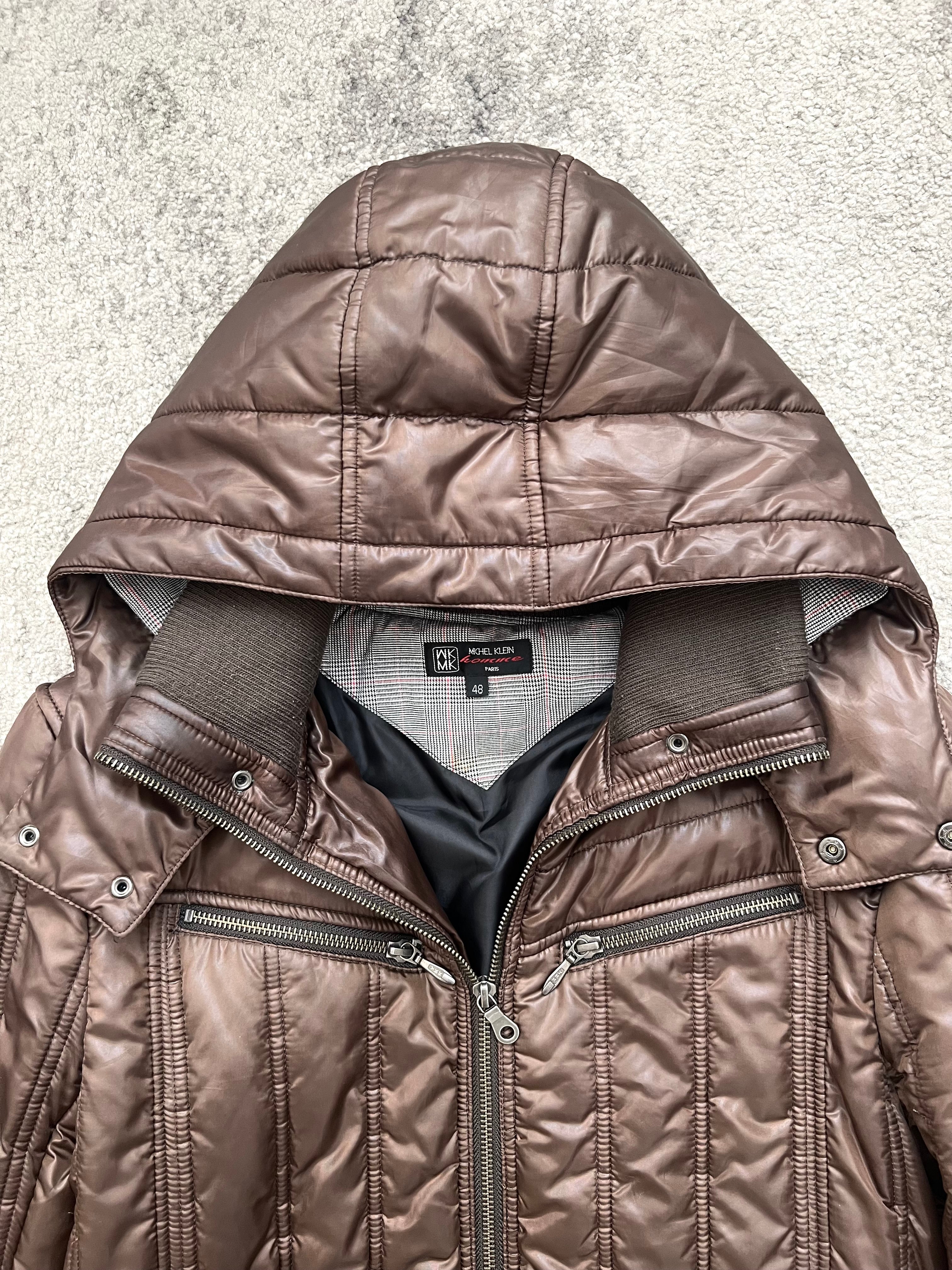 Michel Klein “Night Shelter” Quilted Hooded Jacket – armor in chocolate brown.