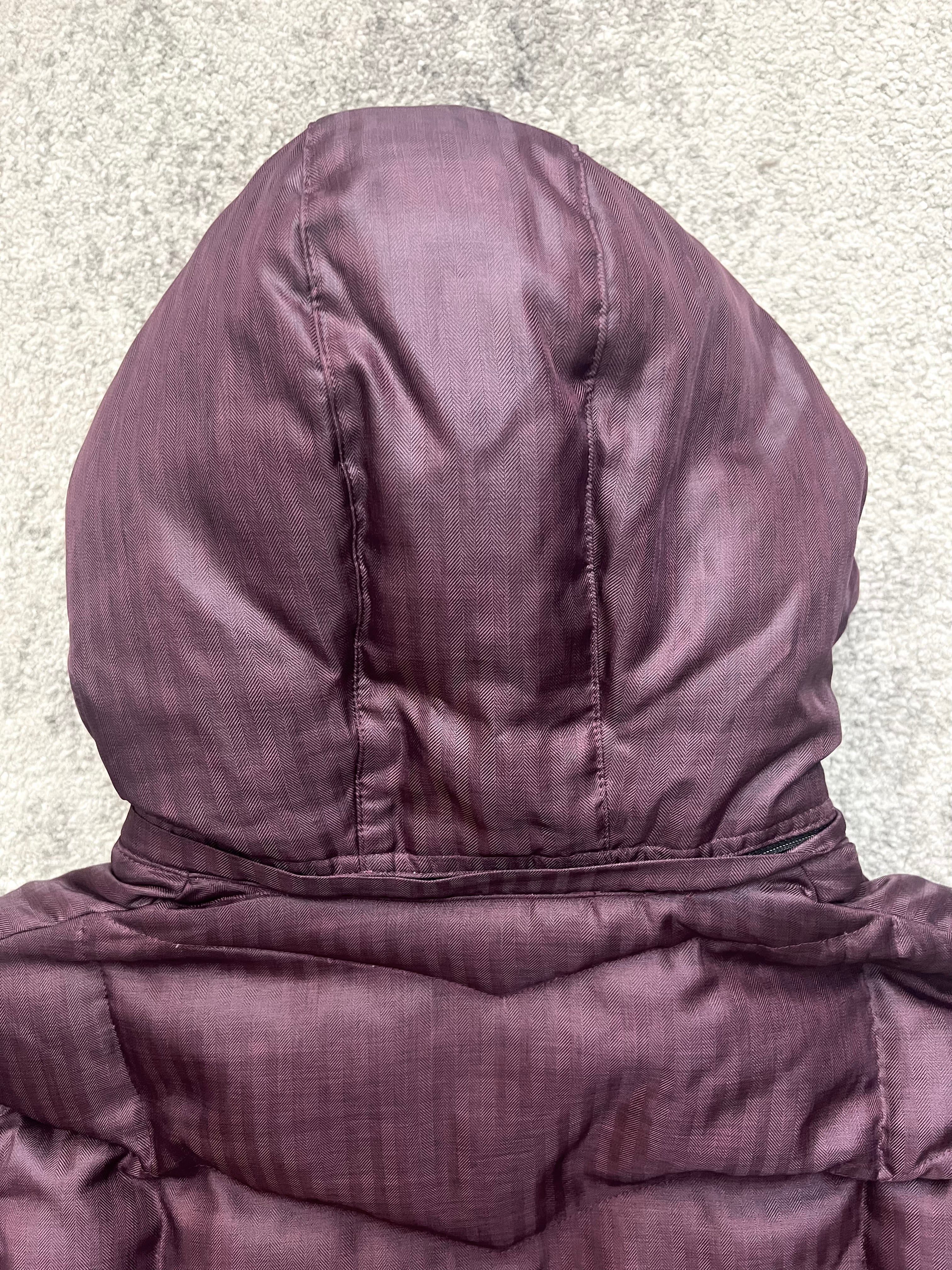 Japanese archive winter piece from Michel Klein, a standout in deep crimson with a subtle iridescent sheen. Crafted from premium nylon with down fill, this jacket combines warmth and structure with that unmistakable Japanese design sensibility. The chevron quilt pattern shapes the silhouette, while the full hood and high collar keep it protective yet sharp.