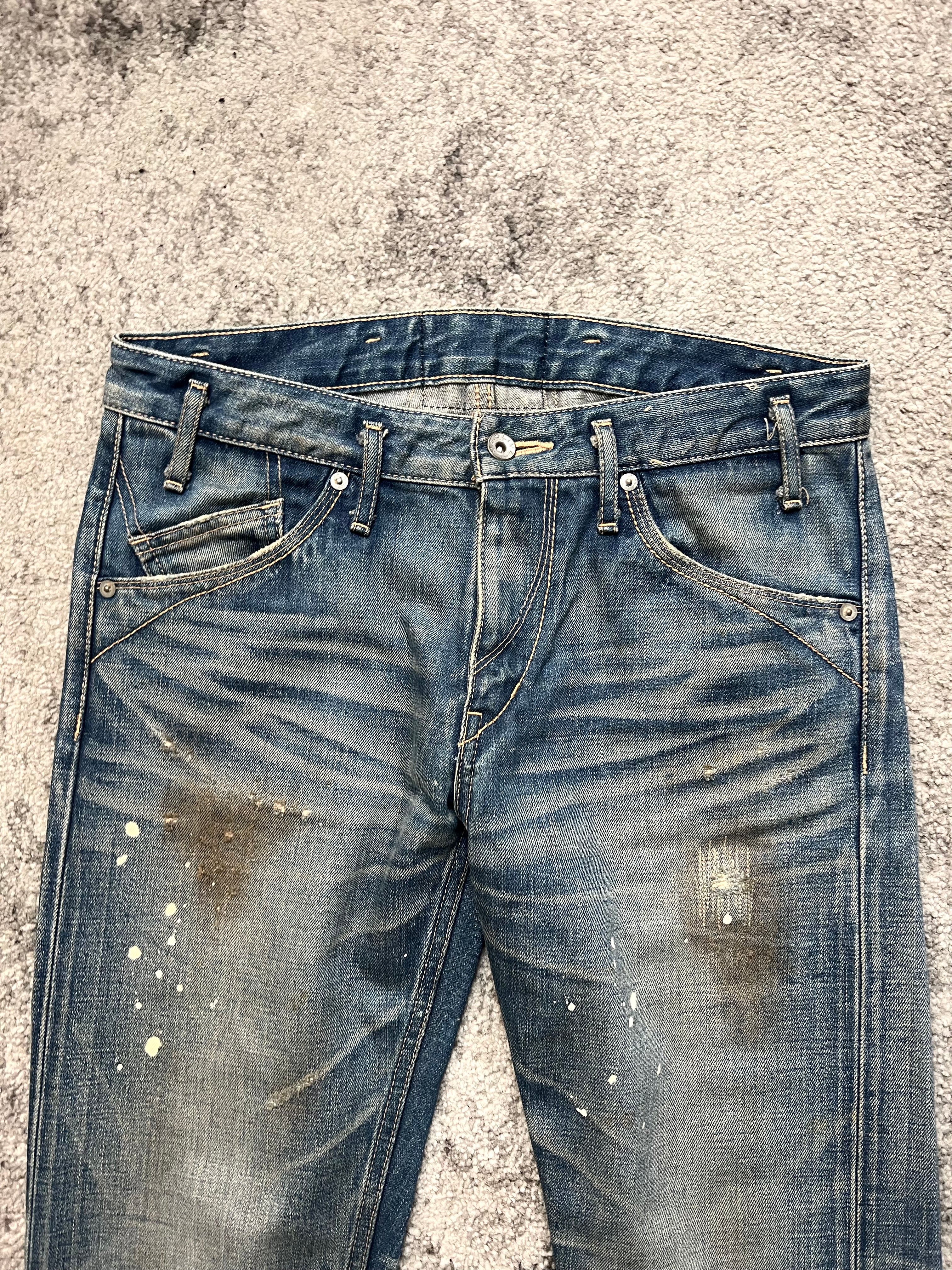Condition: Pre-loved with fading, whiskers, and natural distressing. Paint splatters throughout. Size M.