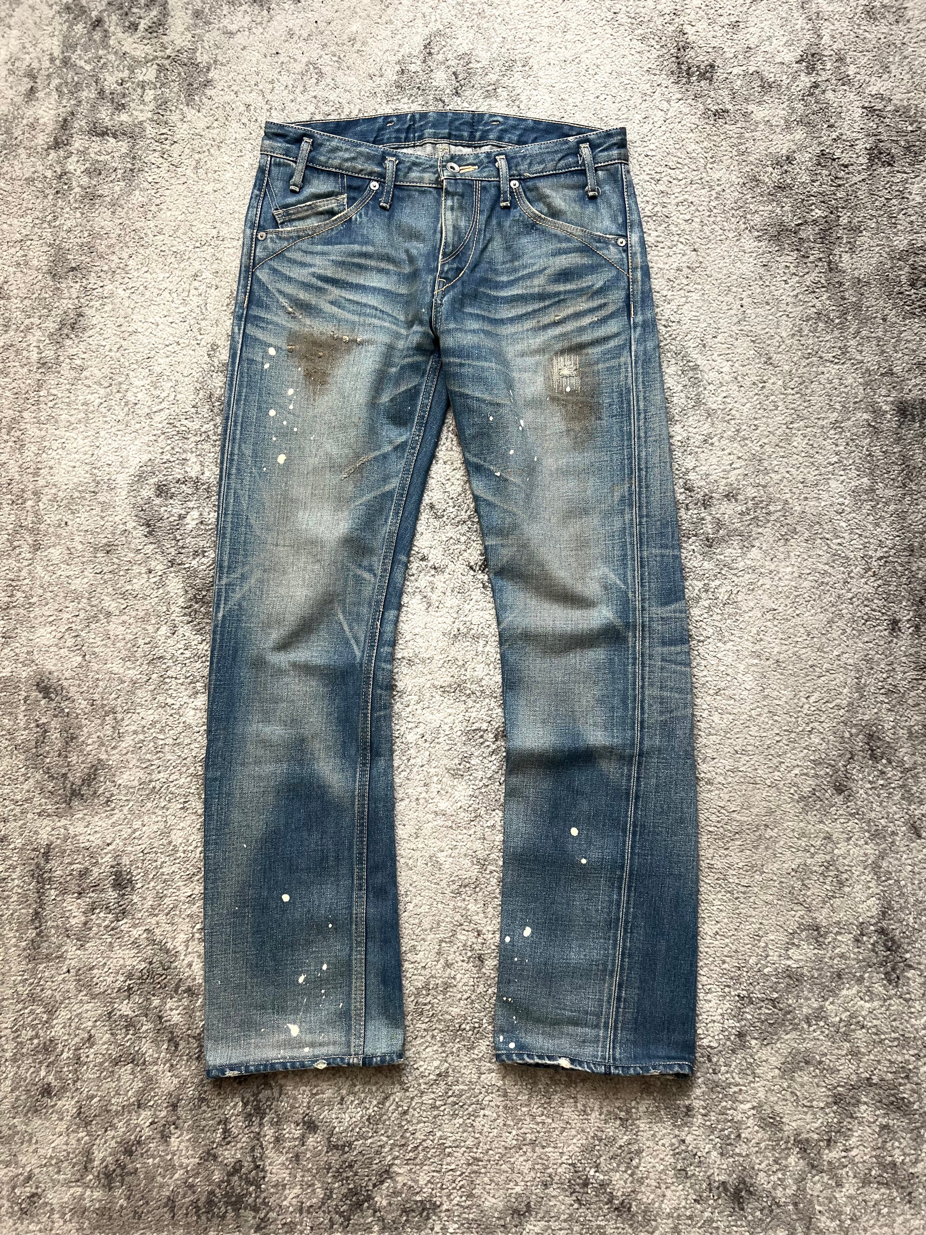 This is denim as memory – washed-out blue streaked with whiskers, paint flecks like careless rebellion, and patched distress that feels lived-in but still sharp. A quiet storm in archive form.