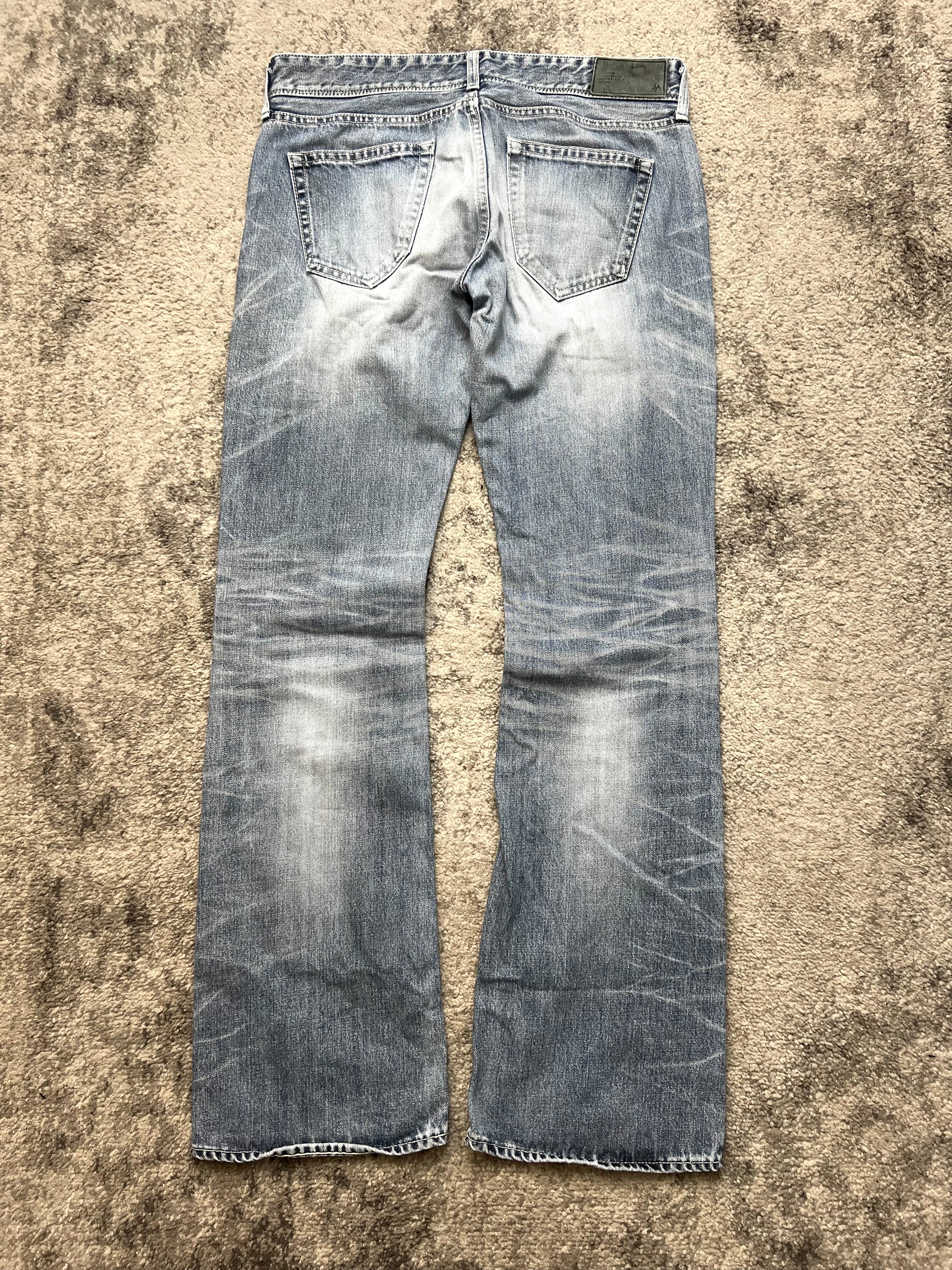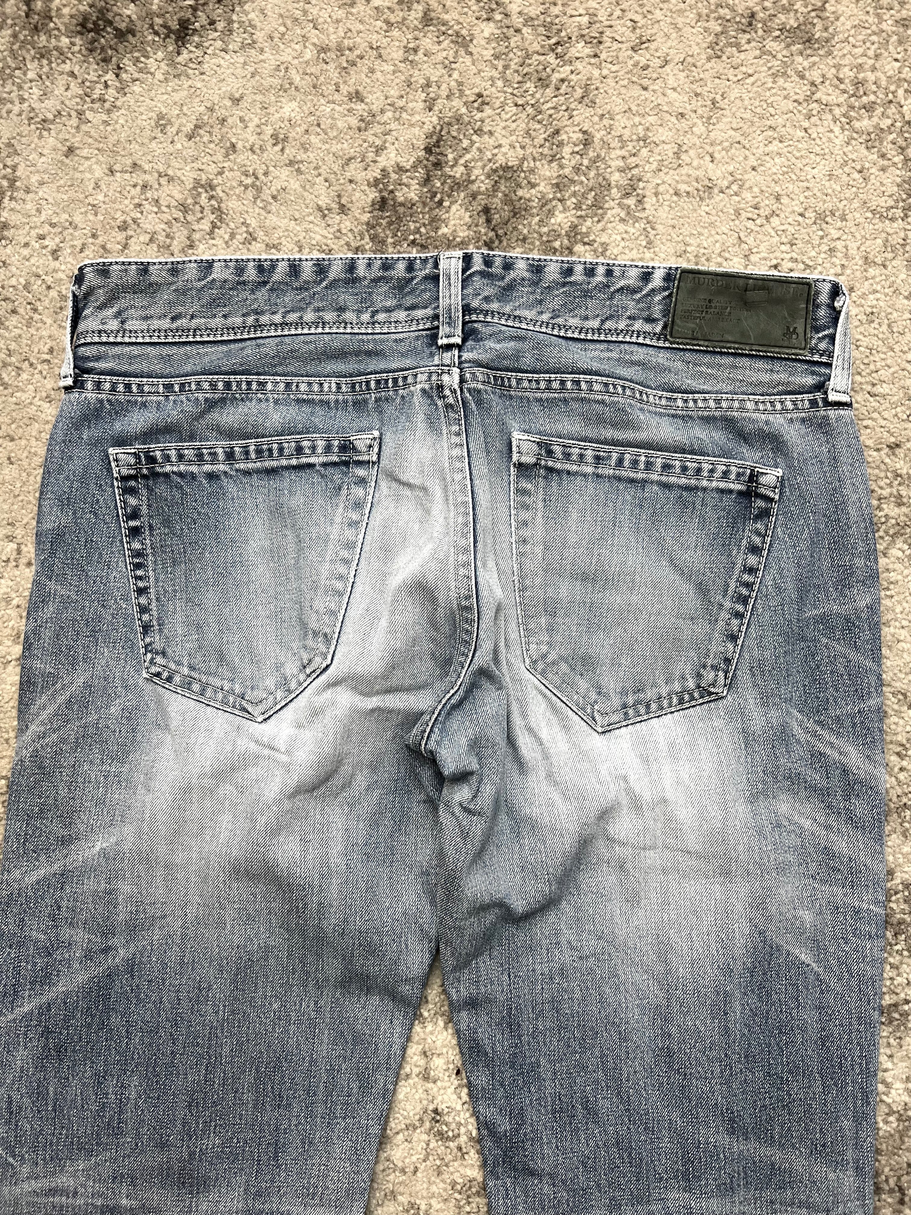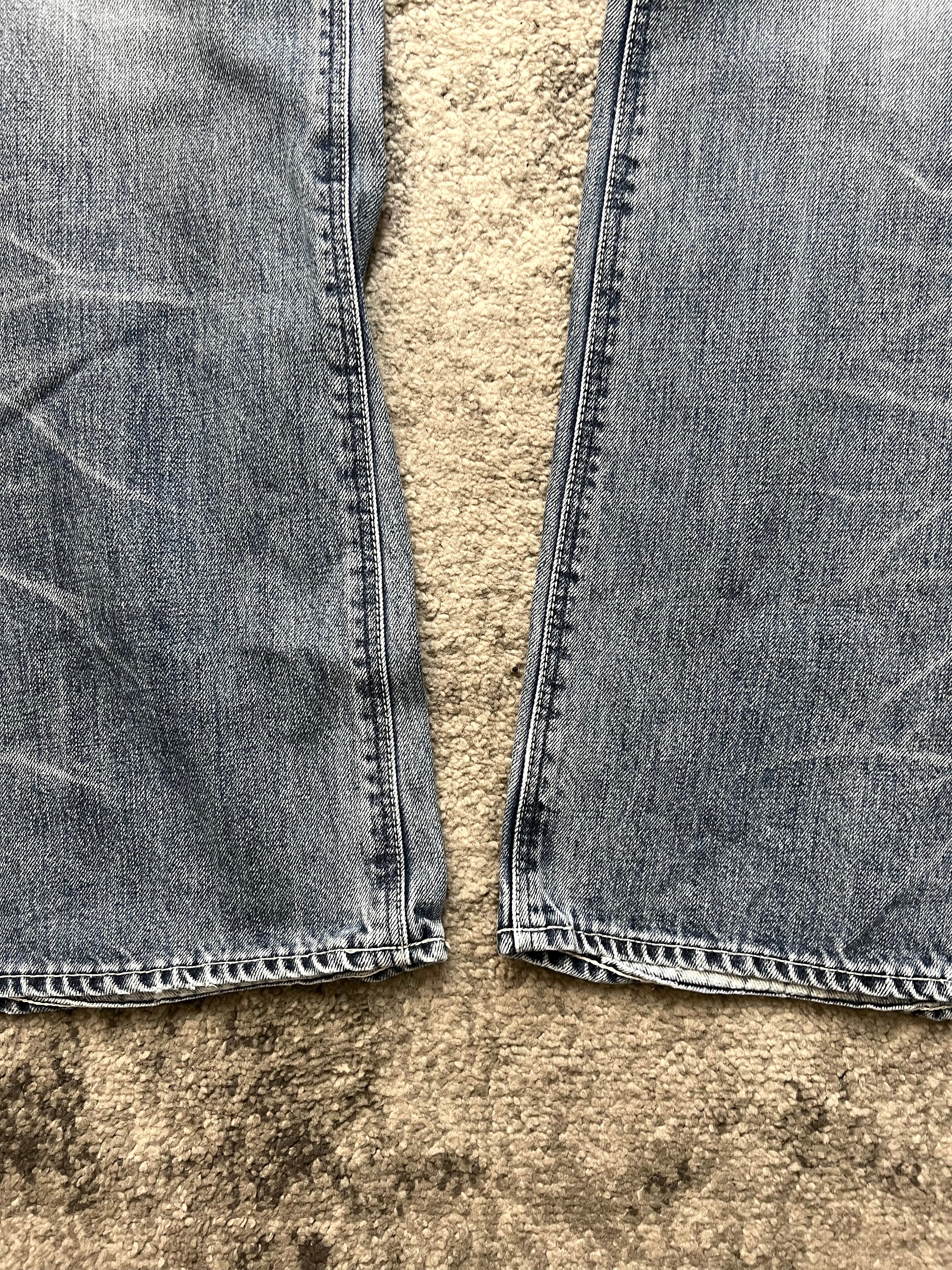 Pre-owned. Worn but not worn-out. Natural fading and whiskers across thighs, knees and calves—no holes, just honest age. Still crisp.