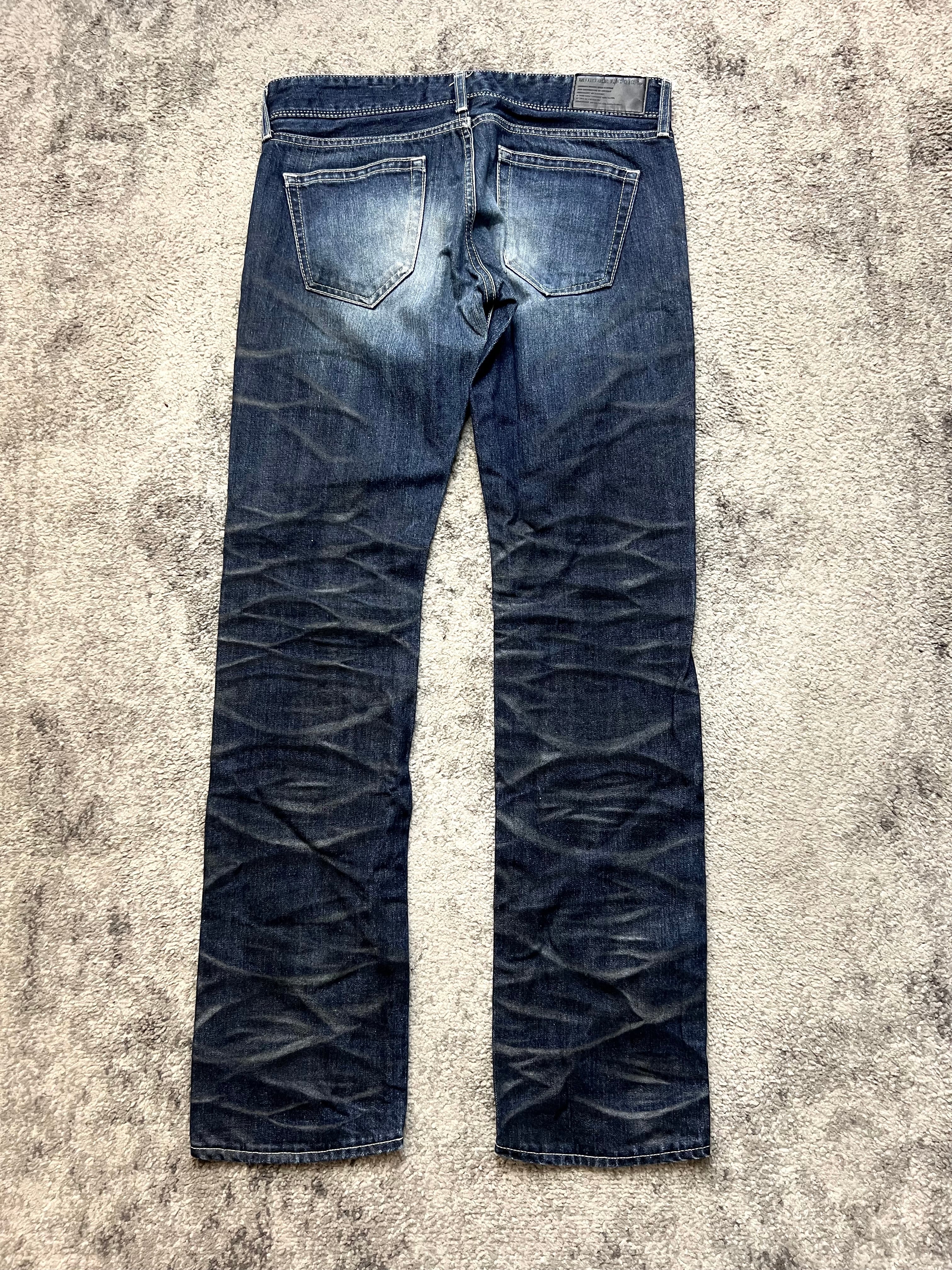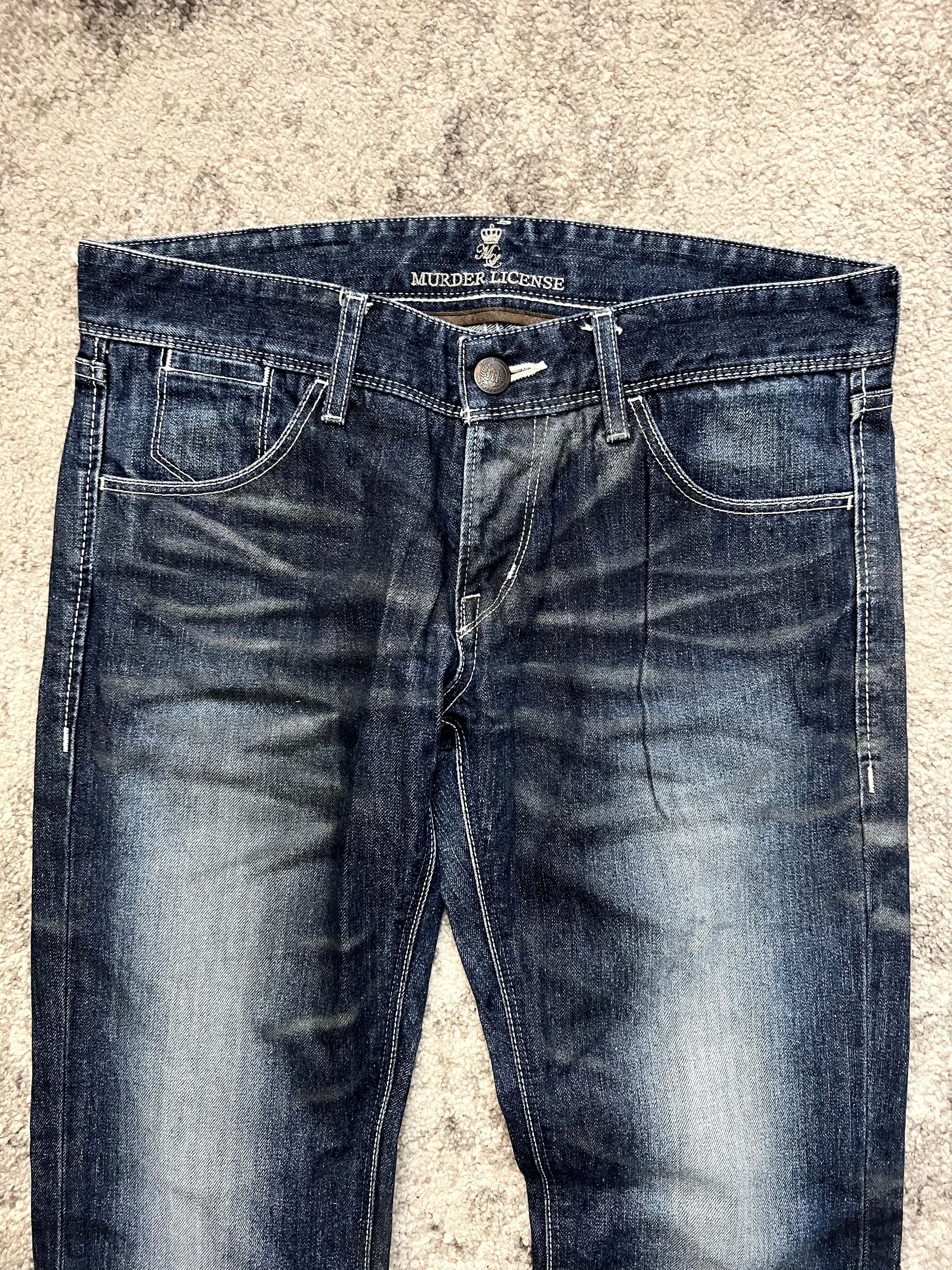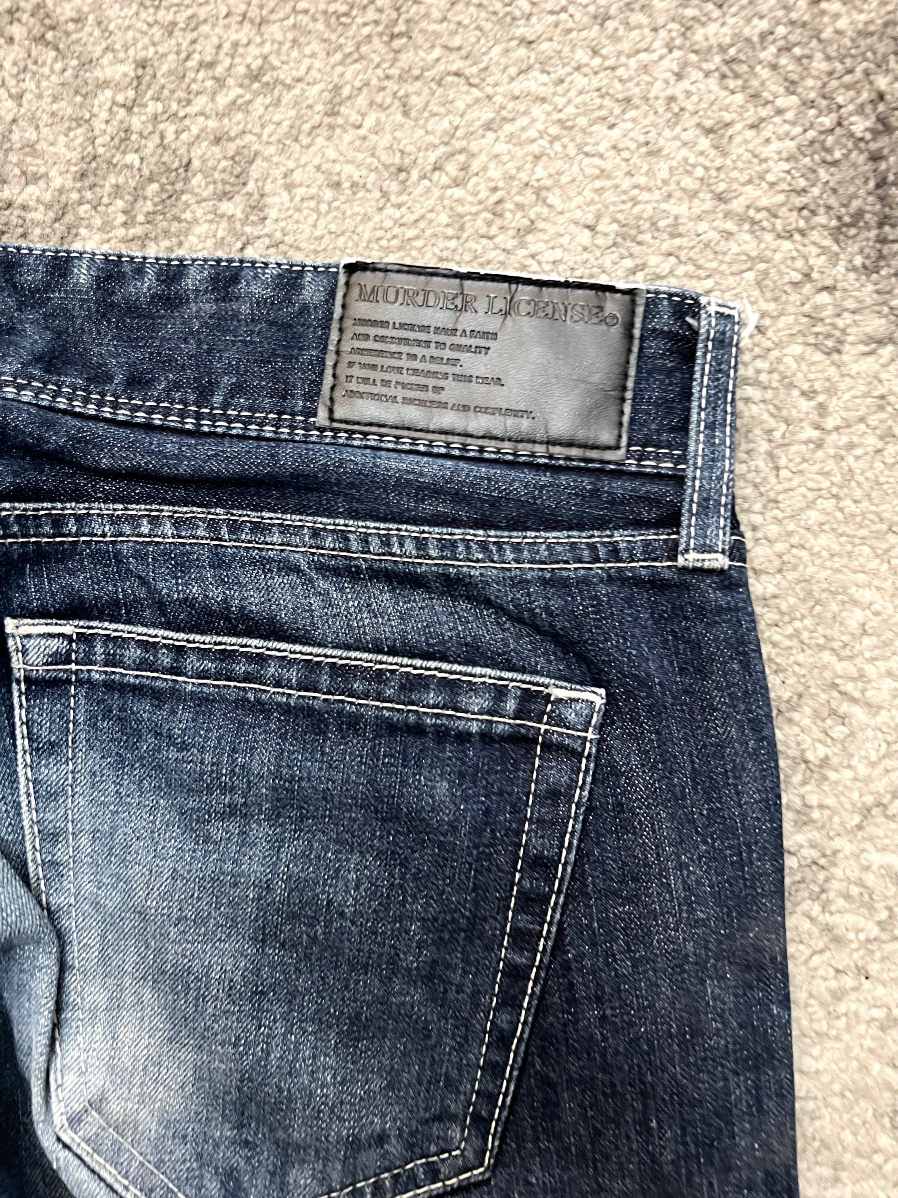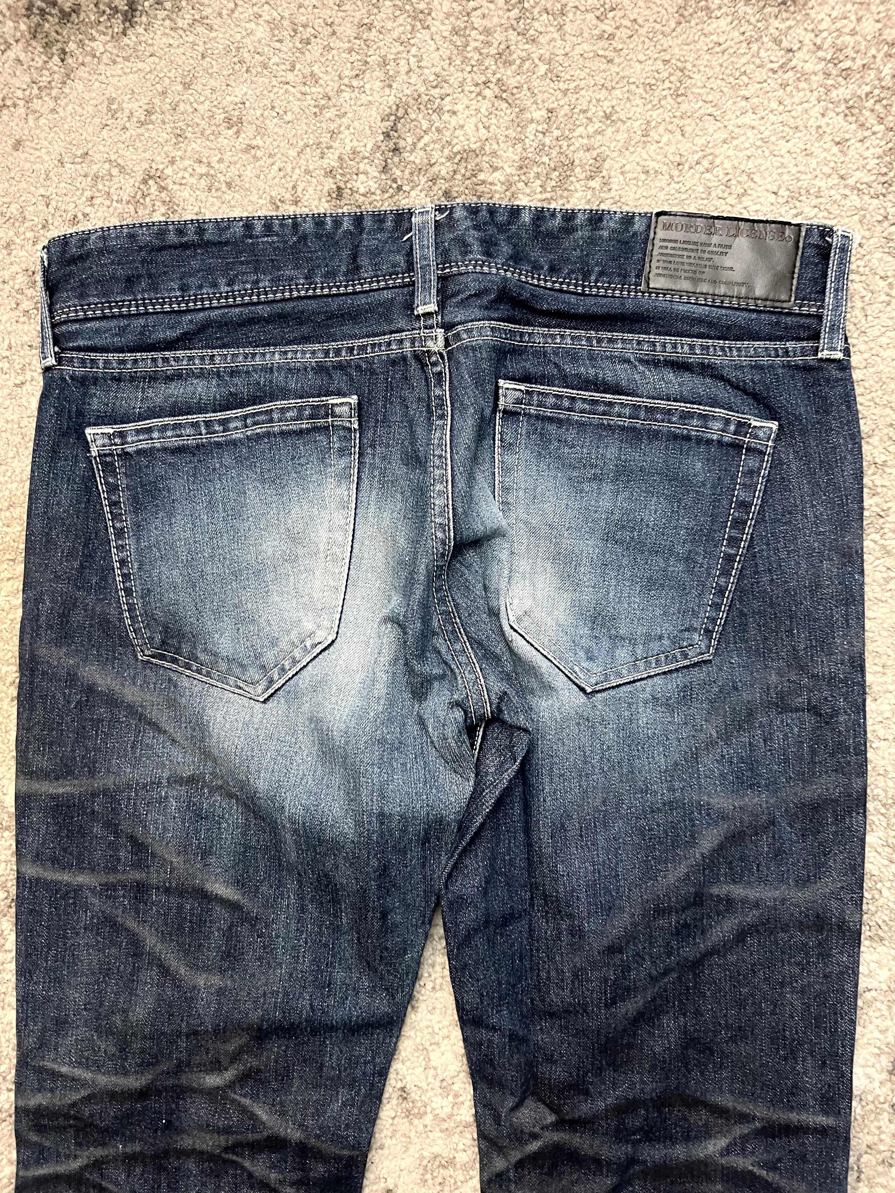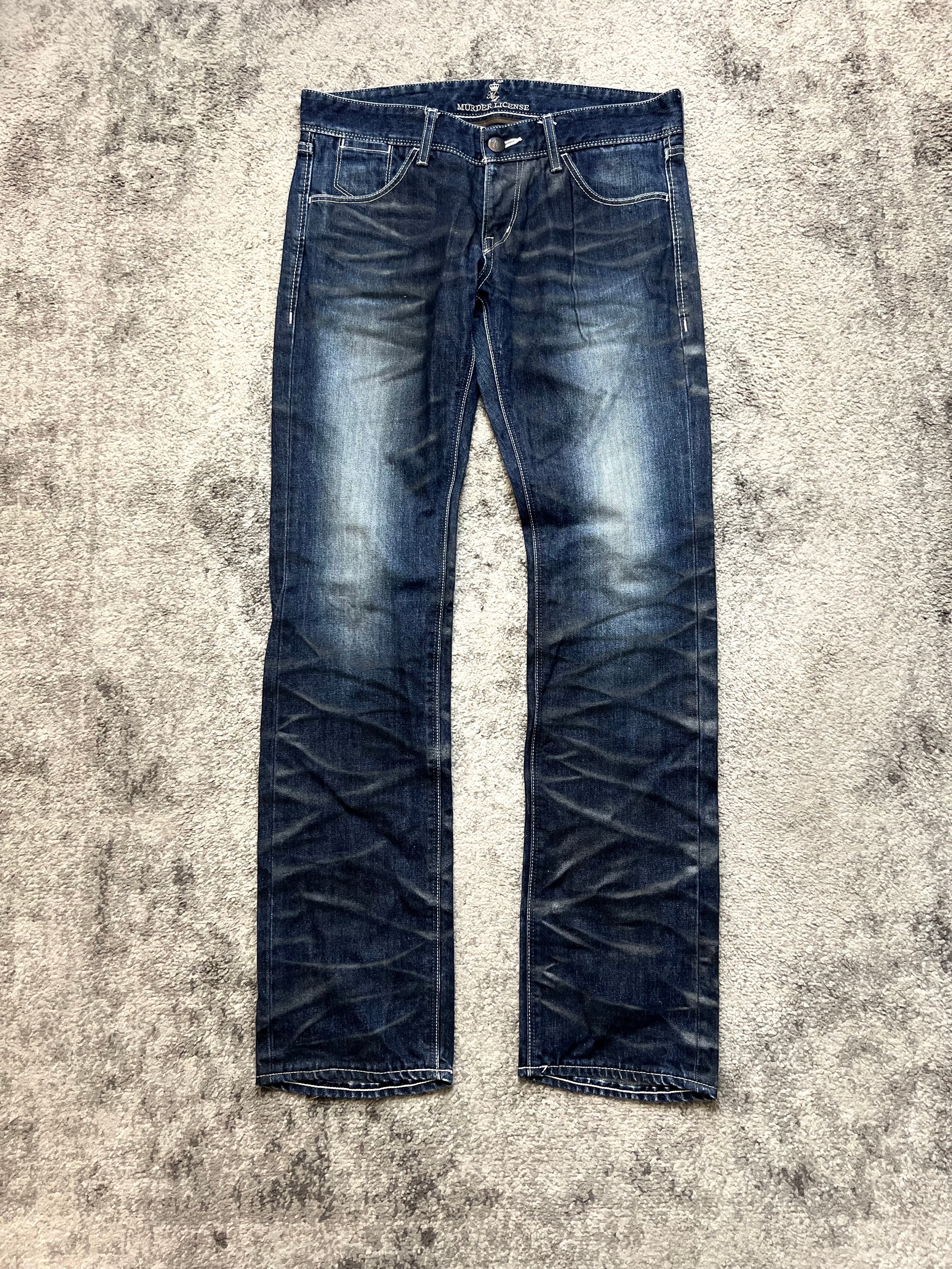An authentic slice of Japanese underground style from Murder License. Washed in a deep indigo base, these jeans carry bold creases, natural fading, and whiskering that feel straight out of early 2000s Harajuku backstreets.