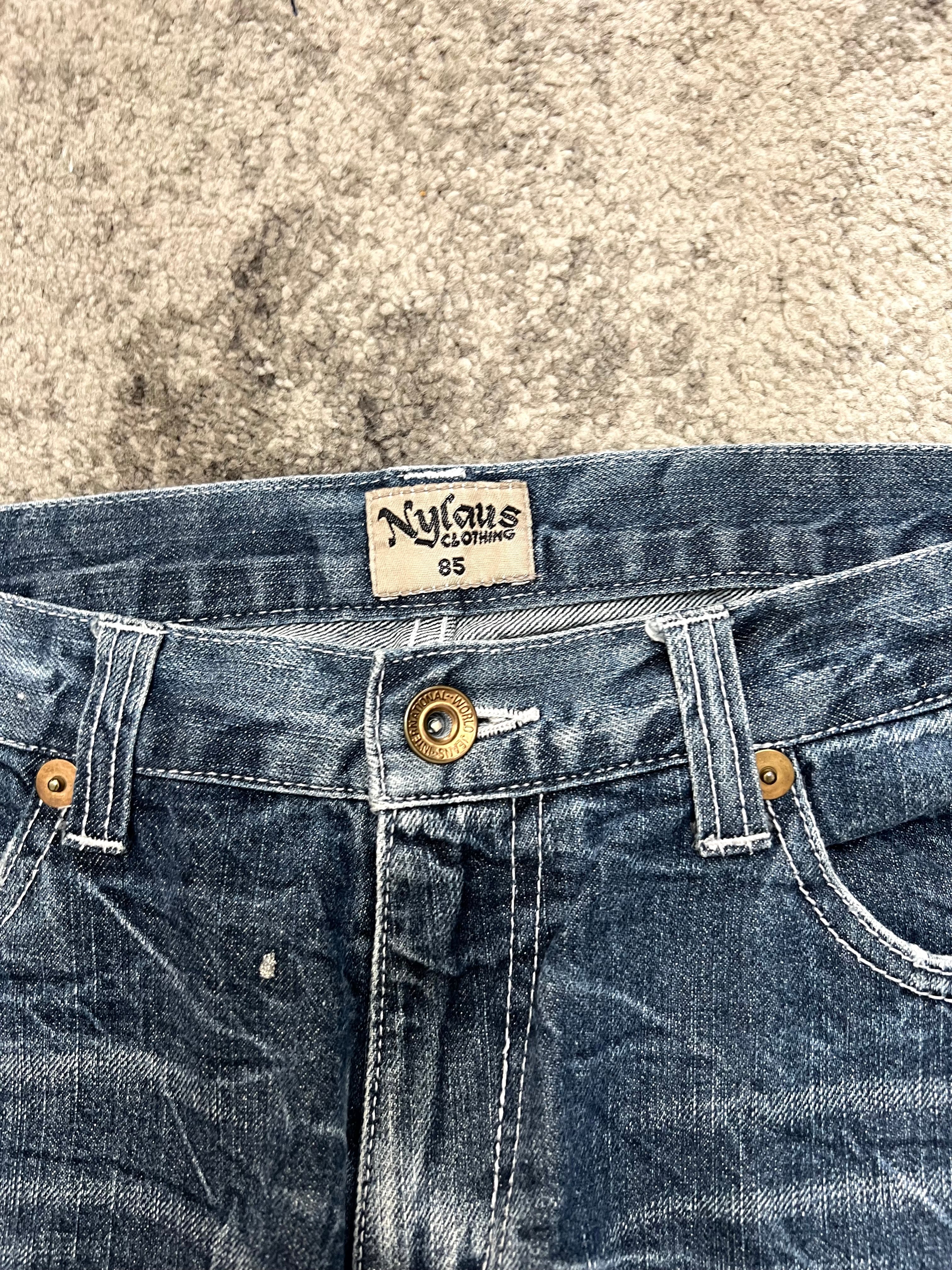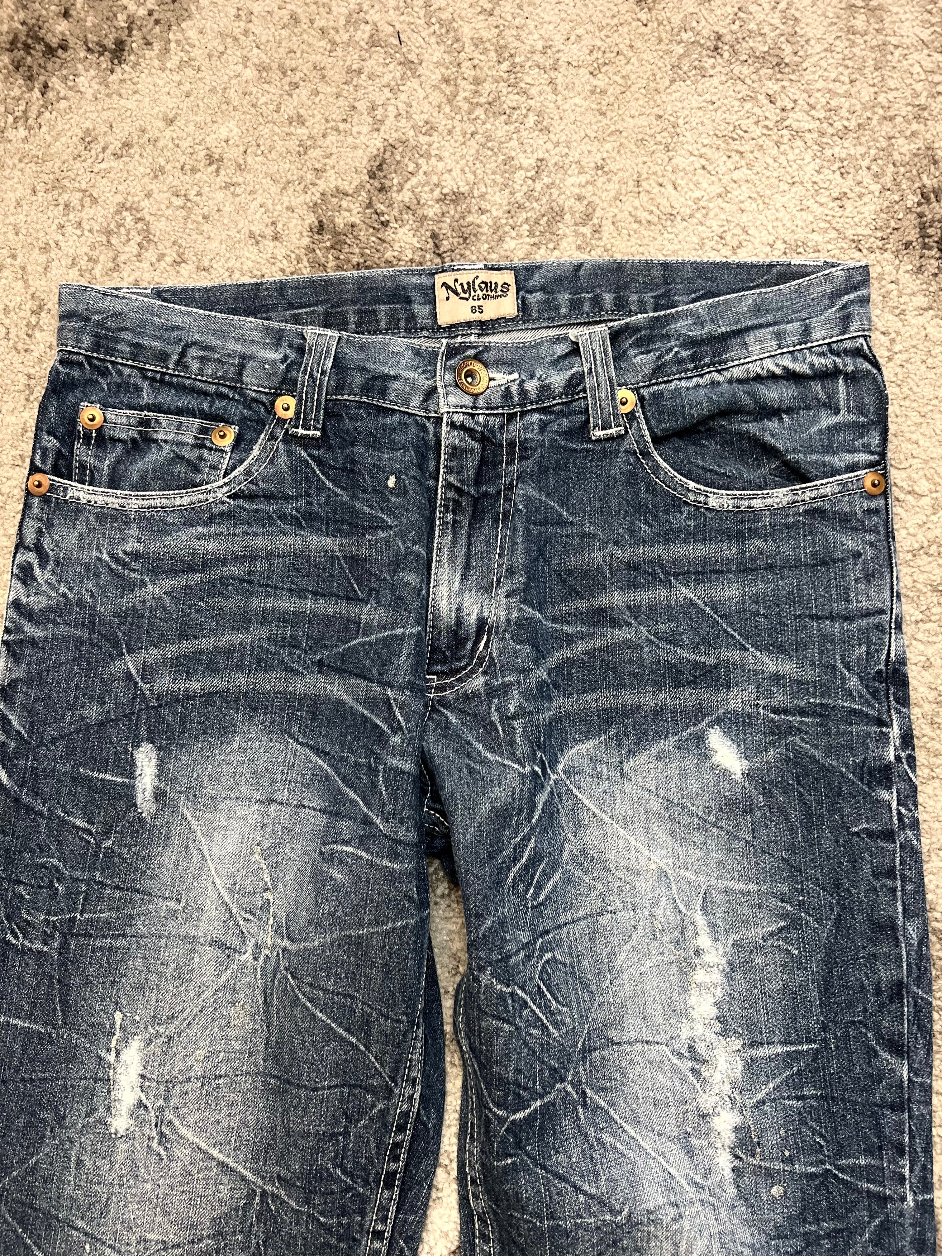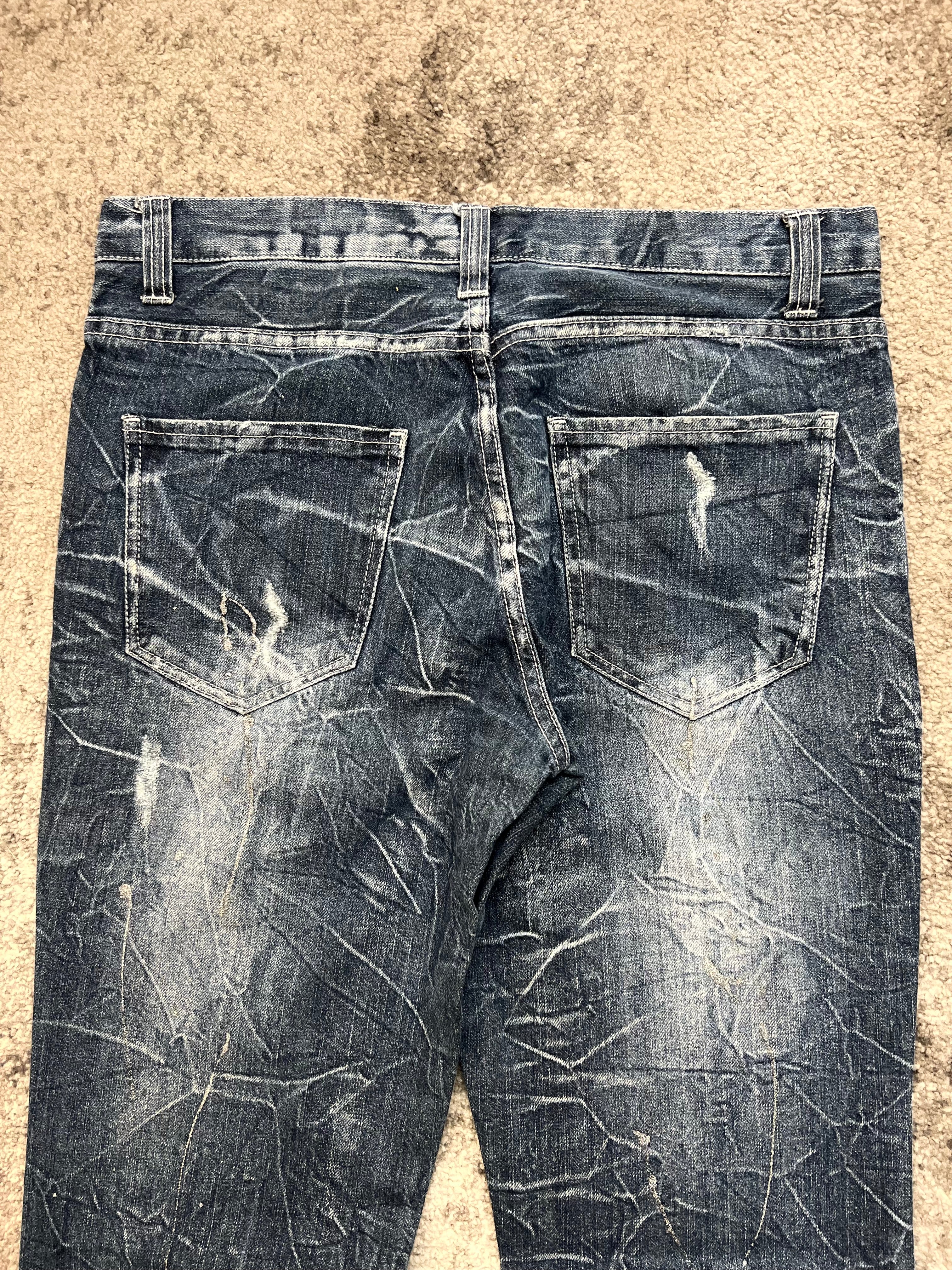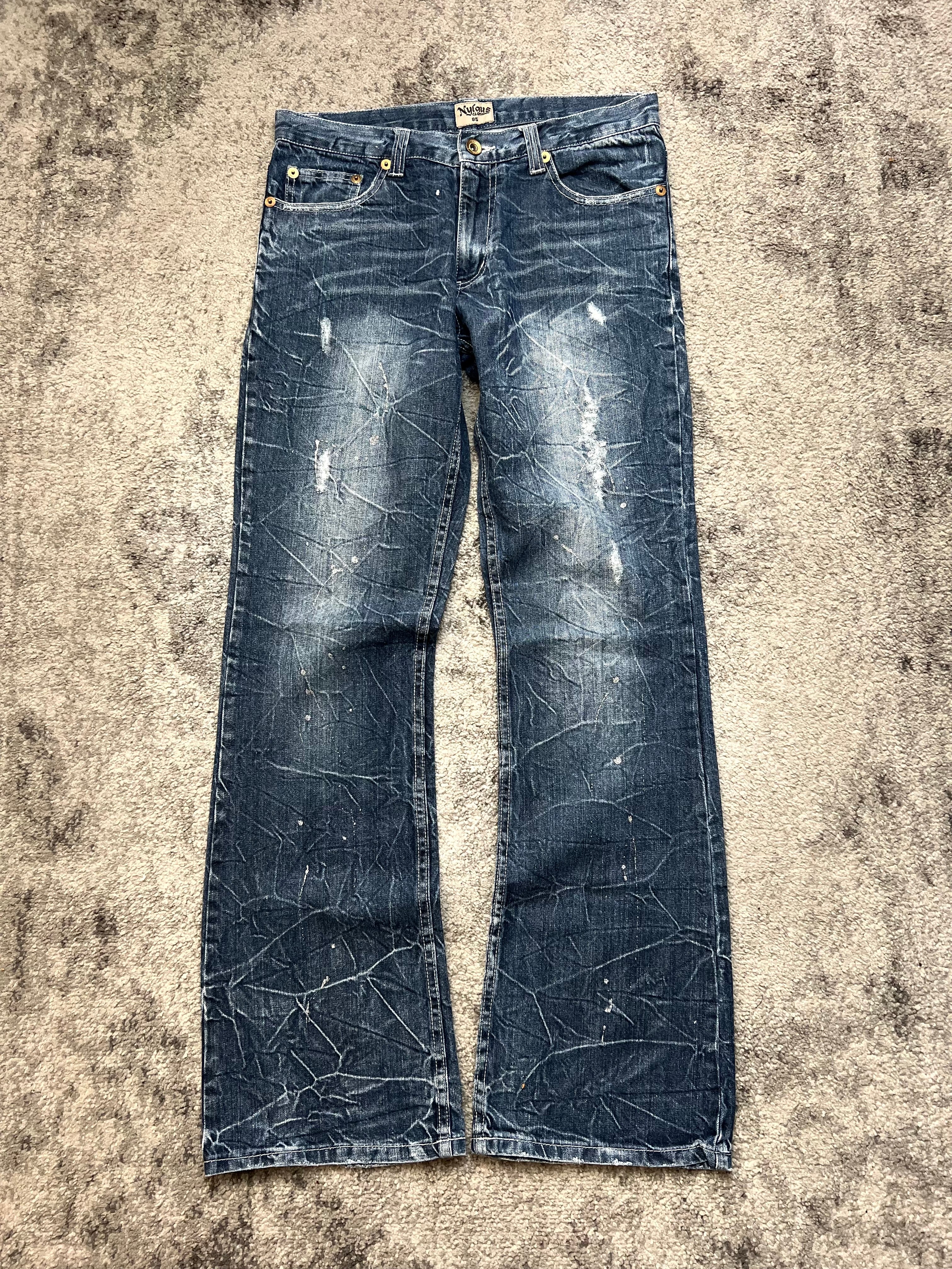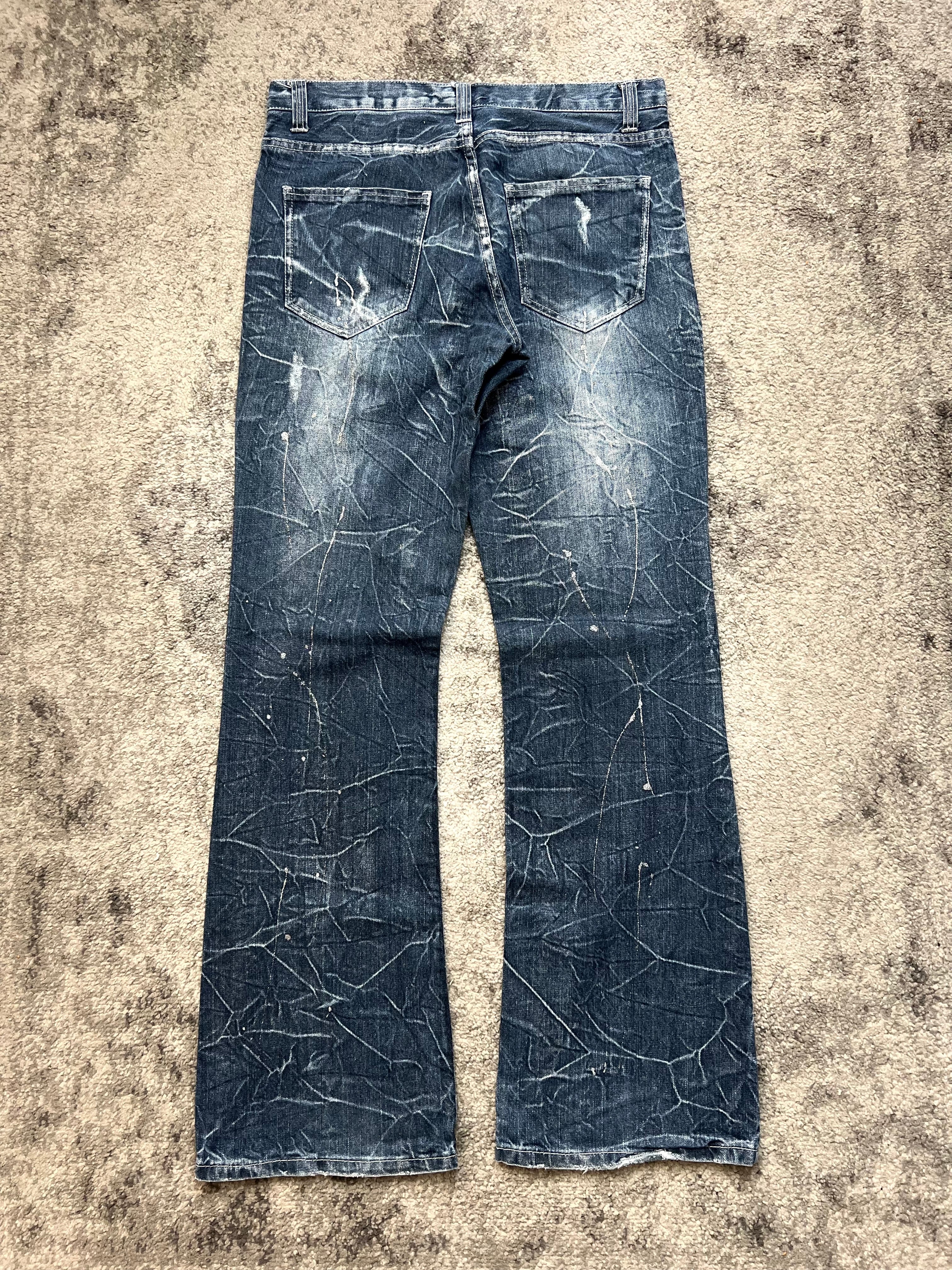 A pair that doesn’t sit still — it fractures and flickers. Violent creases crash across the legs like broken glass, while paint splatter and raw abrasions bring texture to silence. NYLAUS delivers chaos with control — a denim time capsule from the edge of Ura-Hara memory.