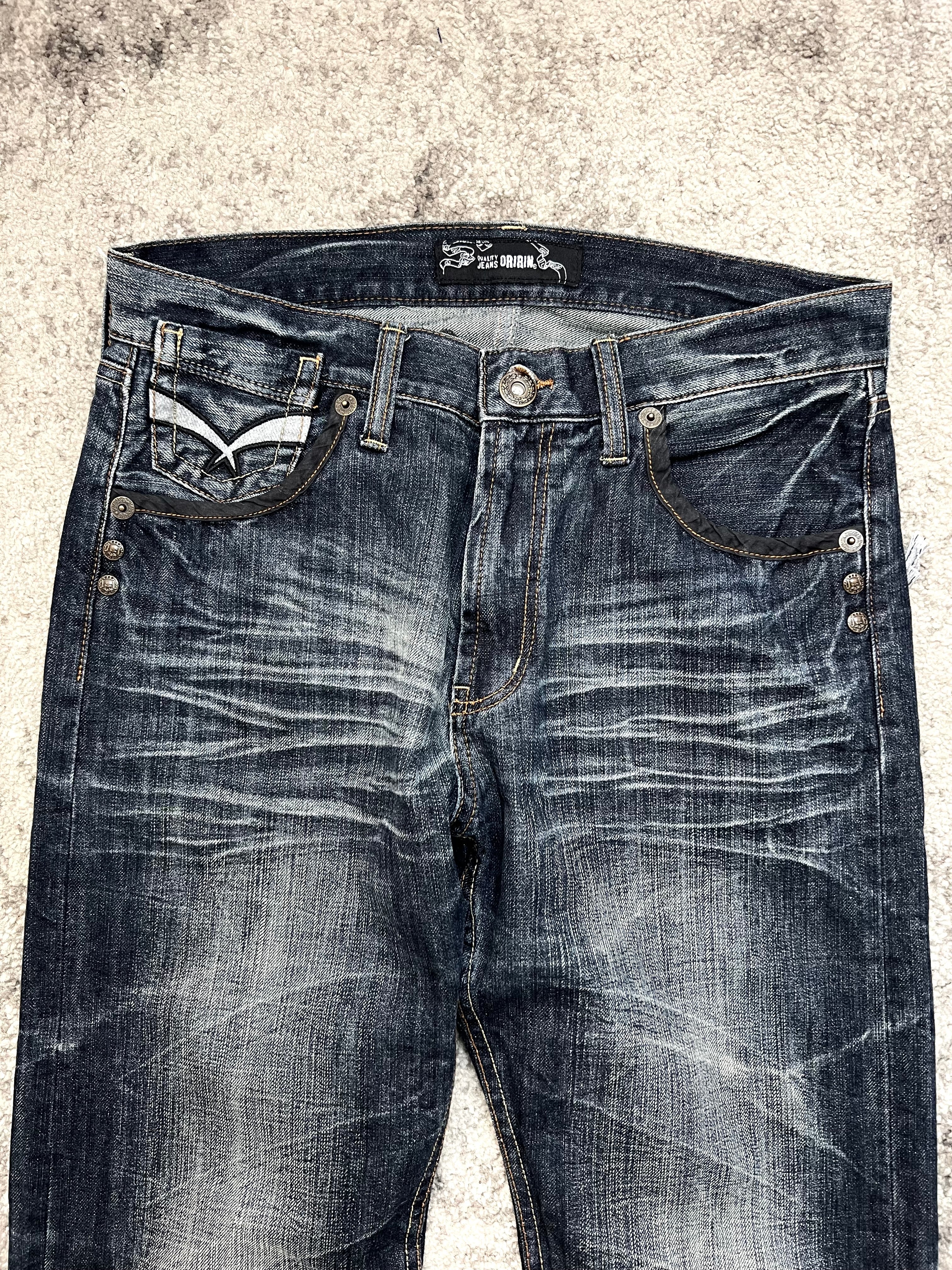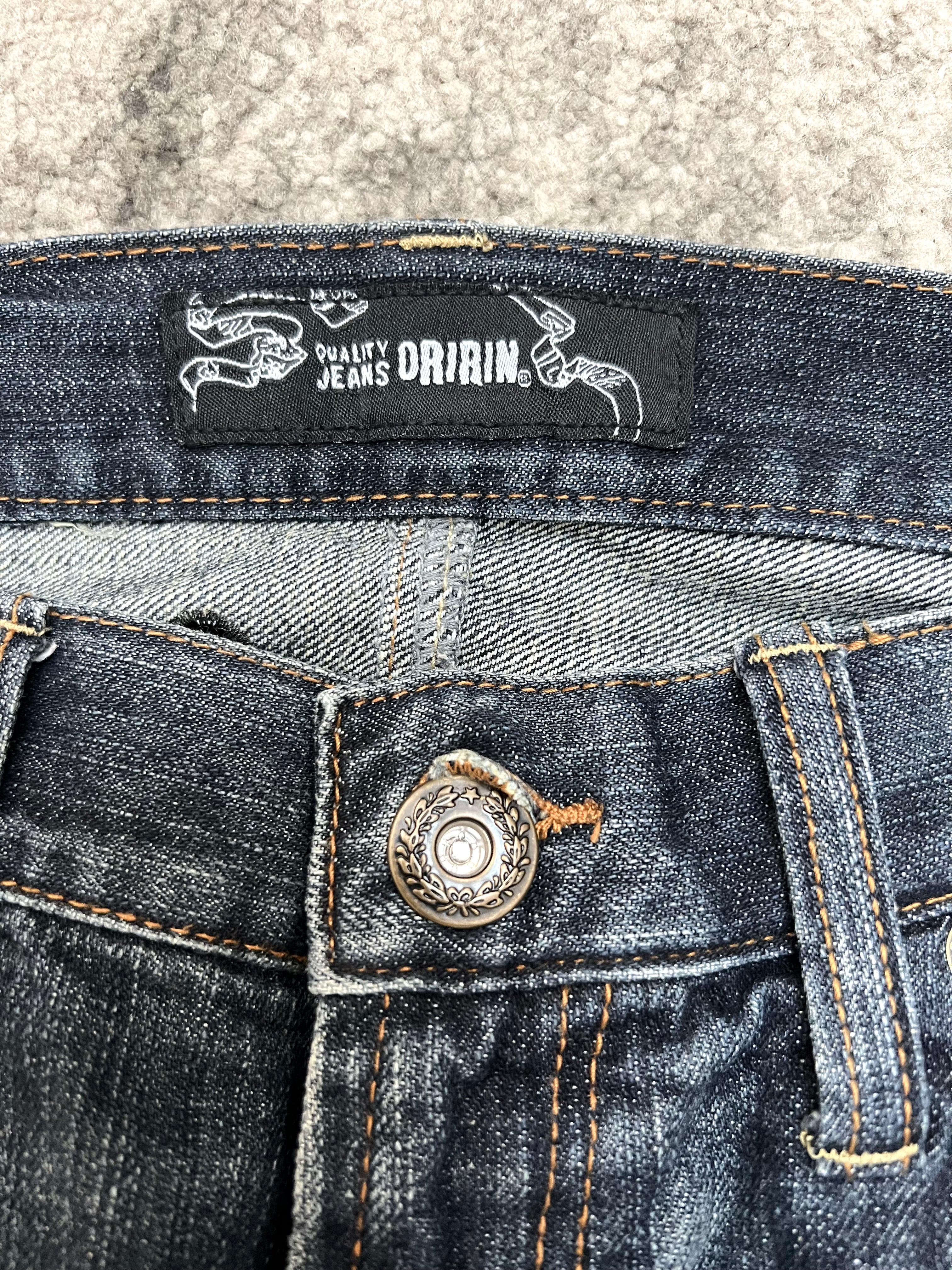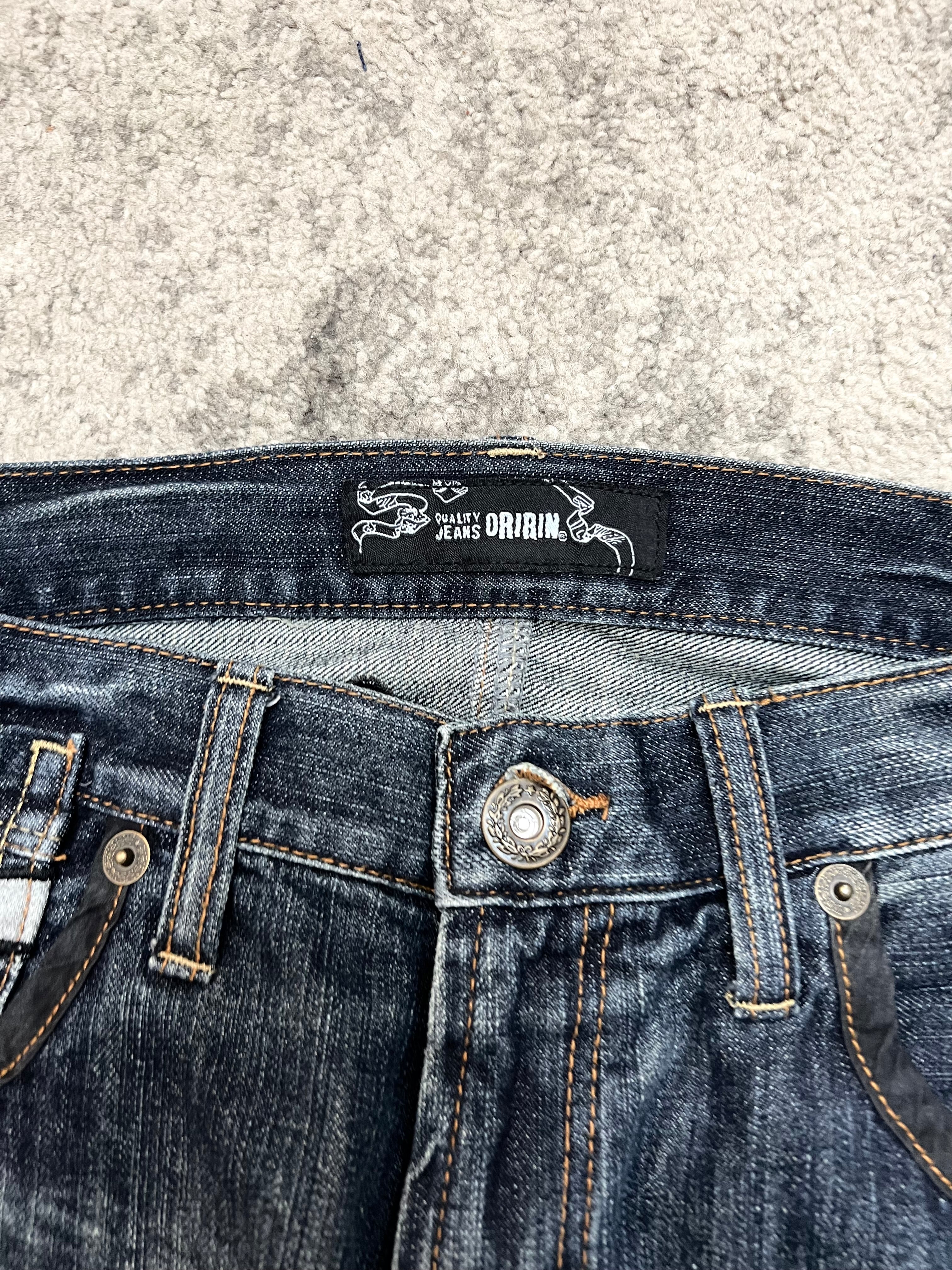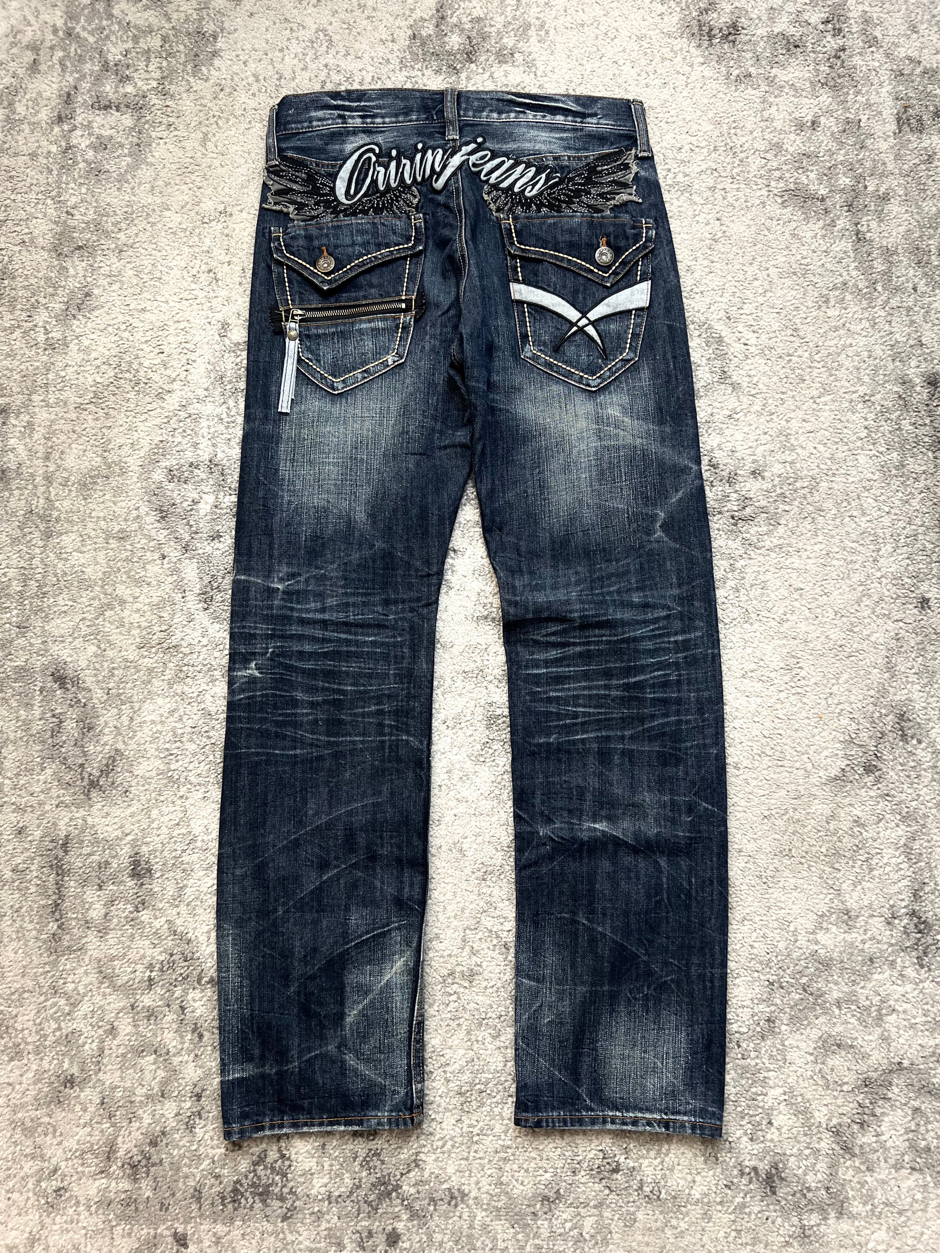 Embroidered “Oririn Jeans” branding across rear waistband