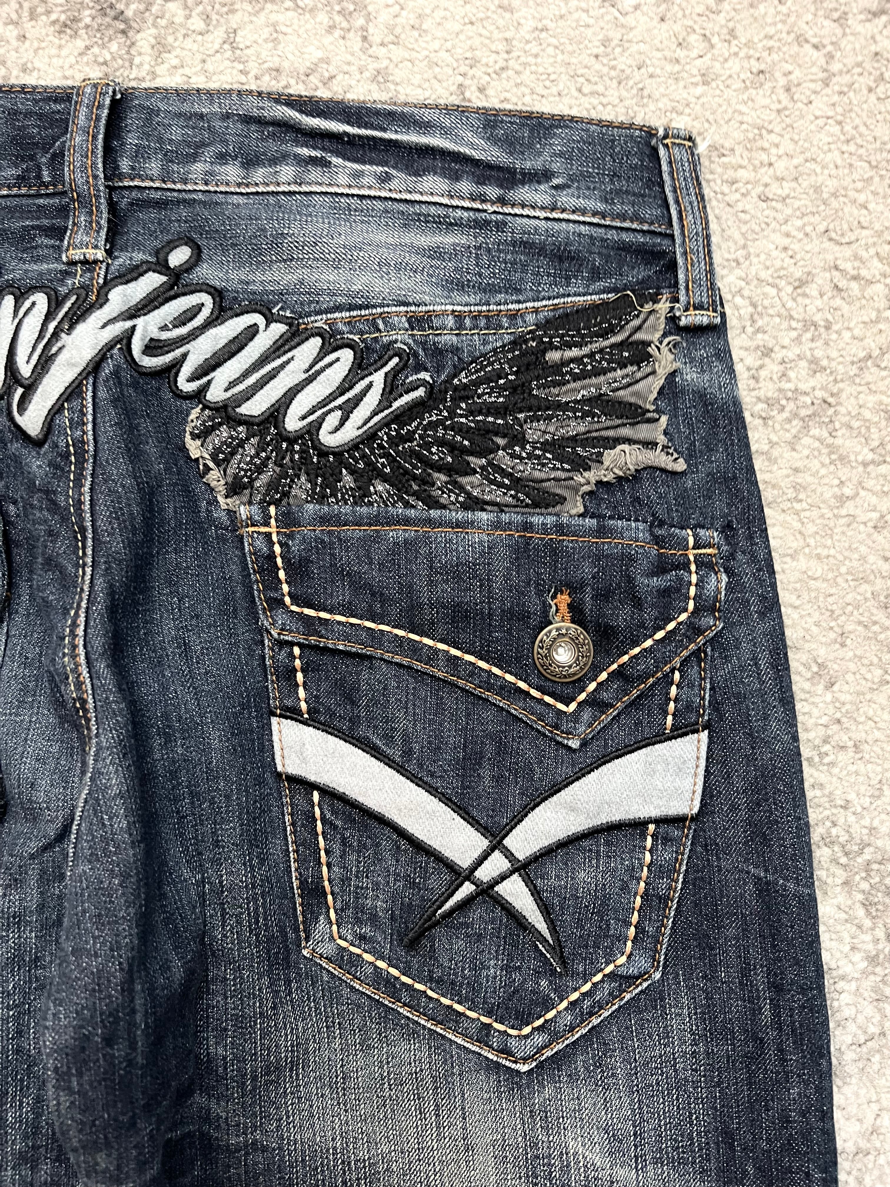 Mid-rise, straight fit with moderate stack and a slight taper. Aggressive thigh beard fades, uniform abrasion mapping, and tailored knee breaks. Backside with embroidered wings and dual flap-pocket detailing — part biker, part prophecy.