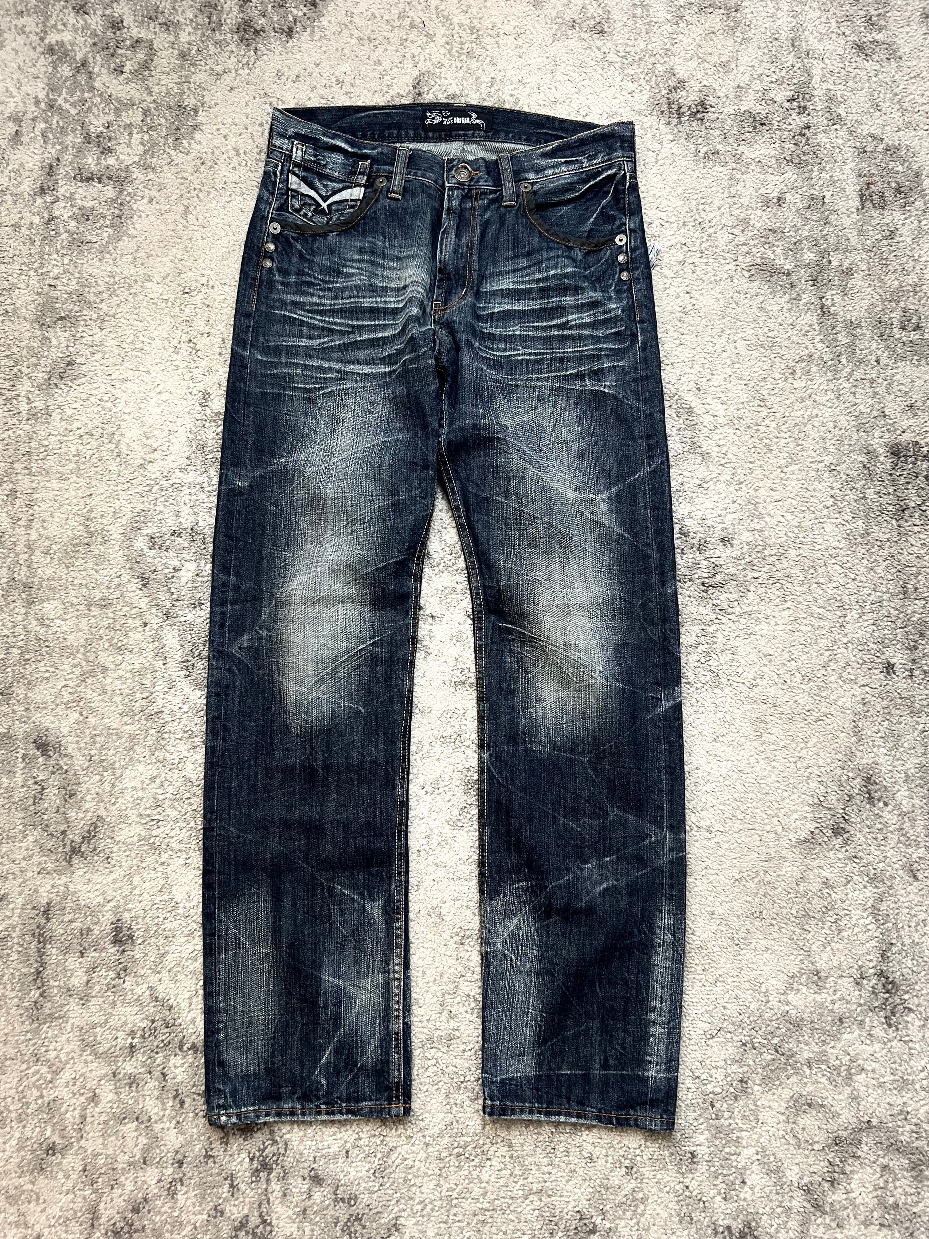 An artifact of chaos and control. ORIRIN’s signature pair pushes classic Americana into celestial territory — scorched fades, high-contrast creasing, and a rear embroidery hit that reads like gospel. These jeans don’t just reference archives — they write their own scripture.