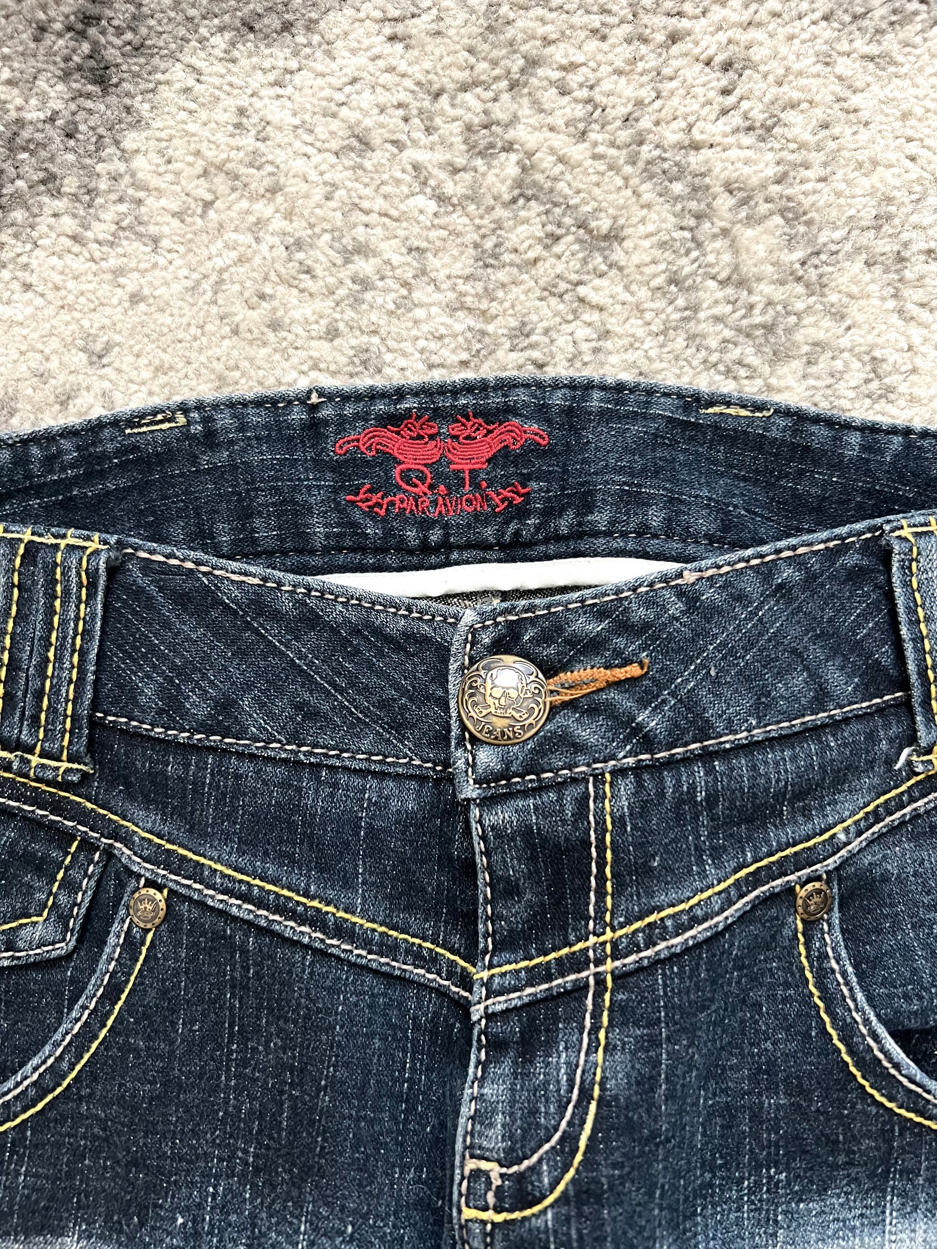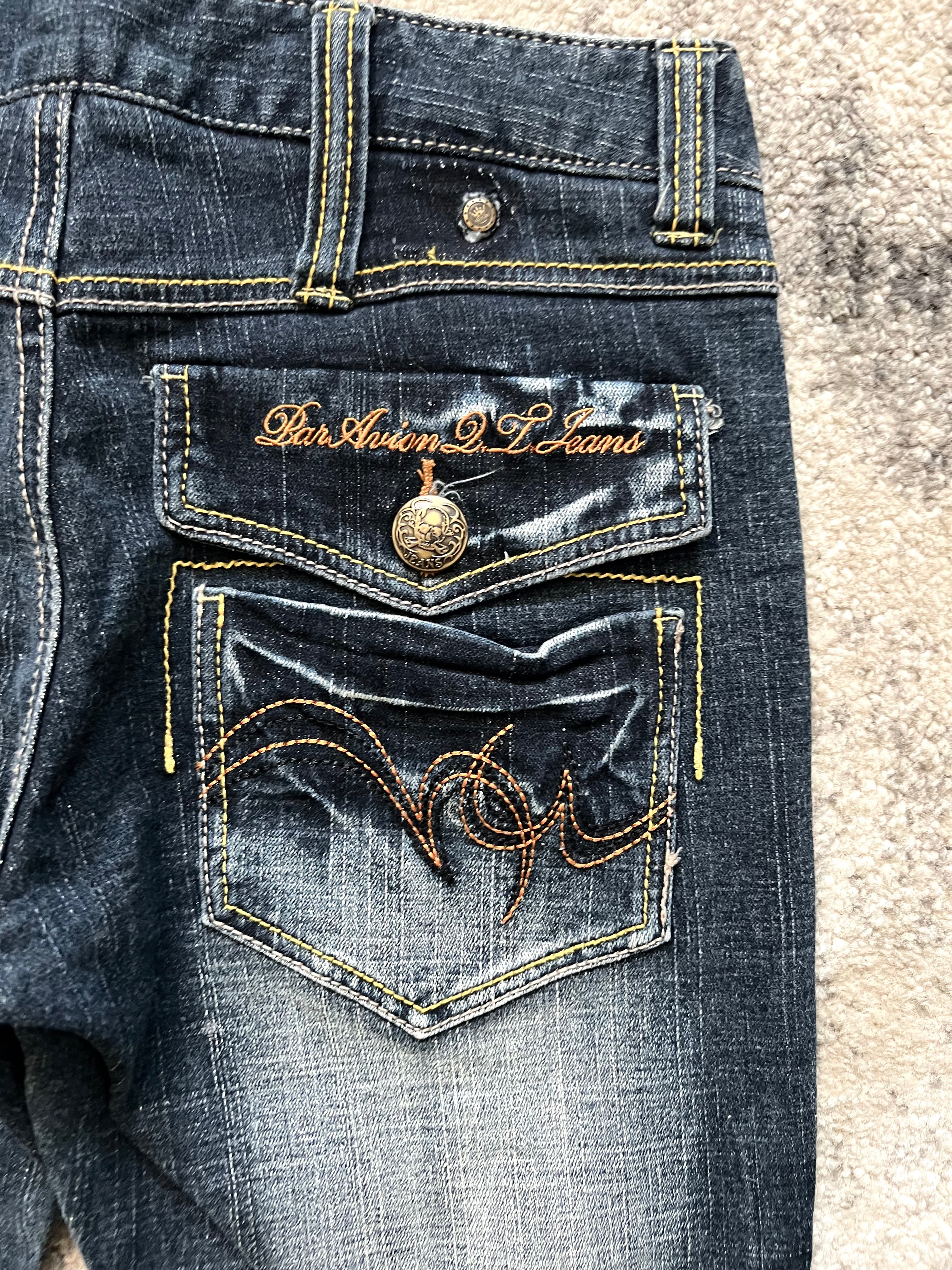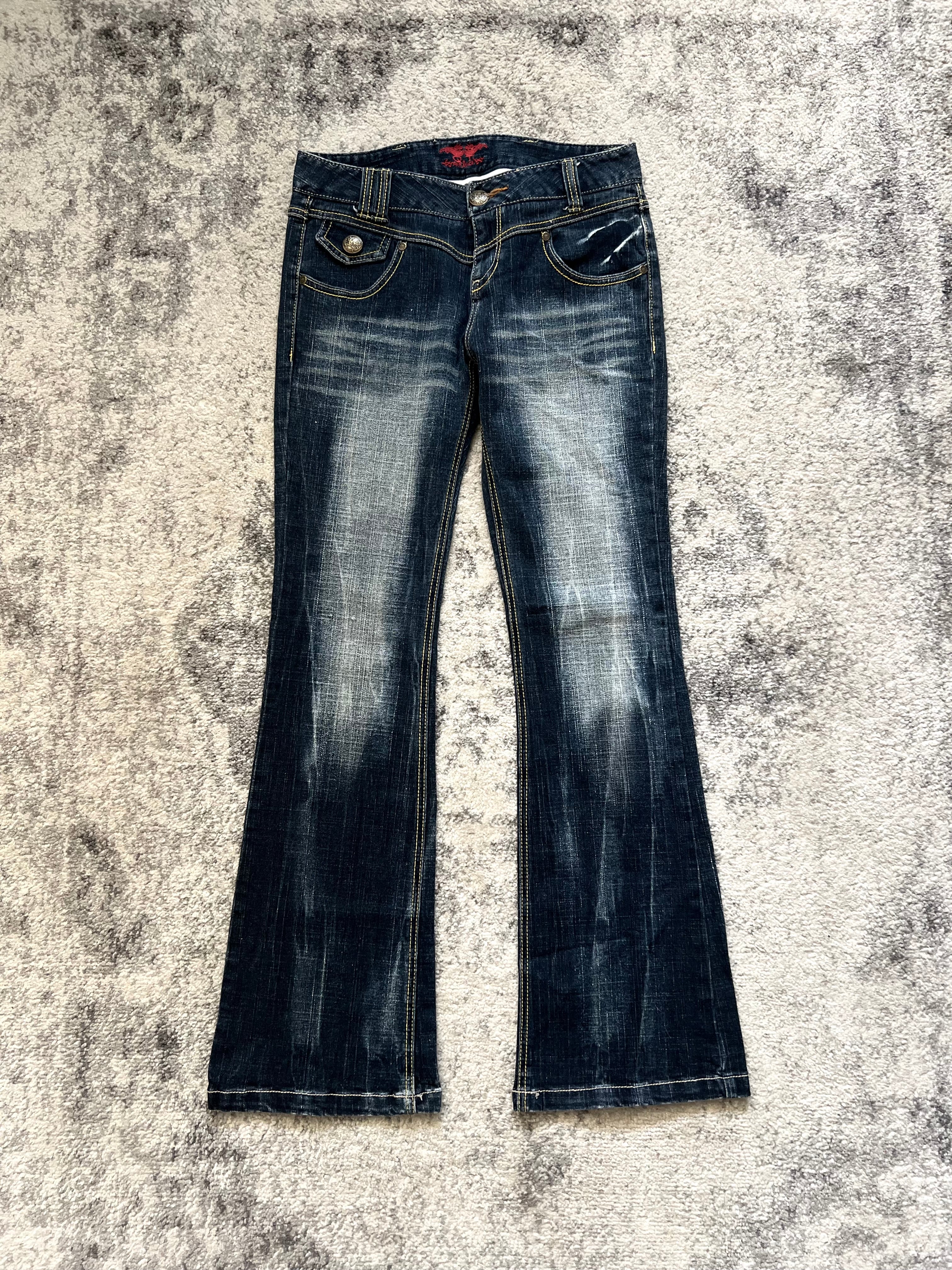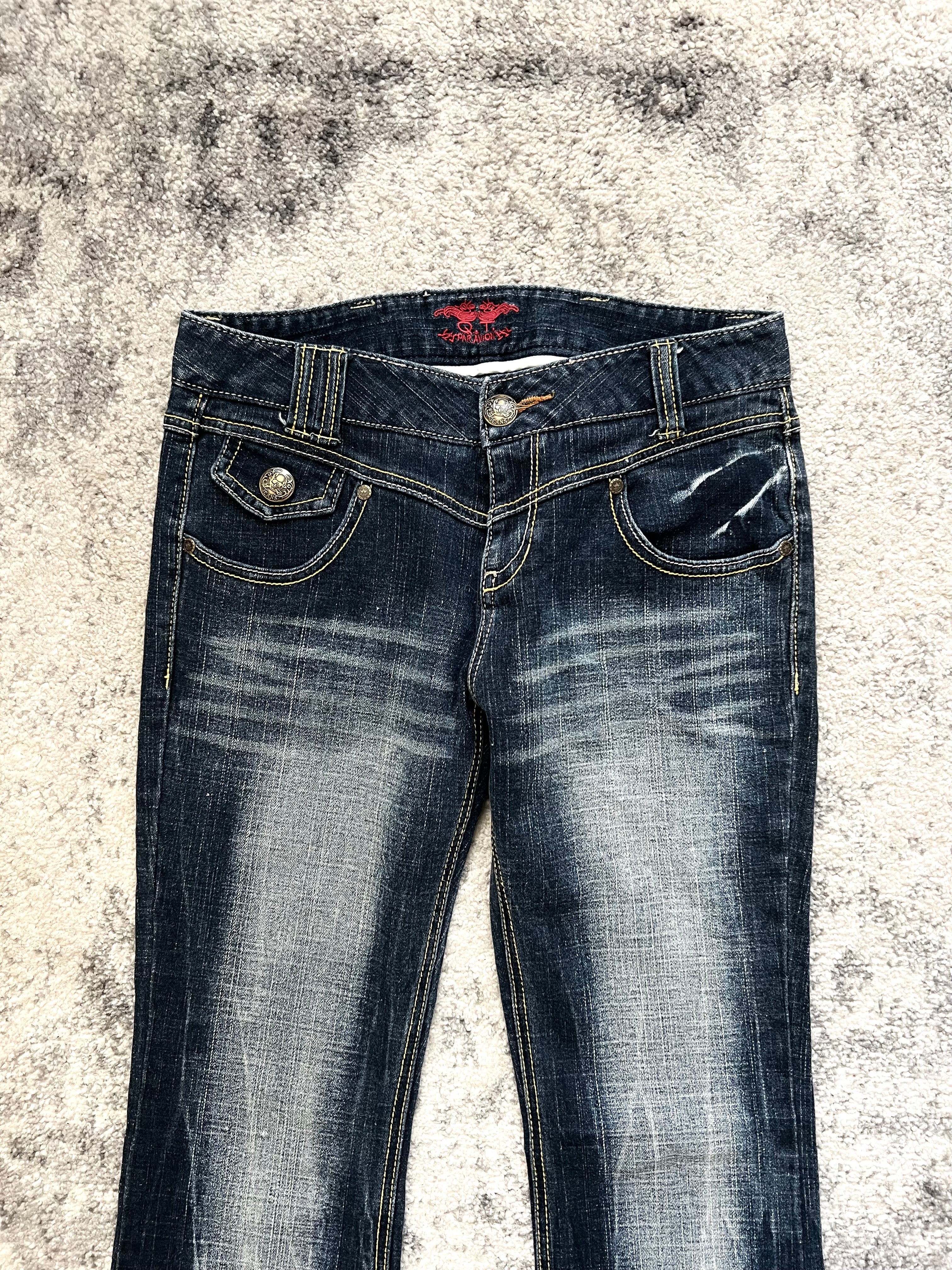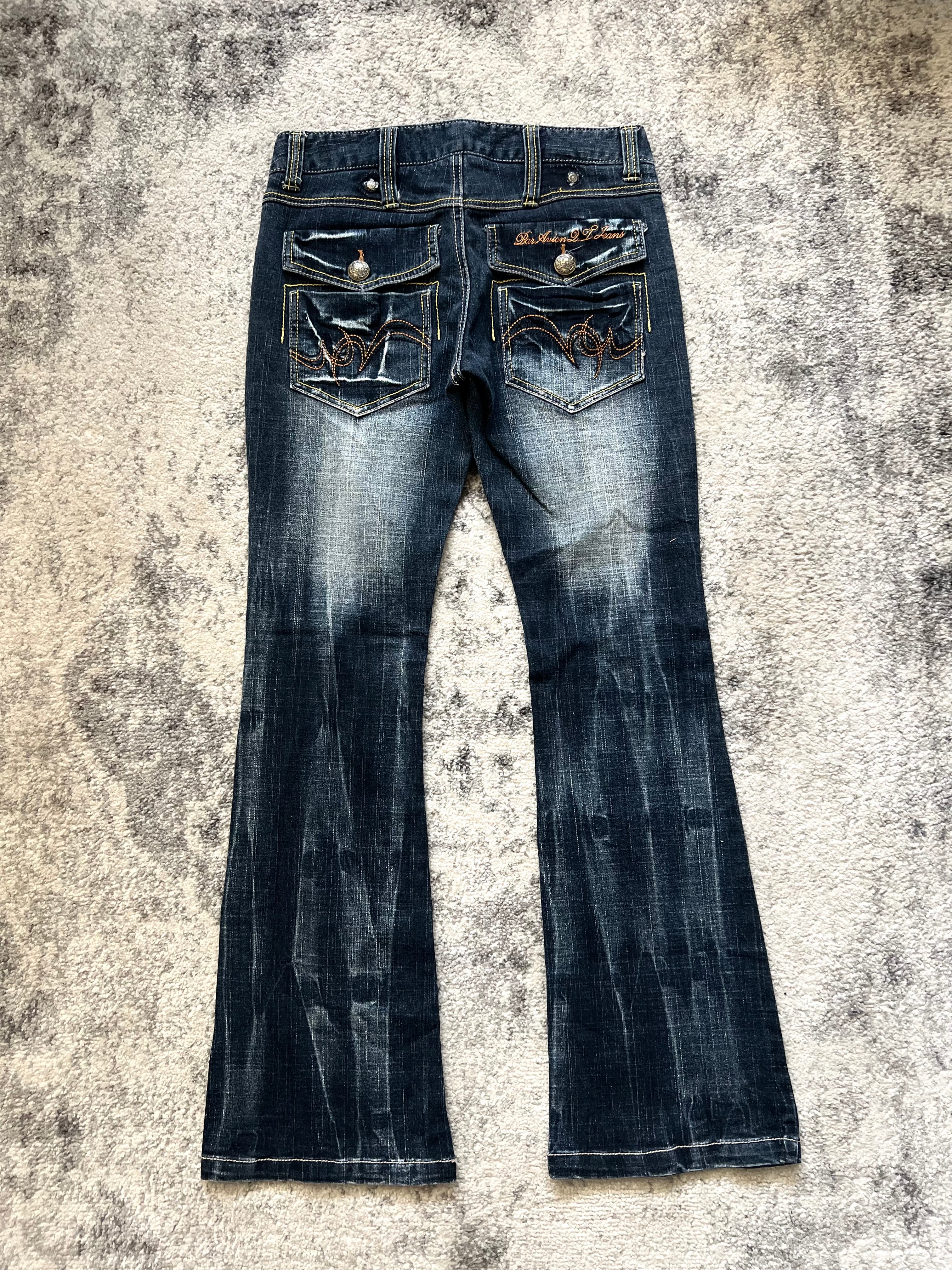 These Paravion jeans channel peak 2000s glam rock with a distinctly Tokyo edge — high-contrast fading, sculpted bootcut silhouette, and flashy gold-accented details that scream hostcore icon.