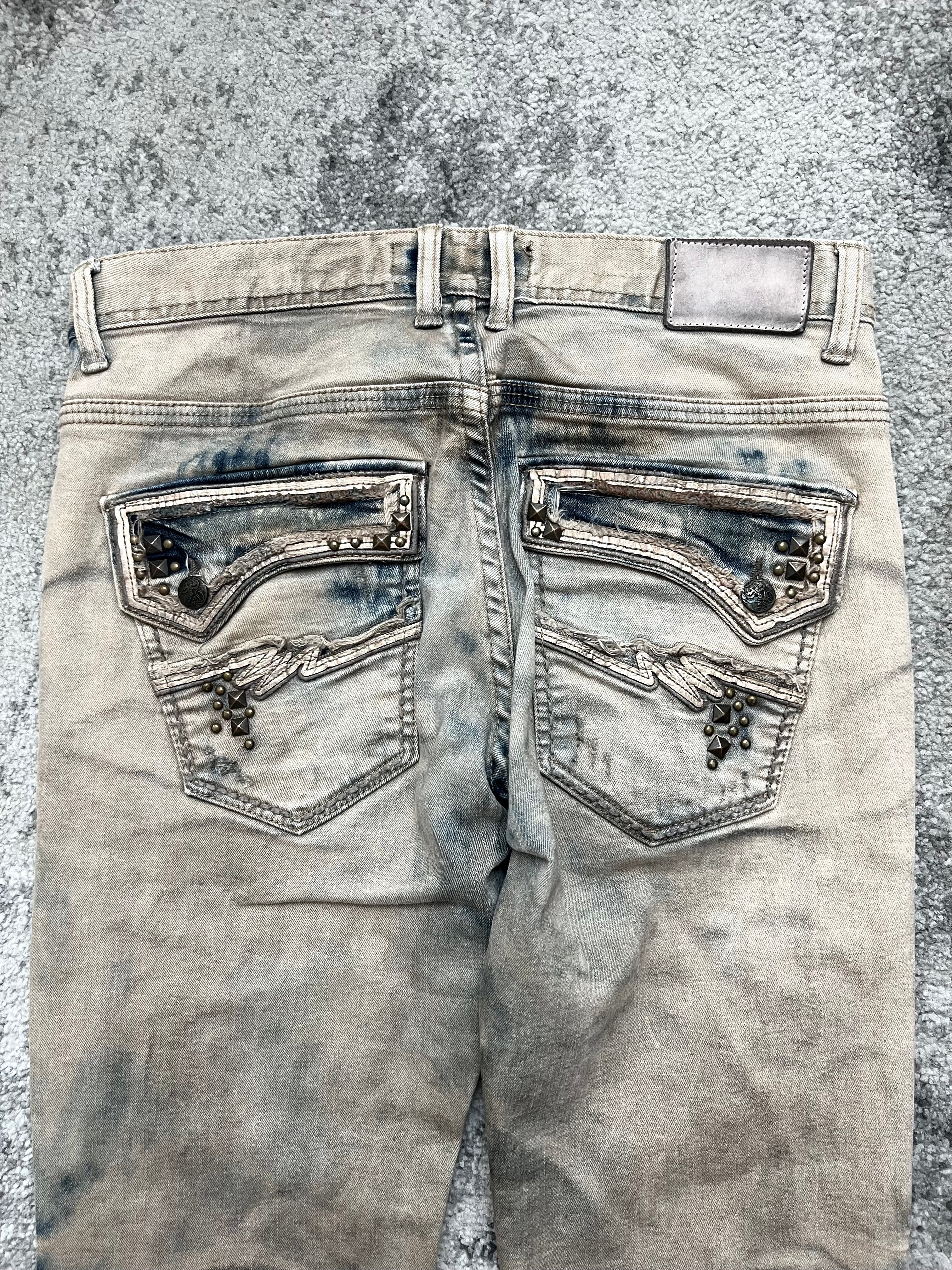 Pre-owned, naturally broken in. Bleach-washed with tonal indigo patches. Light abrasions, no holes. Soft wear along cuffs and creases — honest aging with quiet edge.
