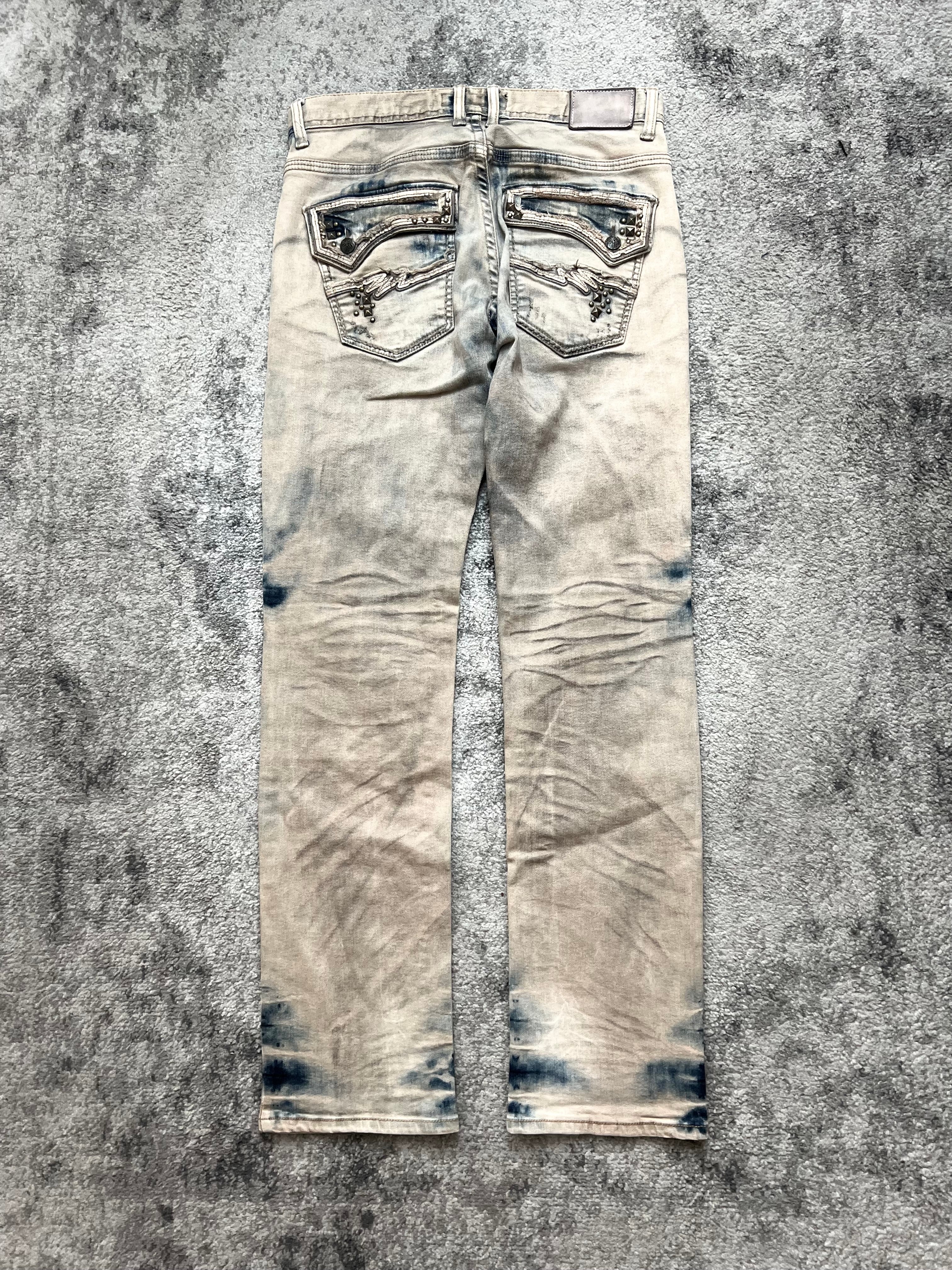 Slim-straight silhouette with slight taper. Contrast whiskering and thigh fade, heavy stack marks near hem. Studded pocket accents nod to punk — restrained but present.
