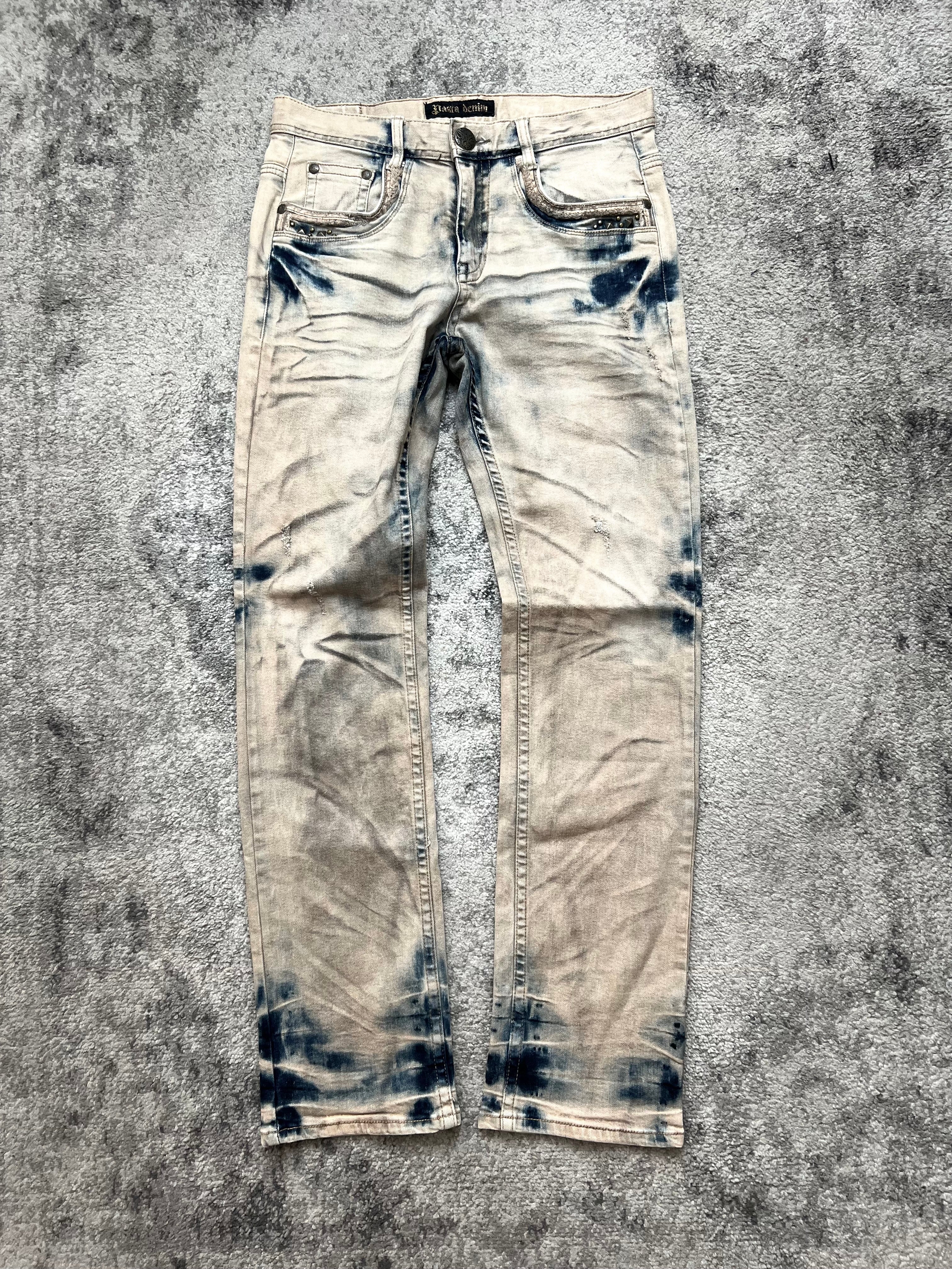 A pair that feels like denim dragged through a midnight tide — rinsed in salt, stained by moonlight. The bleach spots don’t shout; they whisper something forgotten. Faint studs peek from pocket seams, like rusted signals from a faded scene.