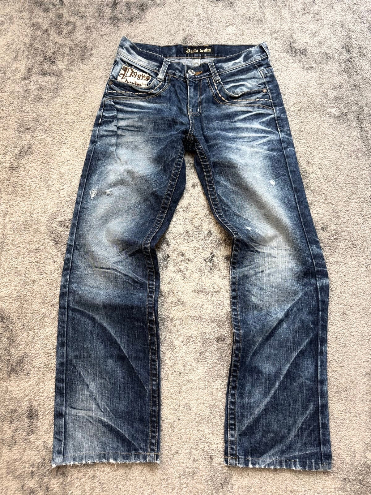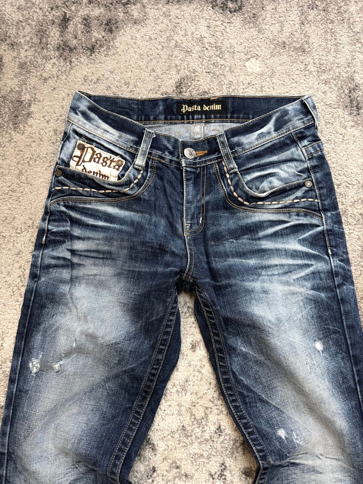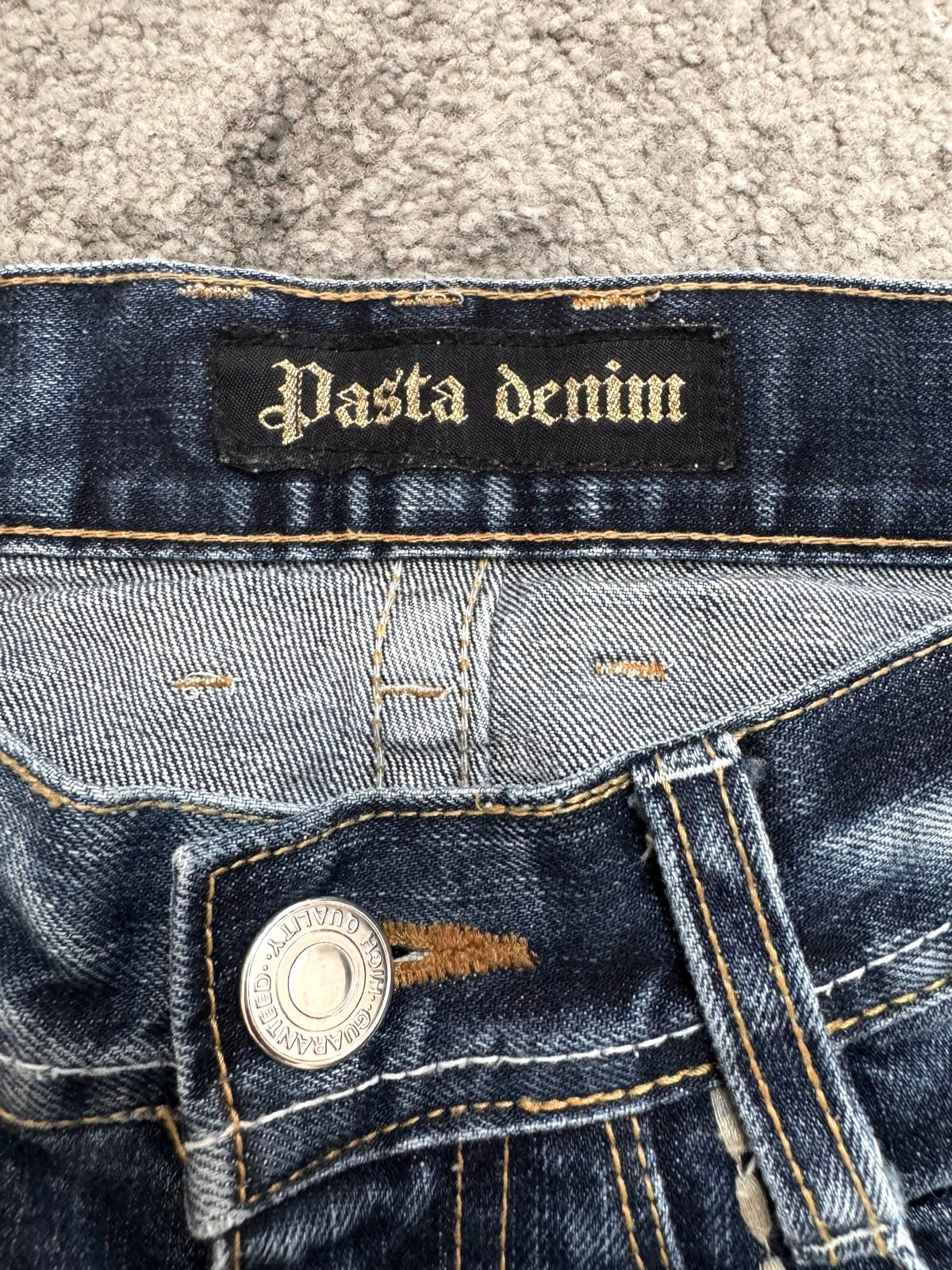 A rare piece from PASTA DENIM’s wilder era — washed-down indigo with heavy fading, contrasted by ornate, almost gothic back pocket embroidery. A balance of raw denim energy and maximalist Japanese detailing, carrying that unmistakable archive spirit.