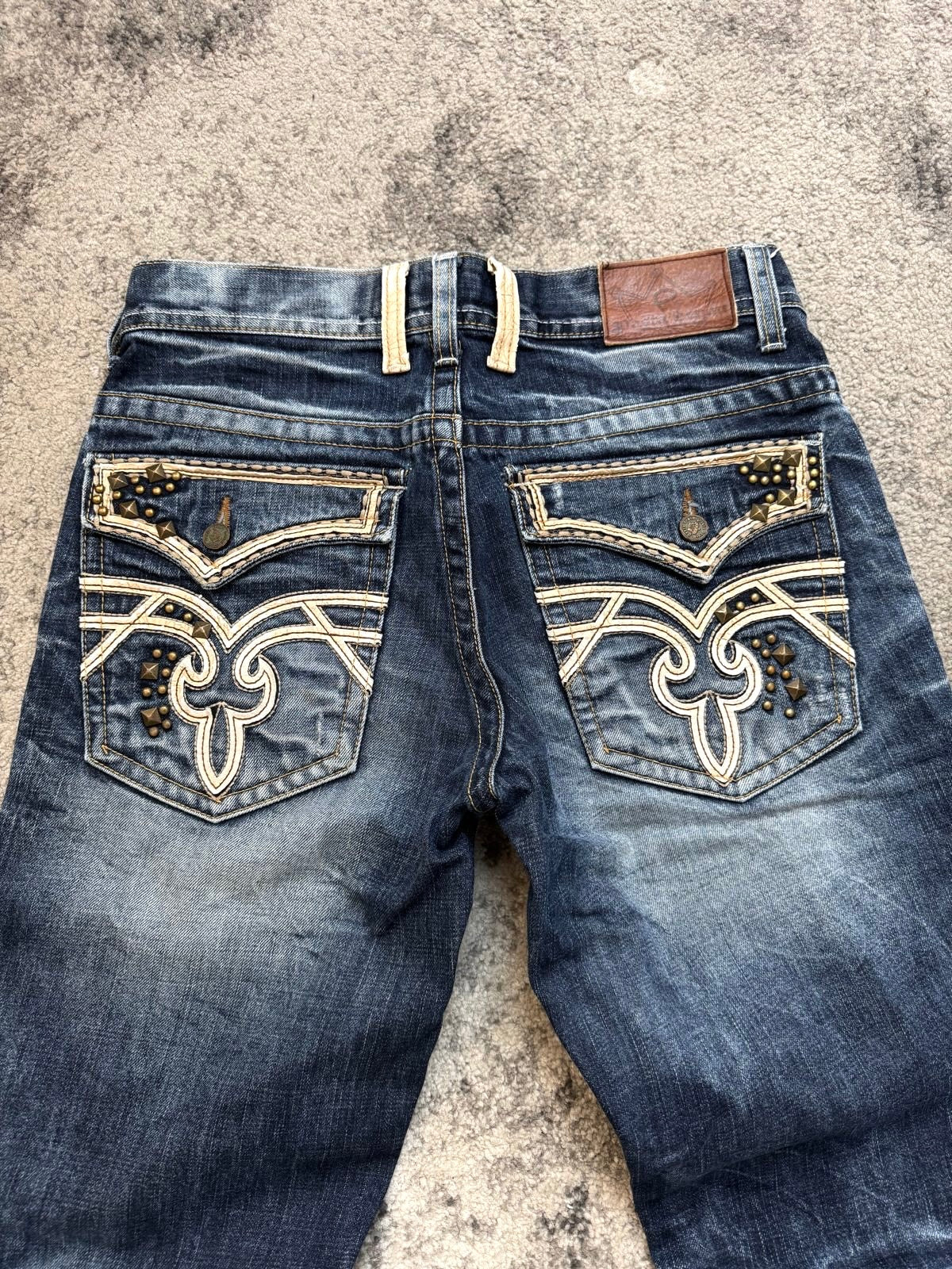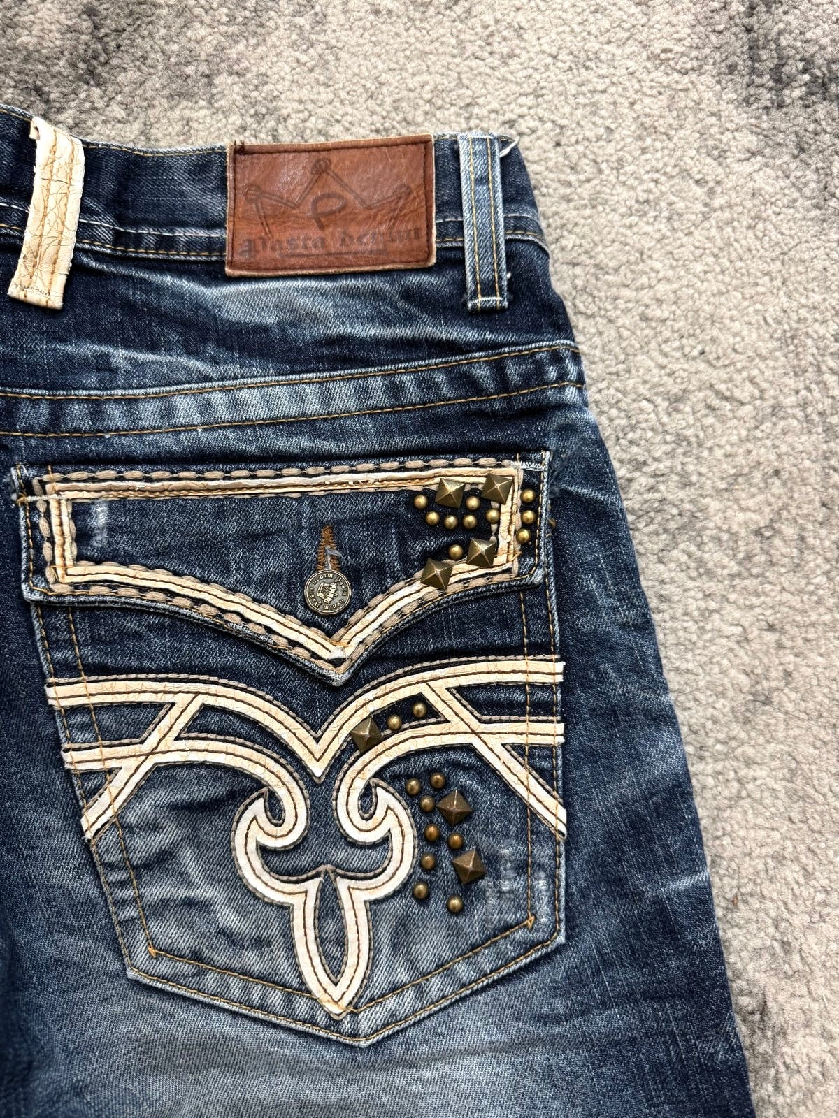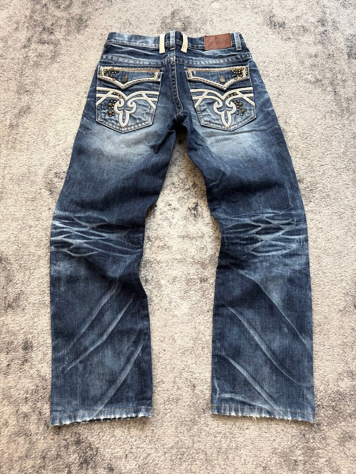 A rare piece from PASTA DENIM’s wilder era — washed-down indigo with heavy fading, contrasted by ornate, almost gothic back pocket embroidery. A balance of raw denim energy and maximalist Japanese detailing, carrying that unmistakable archive spirit.
