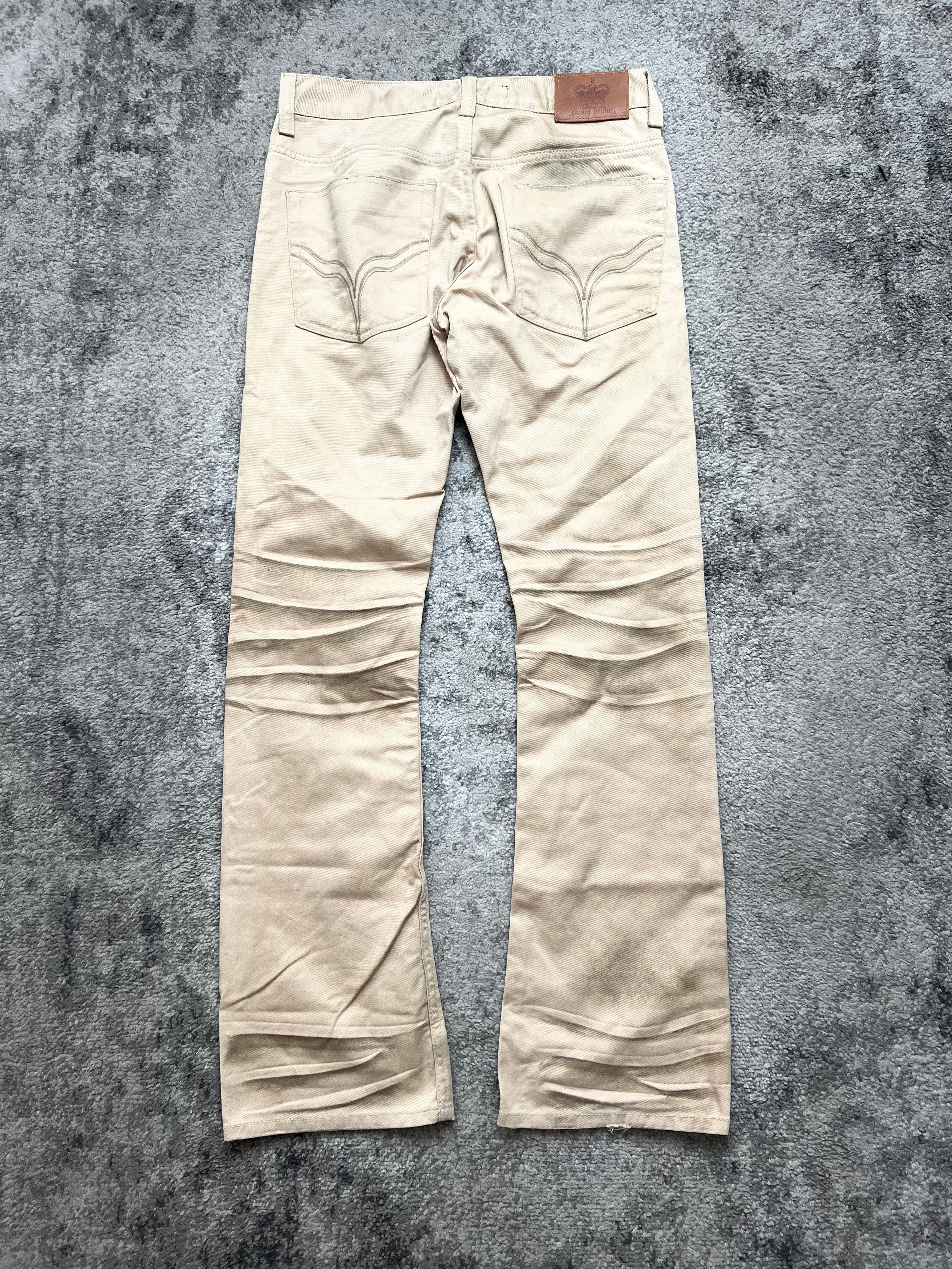 A calm disruption. Bleached dust-toned denim with baked-in creases and soft tonal fades — like sunlight smudged across pale concrete. A pair that doesn't shout but leaves a memory.