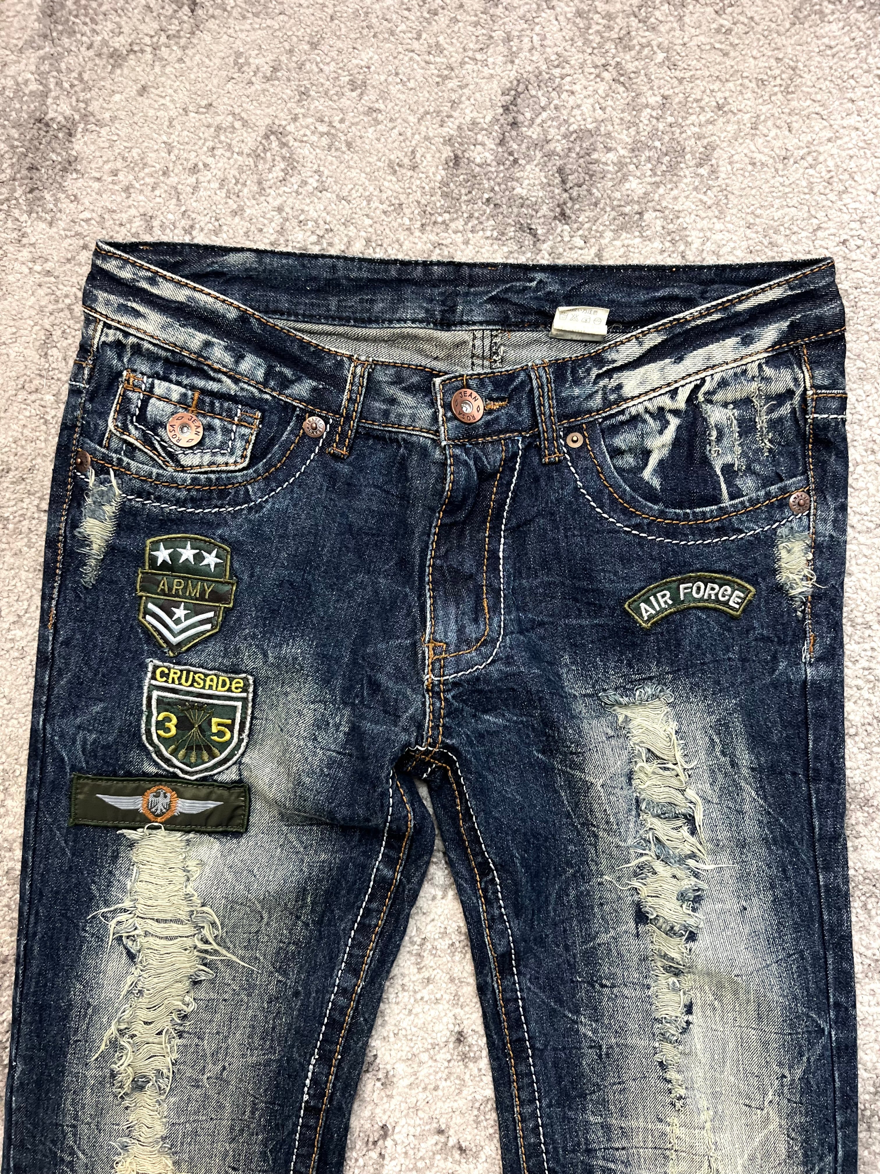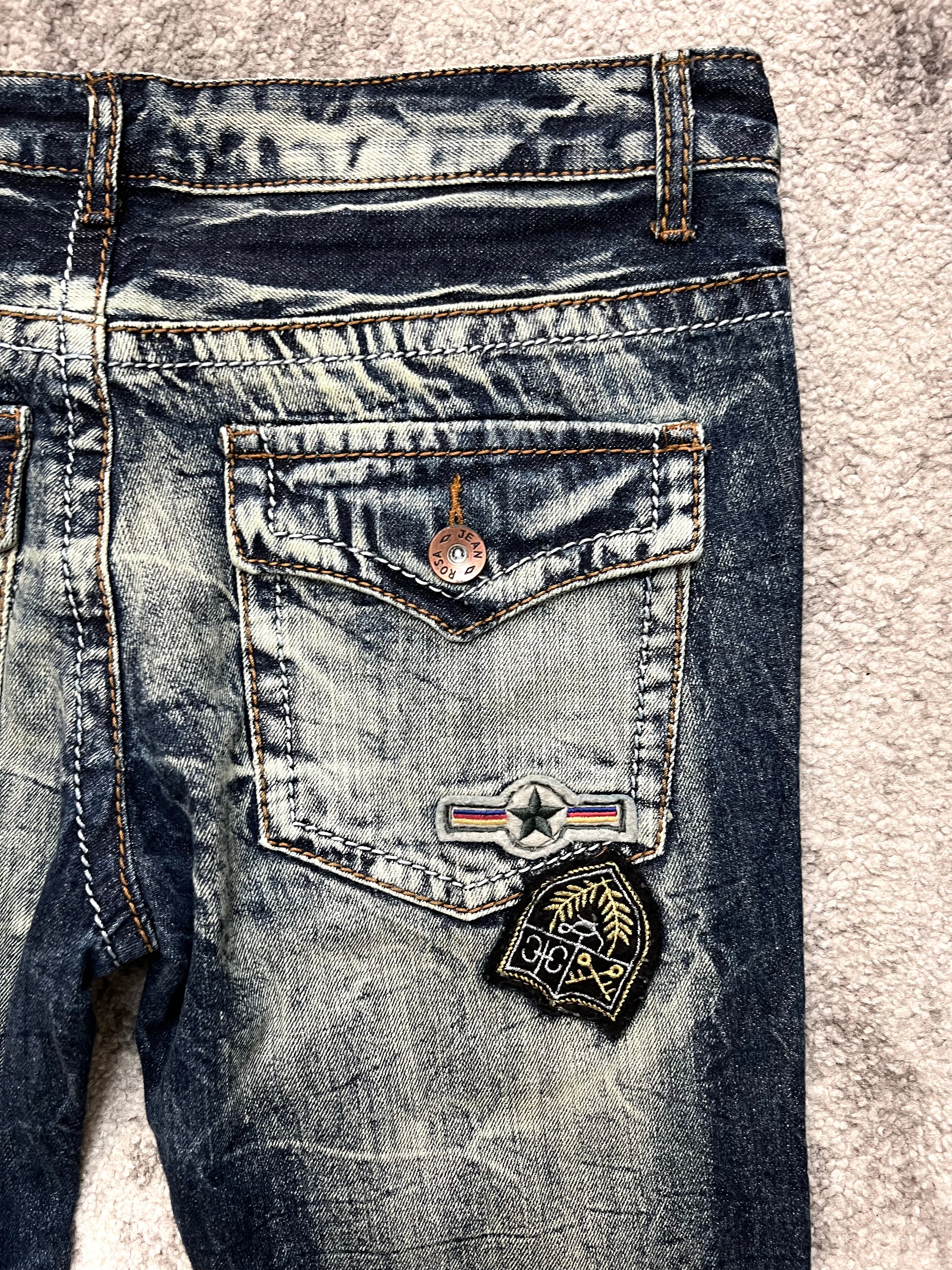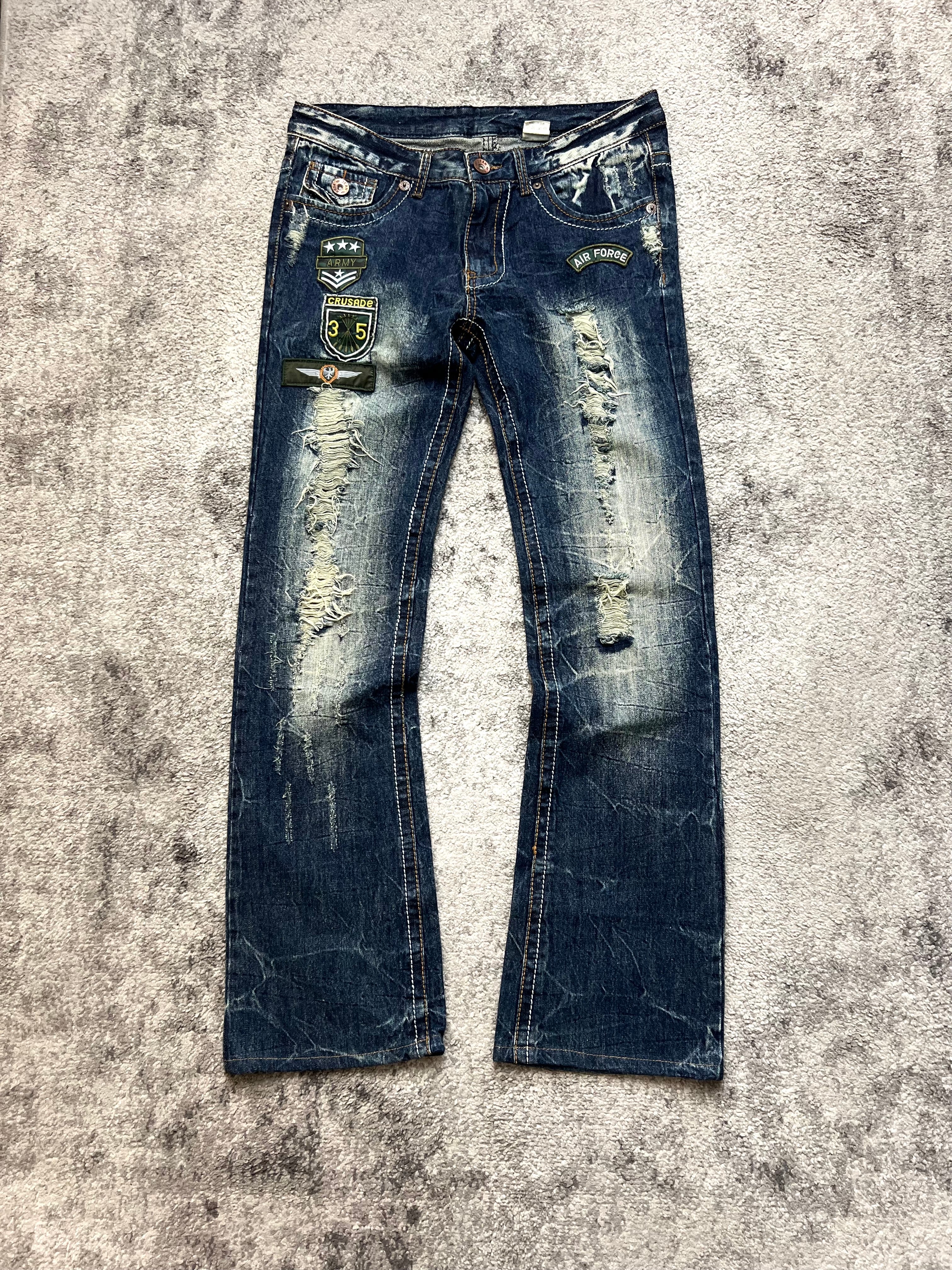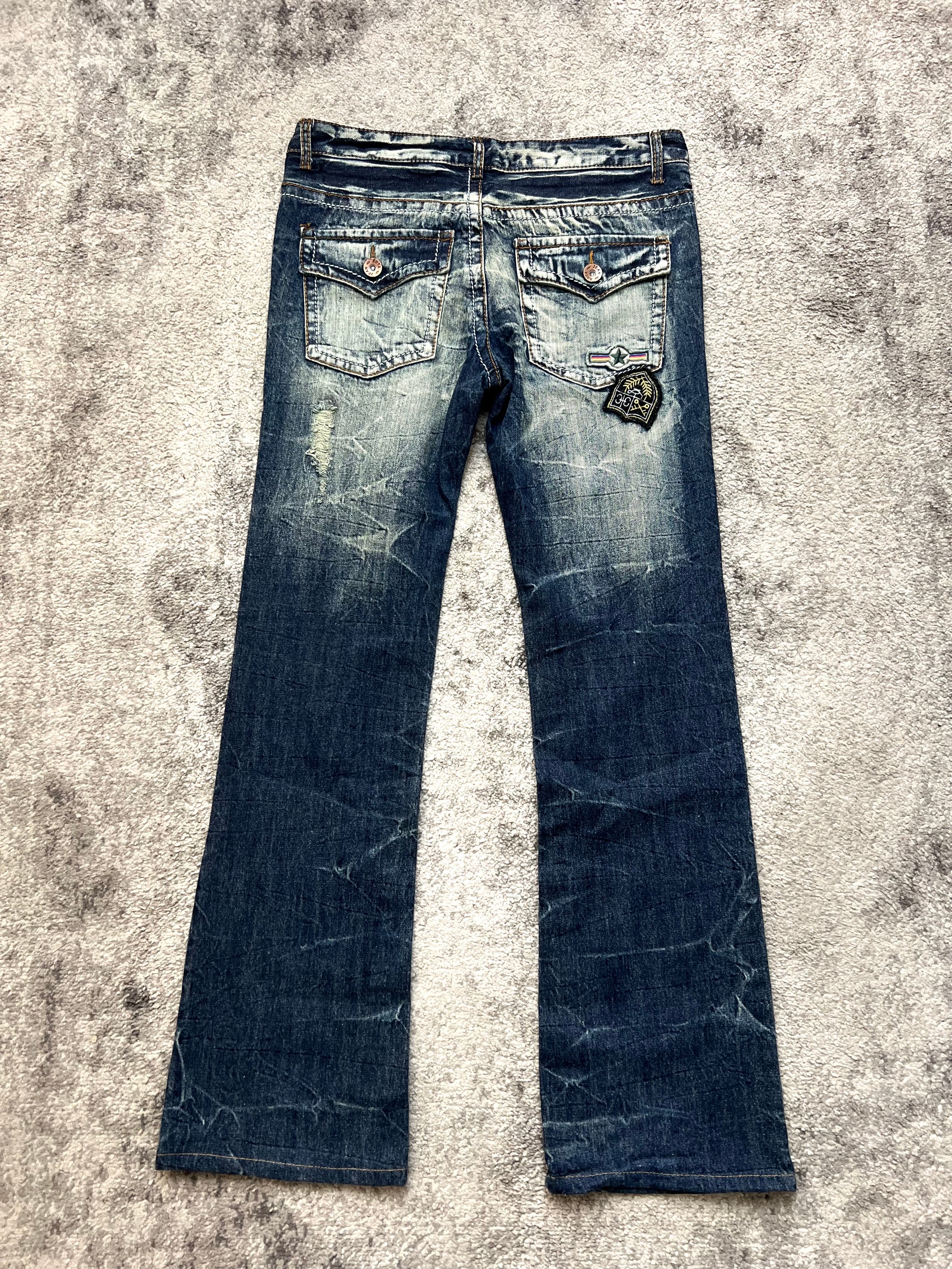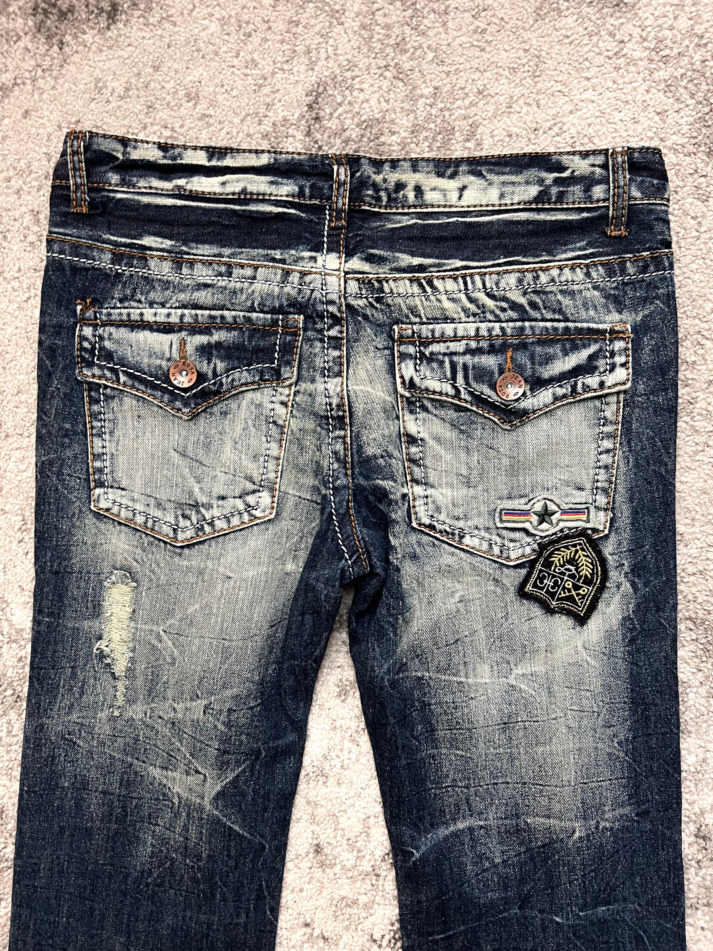 Japanese archive energy at its finest – a true standout from HEISEI. These jeans are cut from rugged indigo denim, heavily washed and distressed with a lived-in, battle-scarred character. Military-inspired patches, frayed edges, and sun-faded whiskering give them that unmistakable archival aura, somewhere between rebellion and nostalgia.
