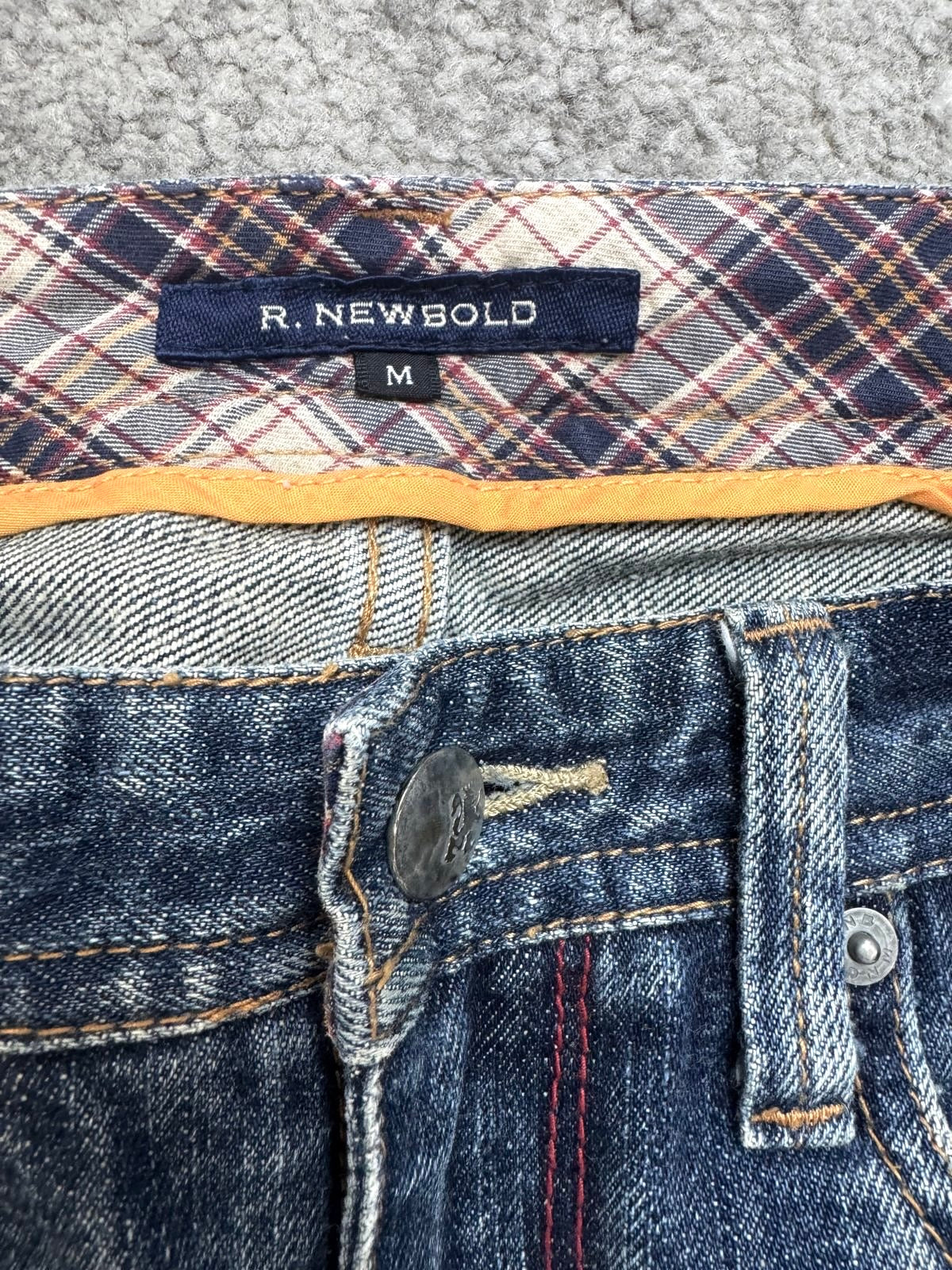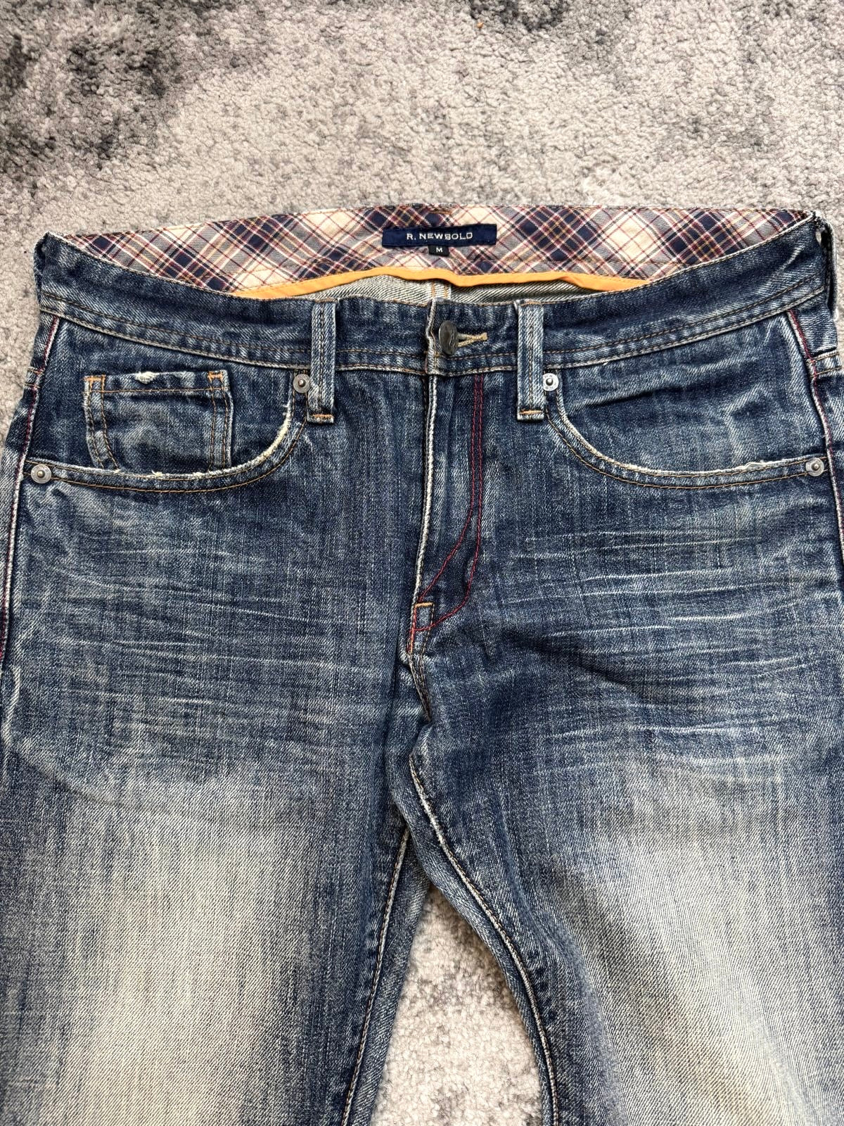 A quiet artifact of Japanese archive energy — these R.NEWBOLD jeans carry a washed-out blue that feels both lived-in and intentional. The fade whispers of years, the structure still strong, the silhouette relaxed yet sharp. Understated rebellion in pure denim form.
