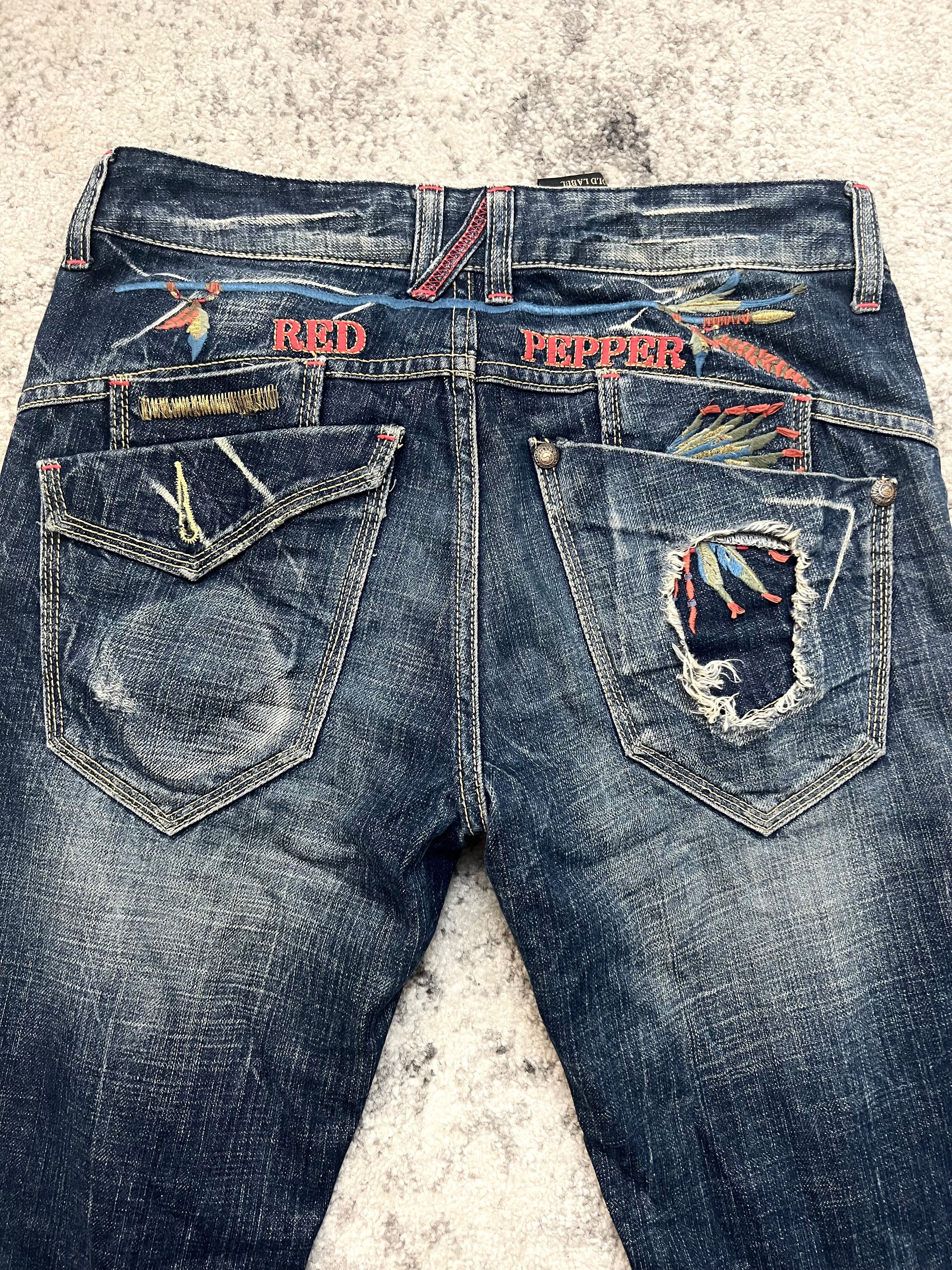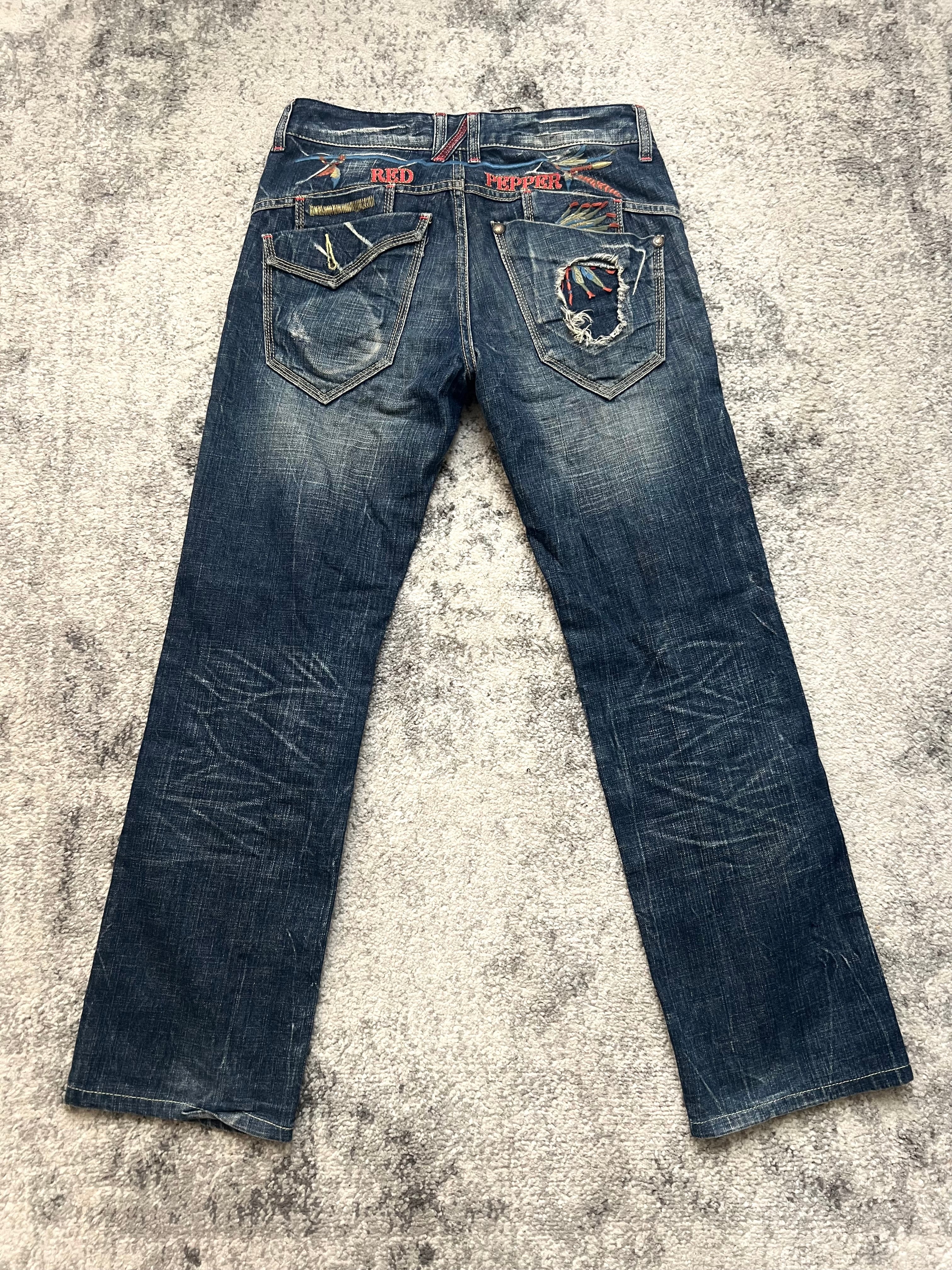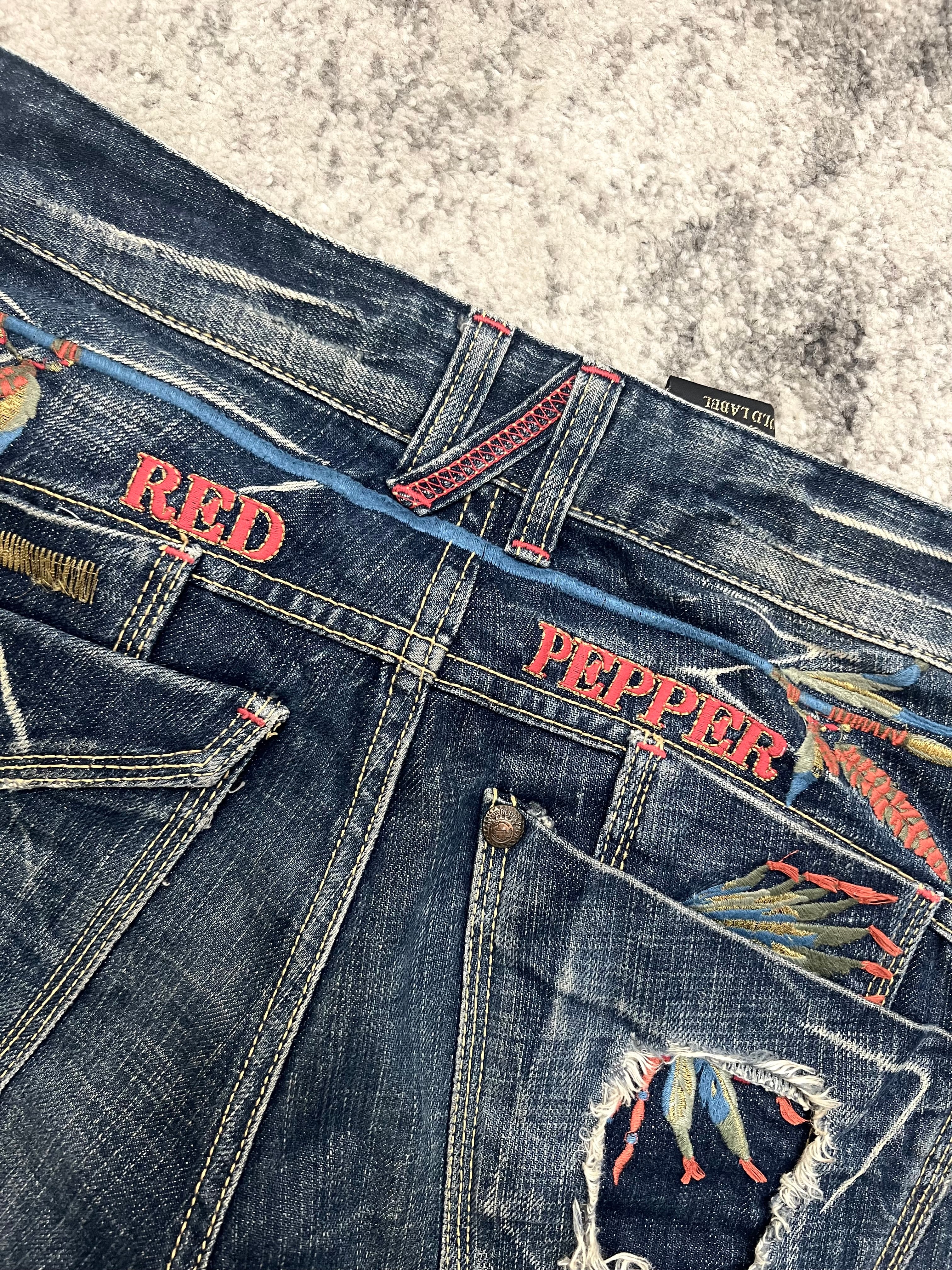 Red Pepper Distressed Embroidered Denim – a loud relic from Japan's maximalist streetwear era, where rebellion was stitched into every seam. The kind of piece you'd spot once on a backstreet in Osaka and never again.